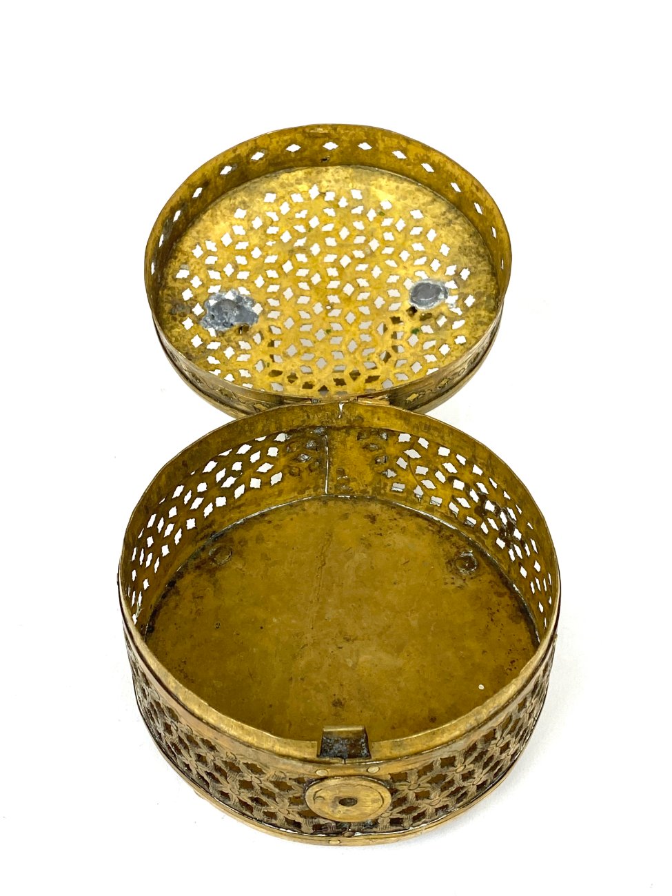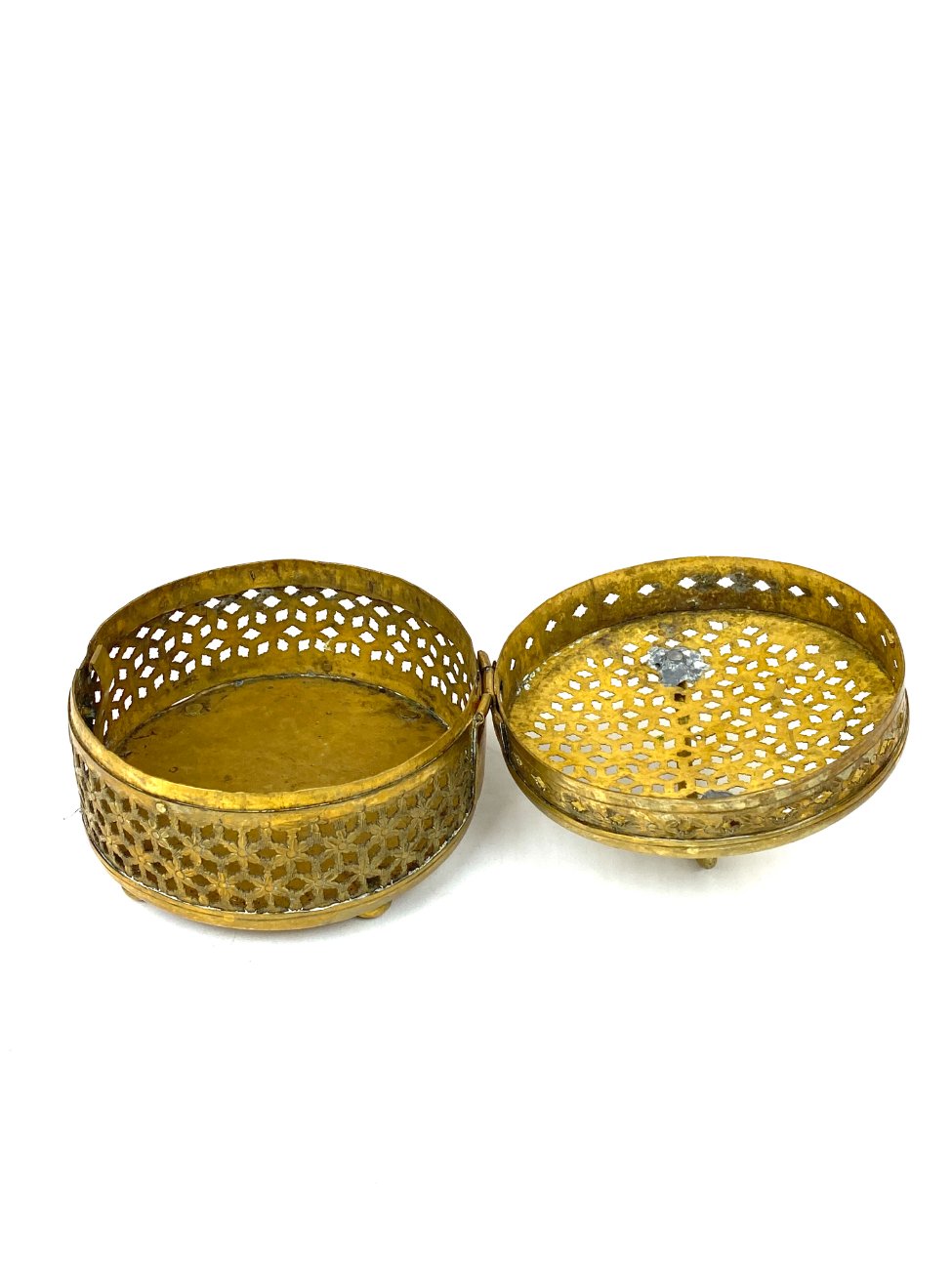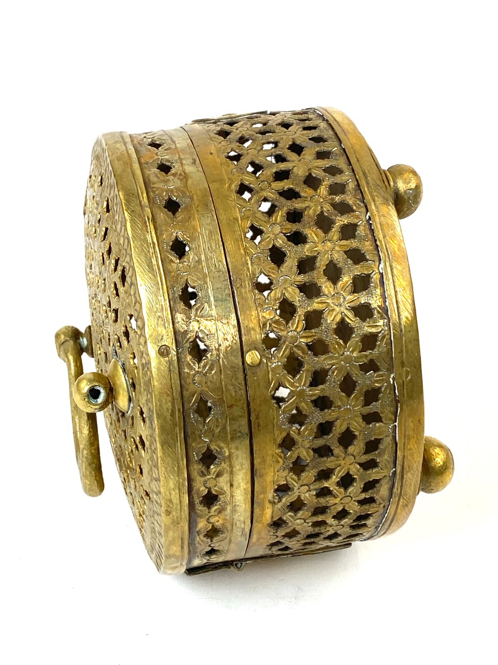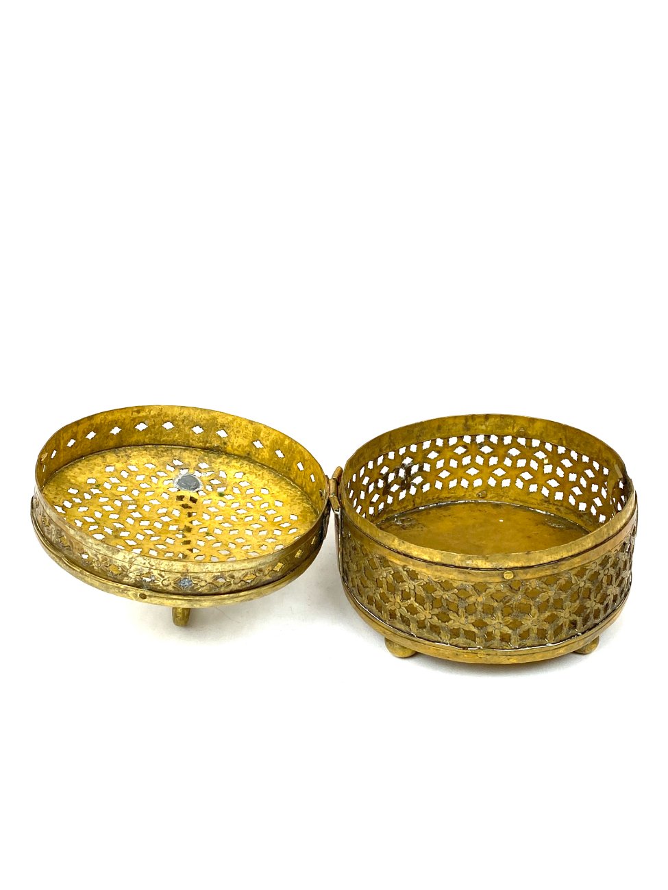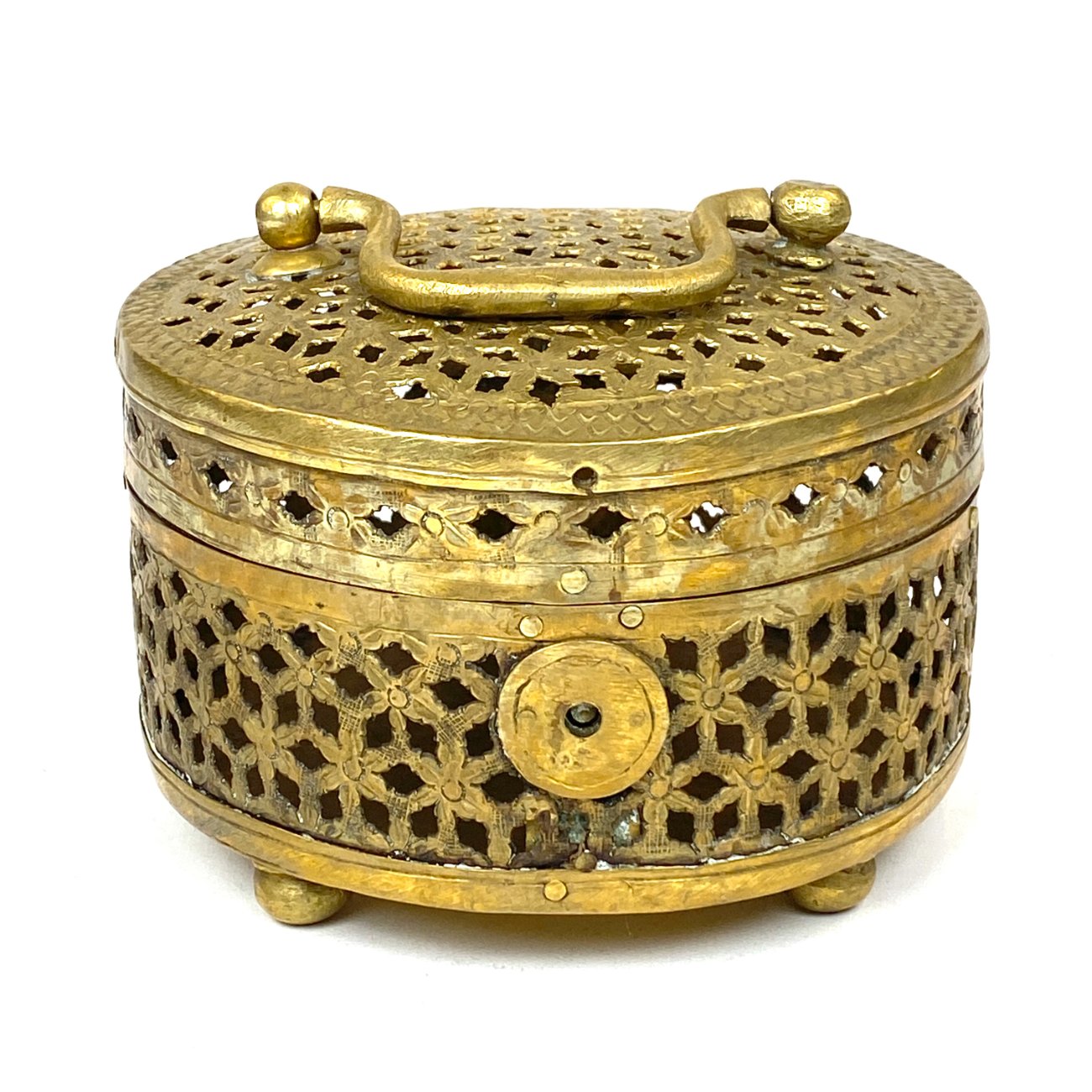 Indiška žalvarinė ažūrinė apvalios formos dėžutė.