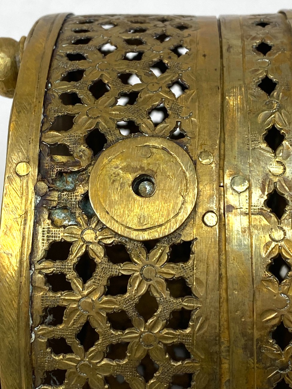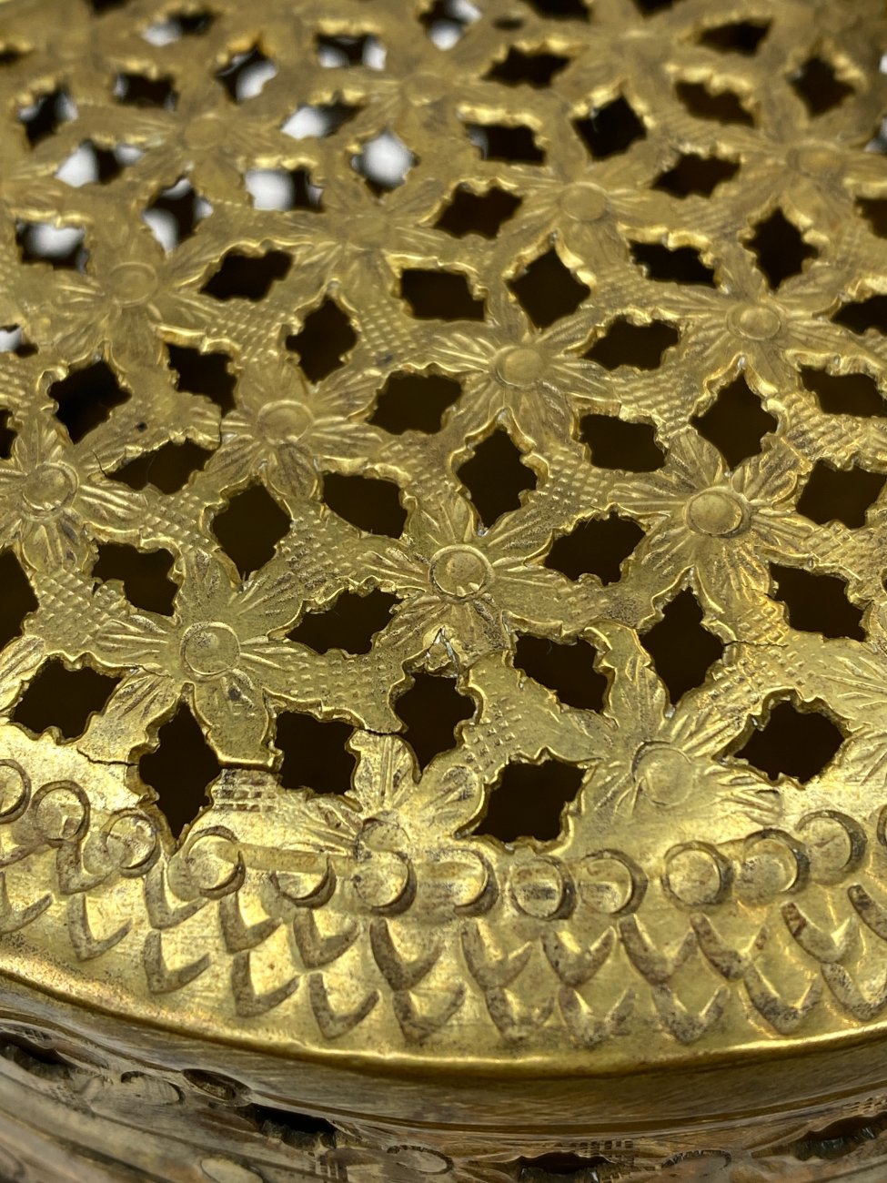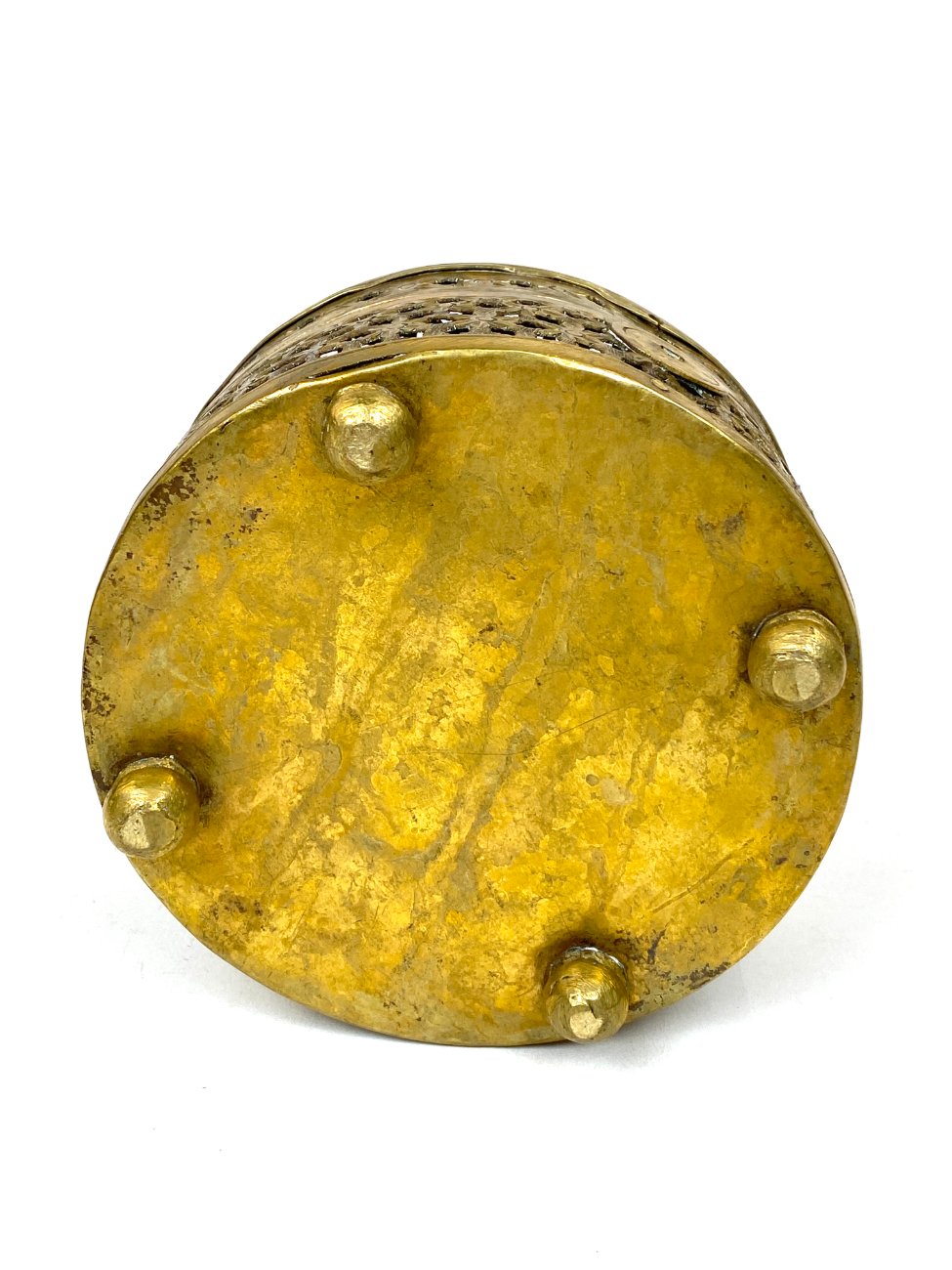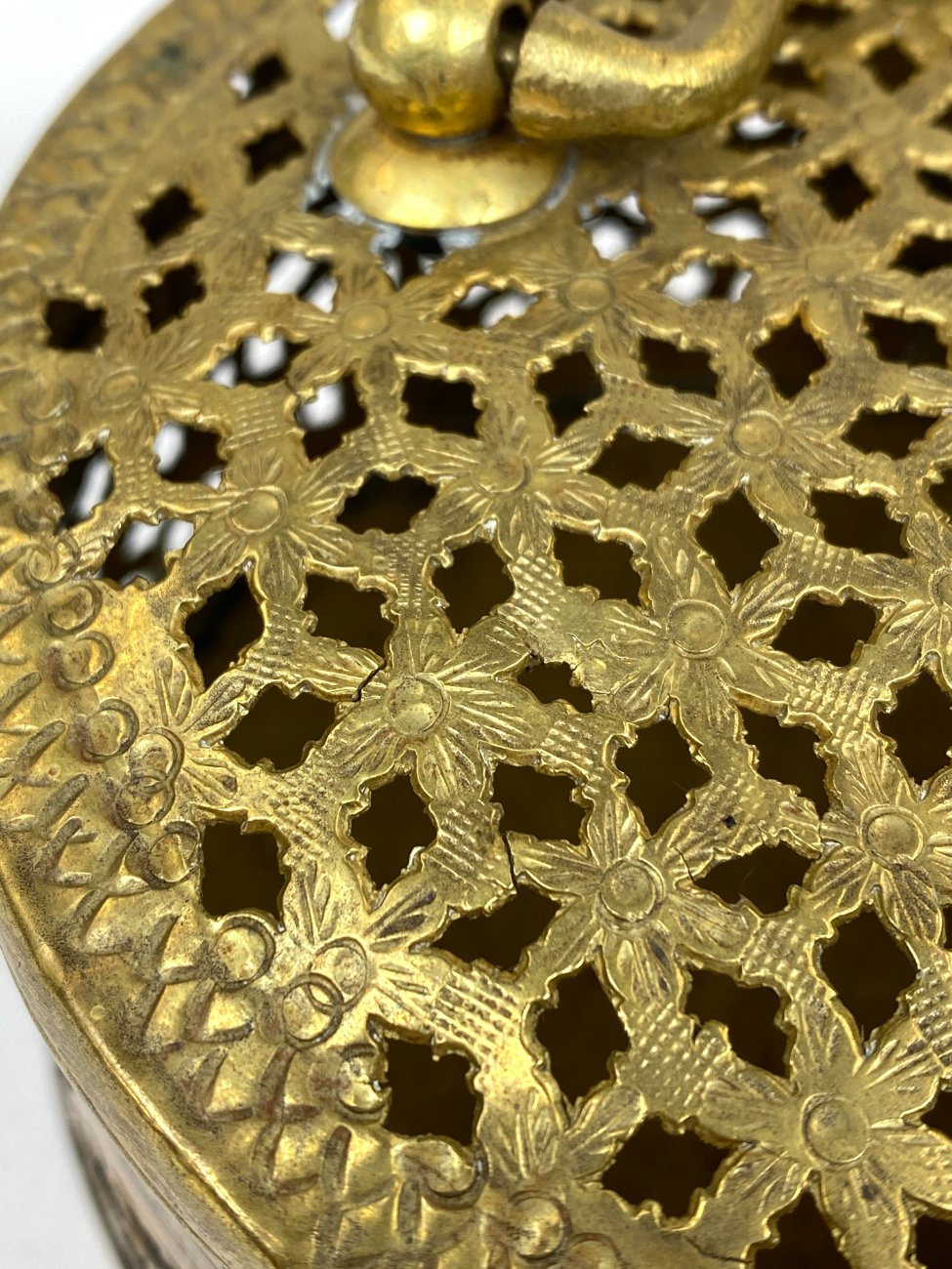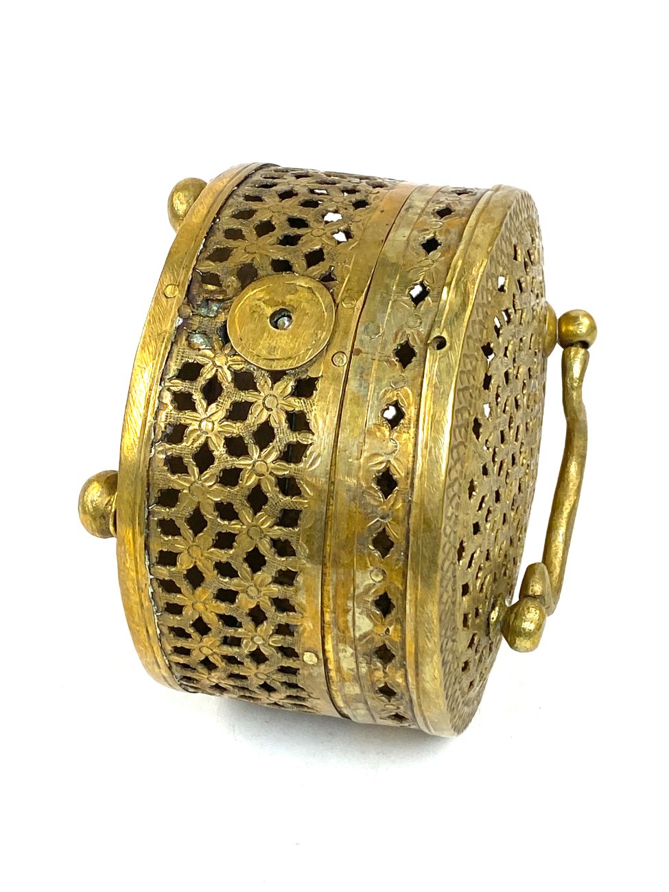 Indiška žalvarinė ažūrinė apvalios formos dėžutė.