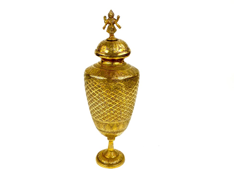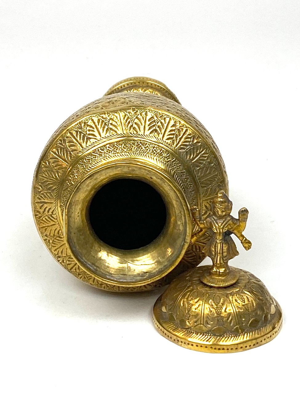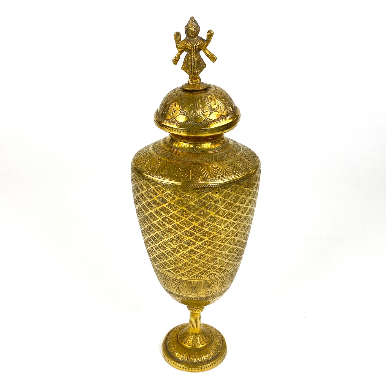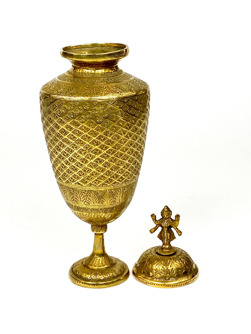 Indiškas žalvarinis indas su dangčiu-urna su Višnus figūra.