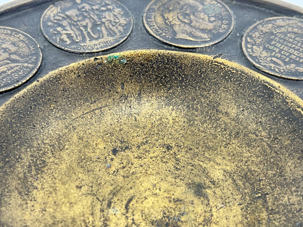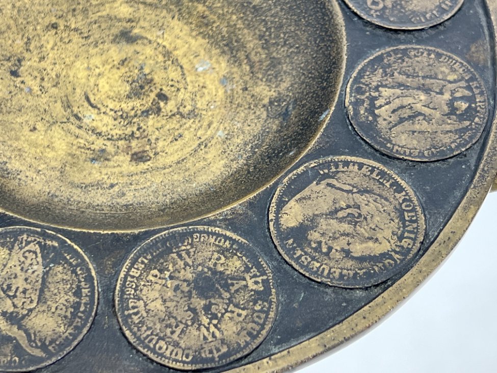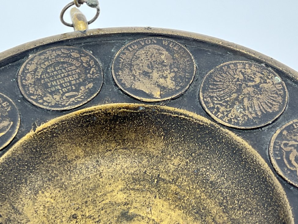 Žalvarinė pakabinama lėkštė su senovinių monetų atvaizdais.