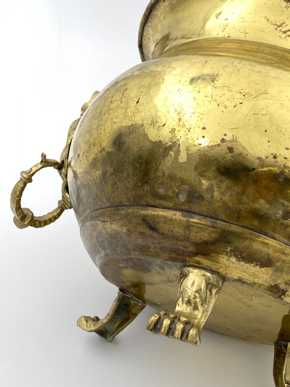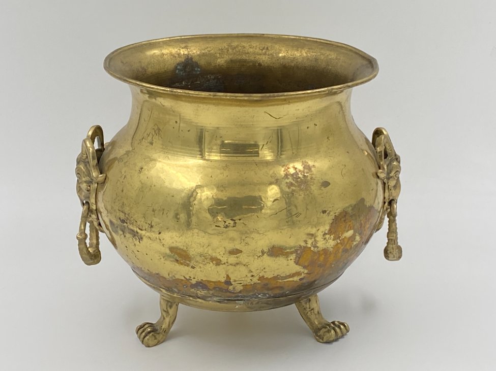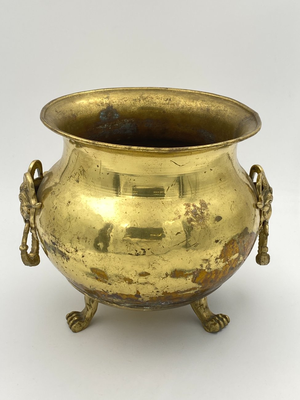 Žalvarinis vazonas ant kojelių, su rankenomis.