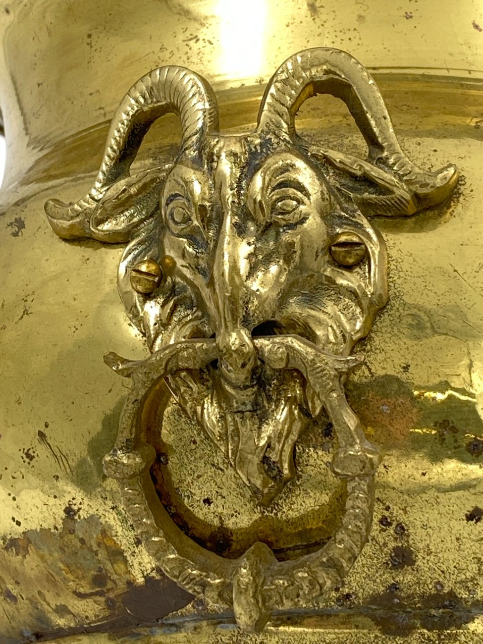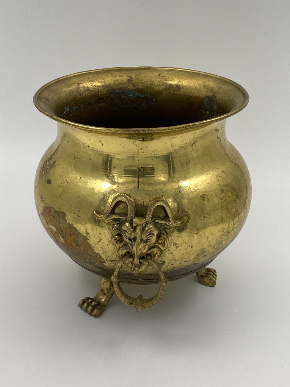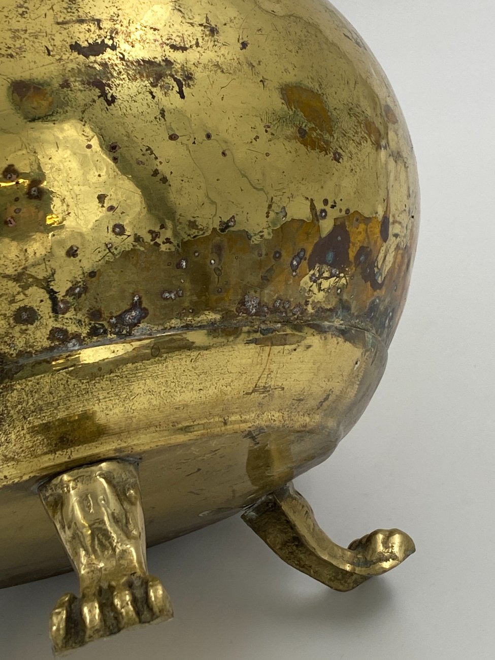 Žalvarinis vazonas ant kojelių, su rankenomis.
