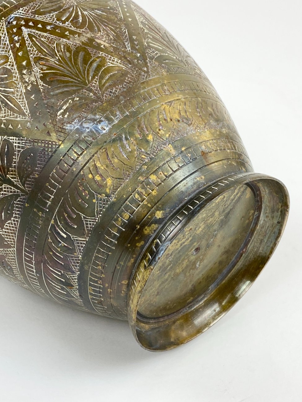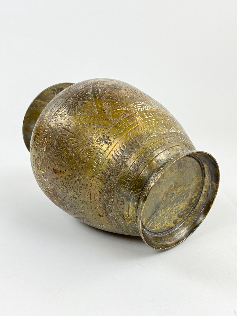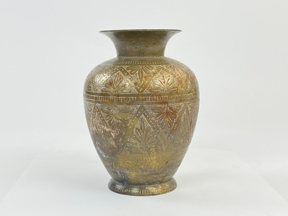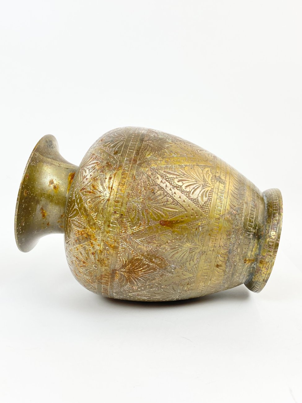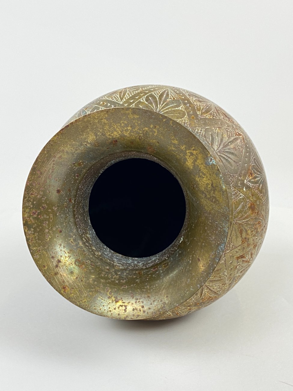 Žalvariu dengto metalo vaza su augalų motyvų ornamentais.