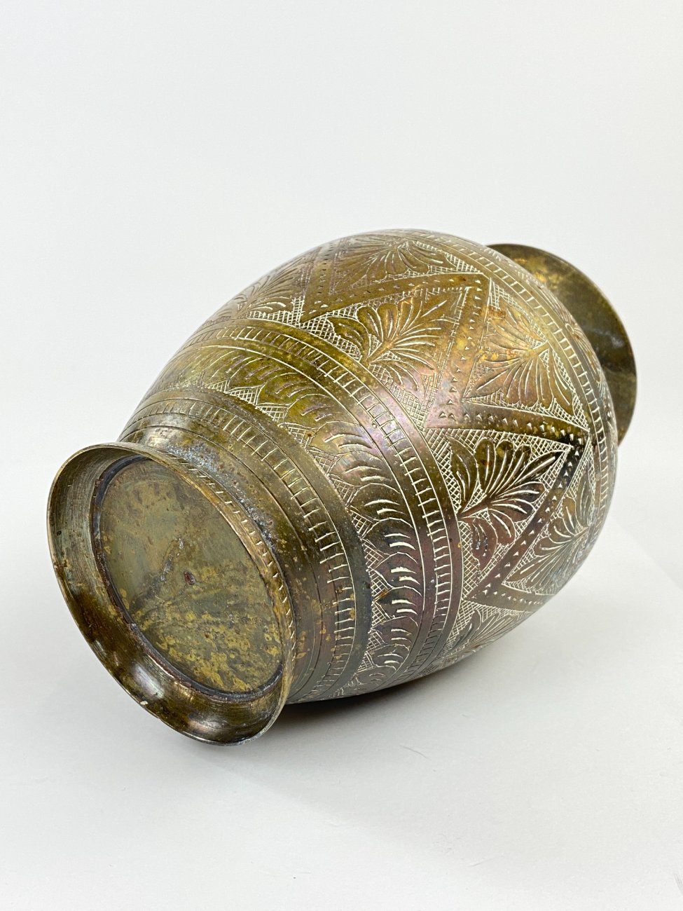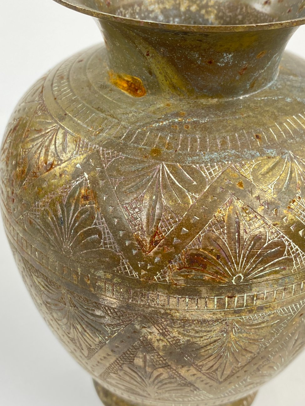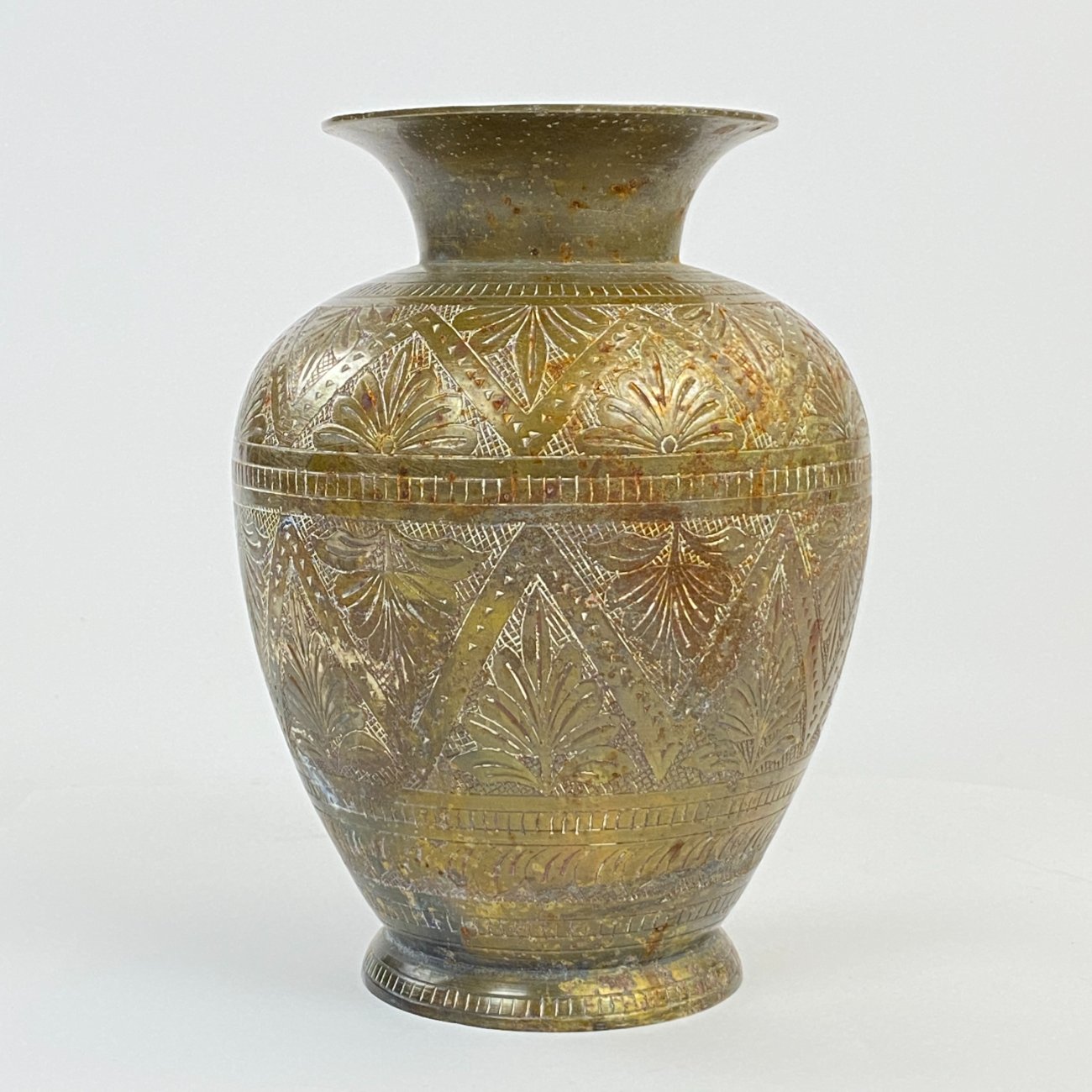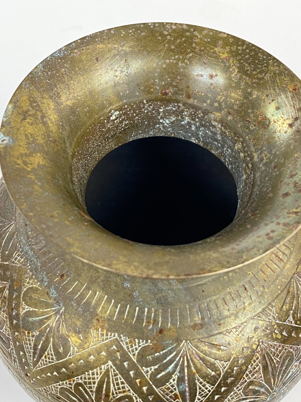 Žalvariu dengto metalo vaza su augalų motyvų ornamentais.