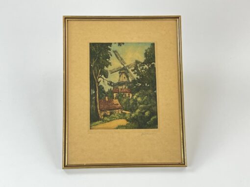 Spalvotas grafikos darbas “Malūnas” mediniame rėme su stiklu.