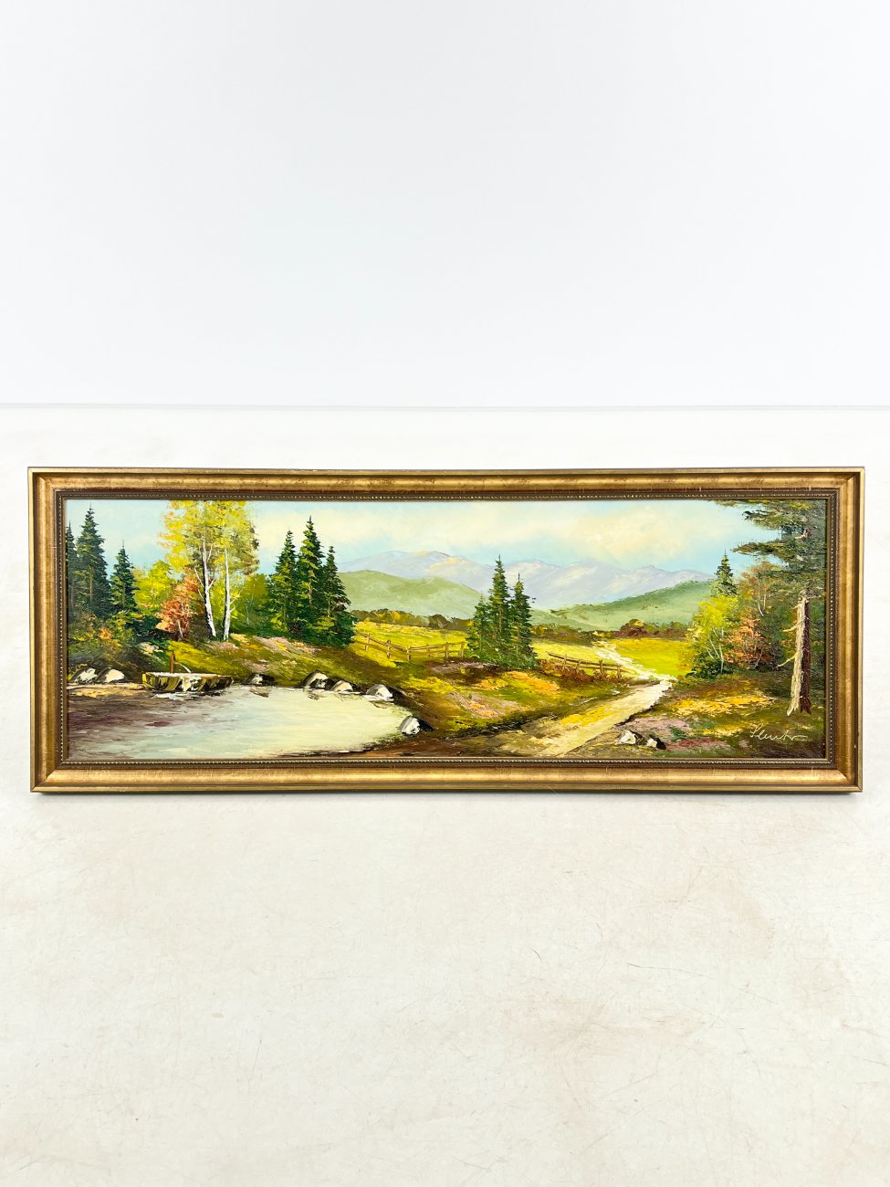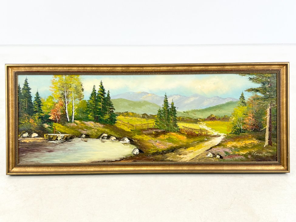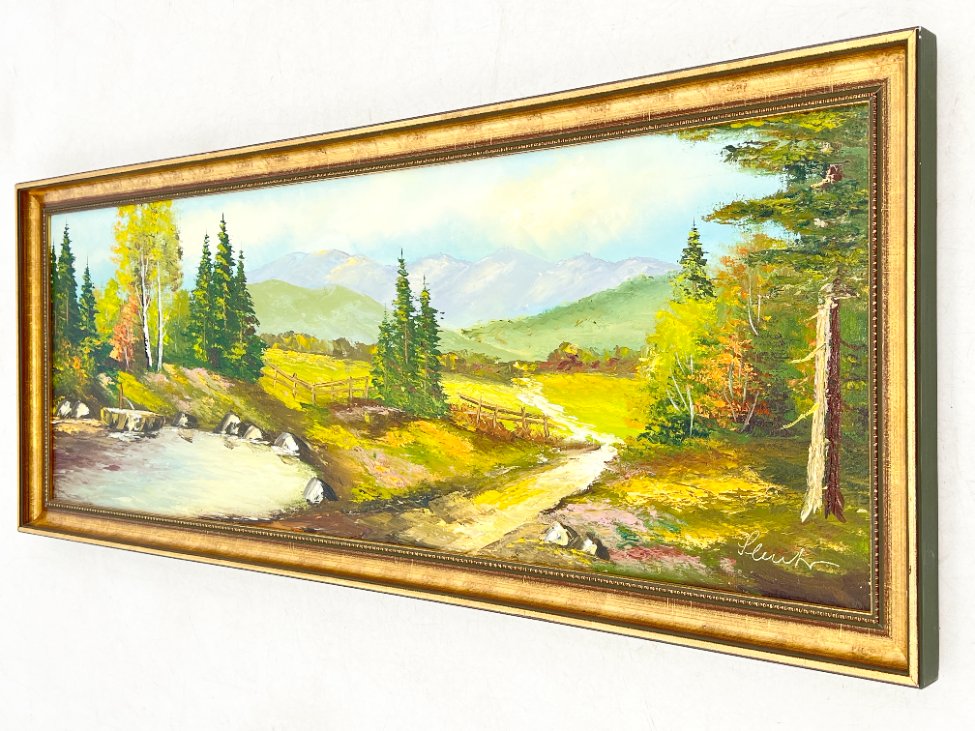 Aliejiniais dažais ant drobės tapytas kalnų gamtos peizažas su mediniu rėmu 4,5×106,5×42 cm