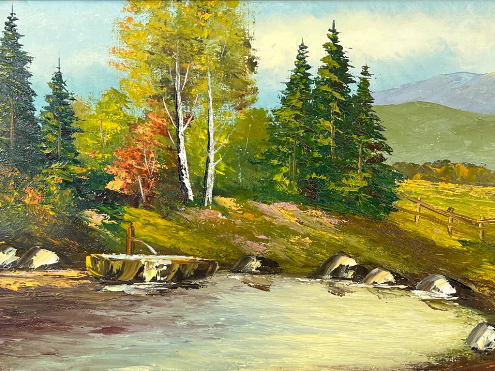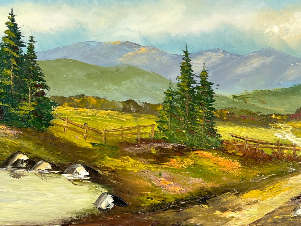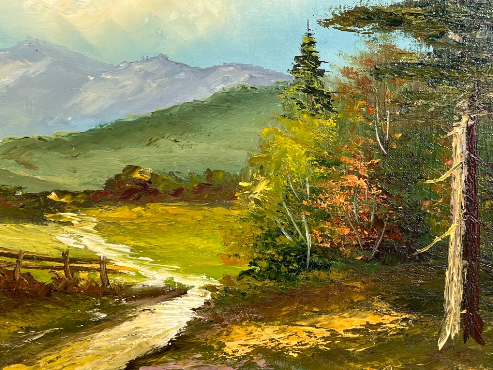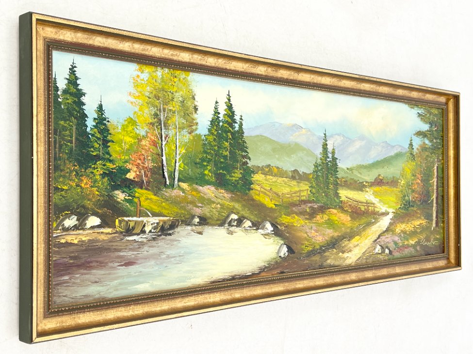 Aliejiniais dažais ant drobės tapytas kalnų gamtos peizažas su mediniu rėmu.