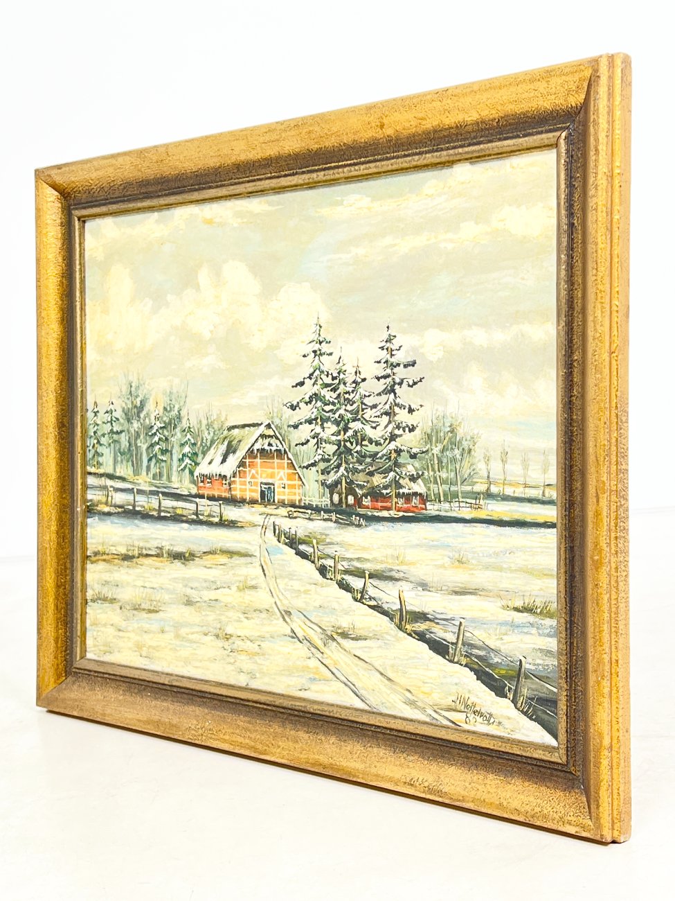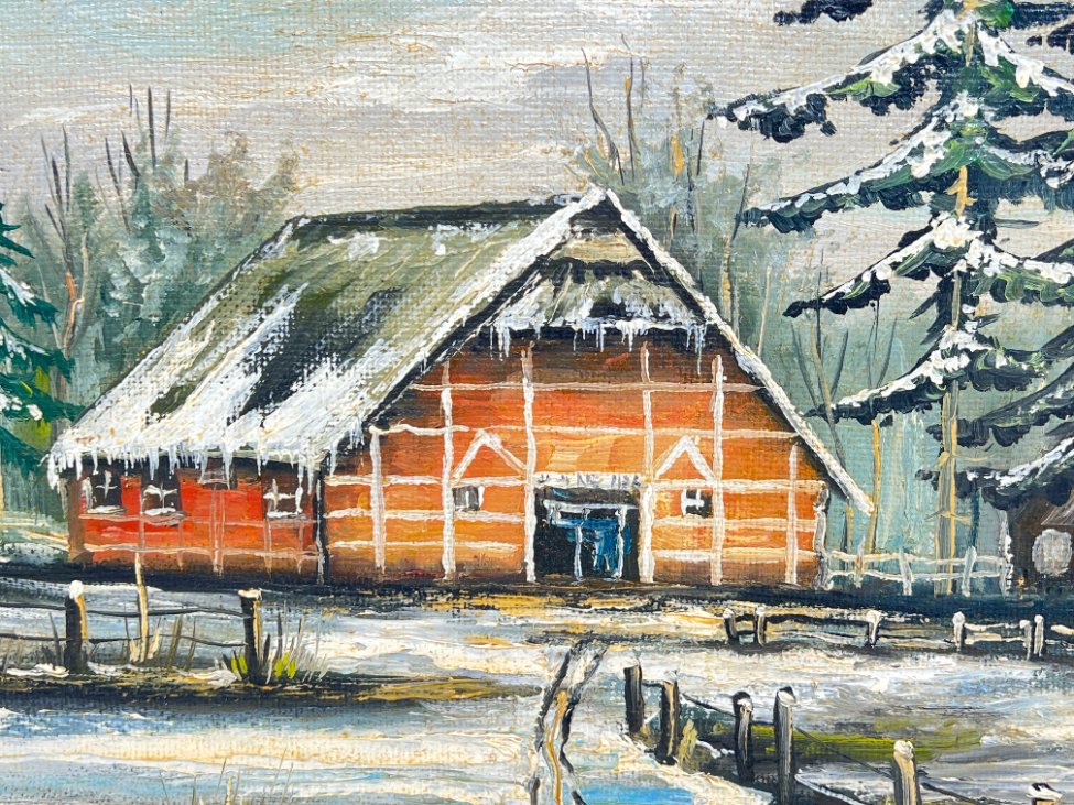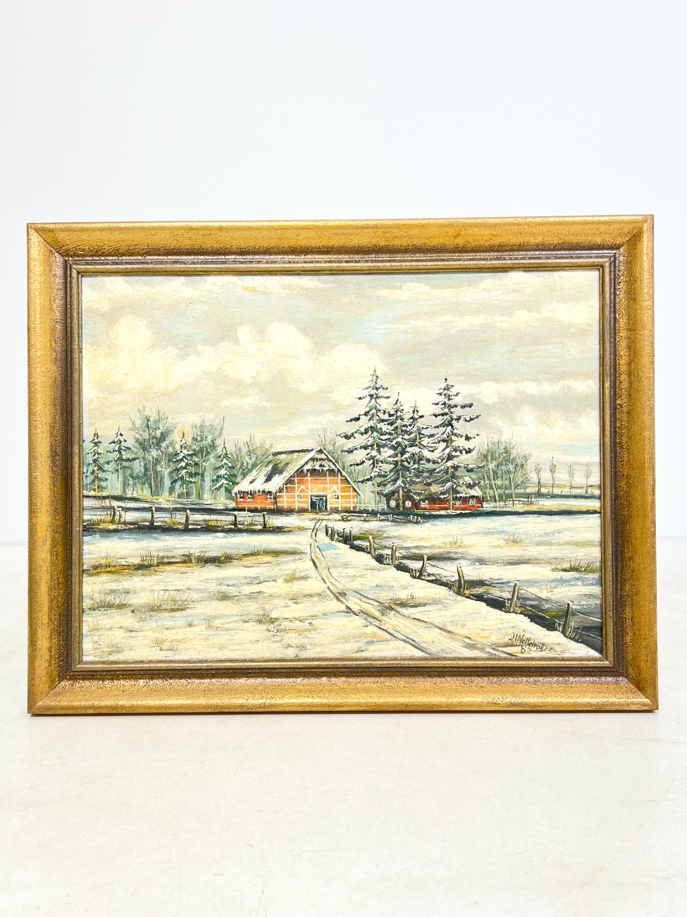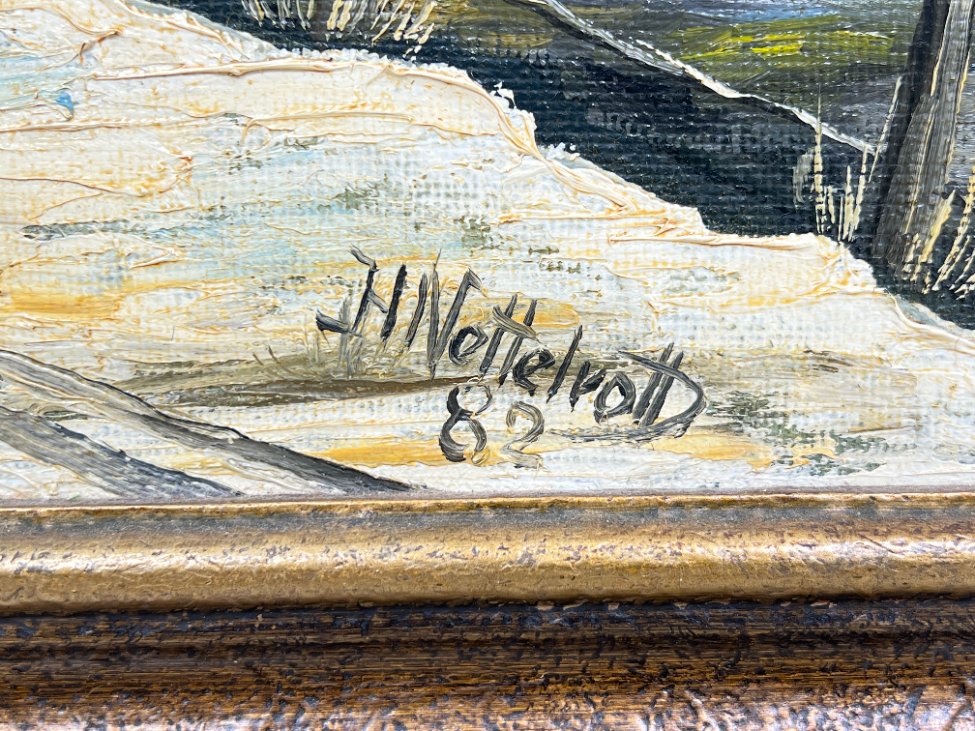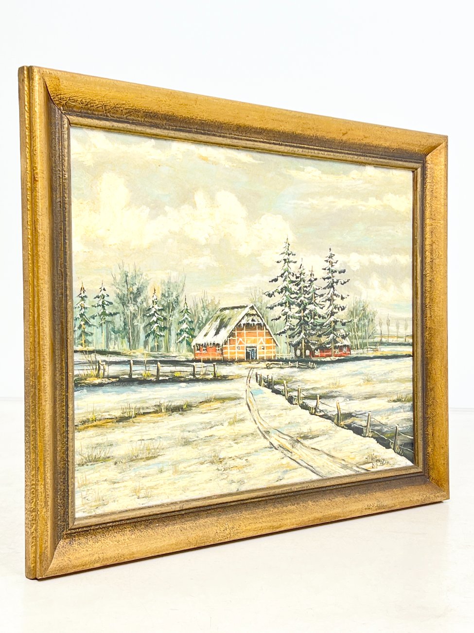 Aliejiniais dažais ant faneros tapytas žiemos peizažas su trobele mediniame aukso spalvos rėme.