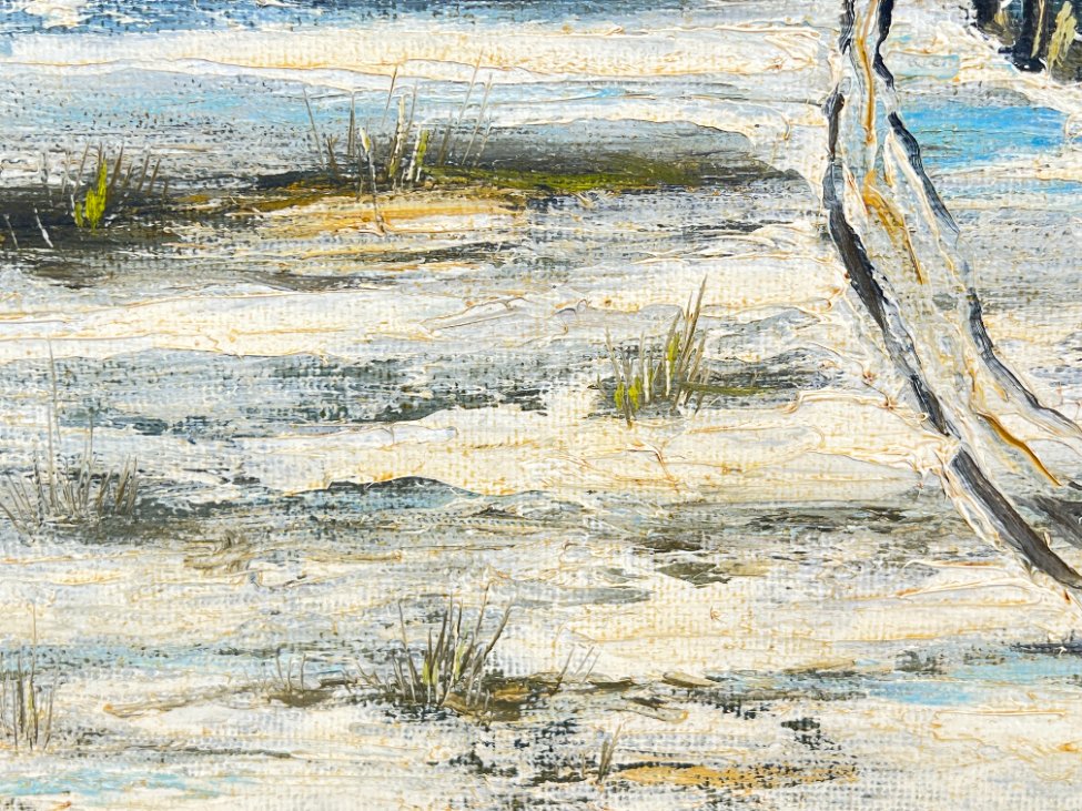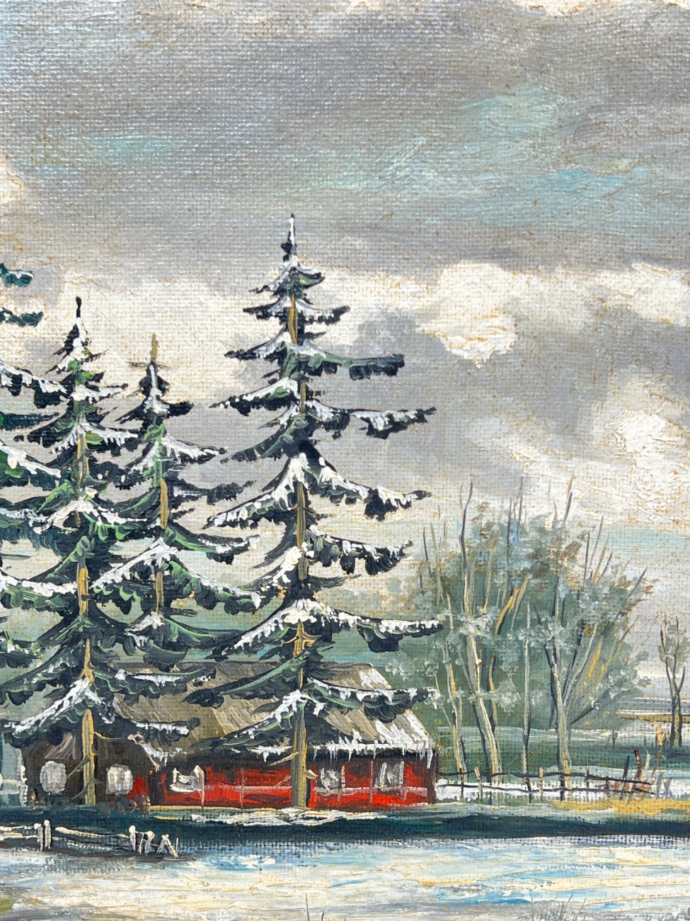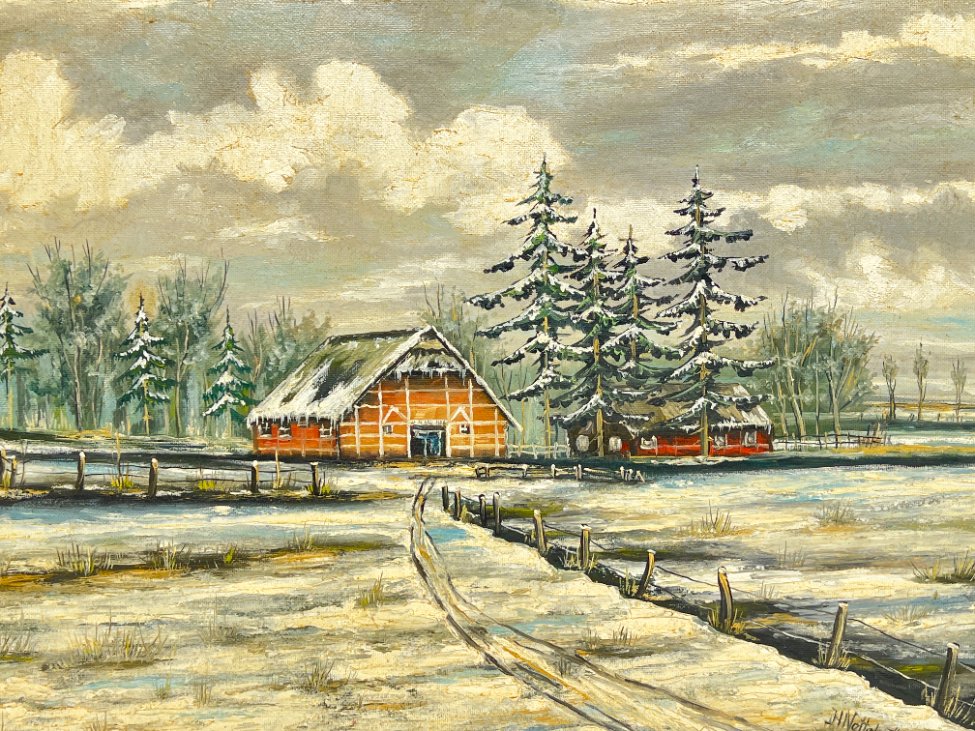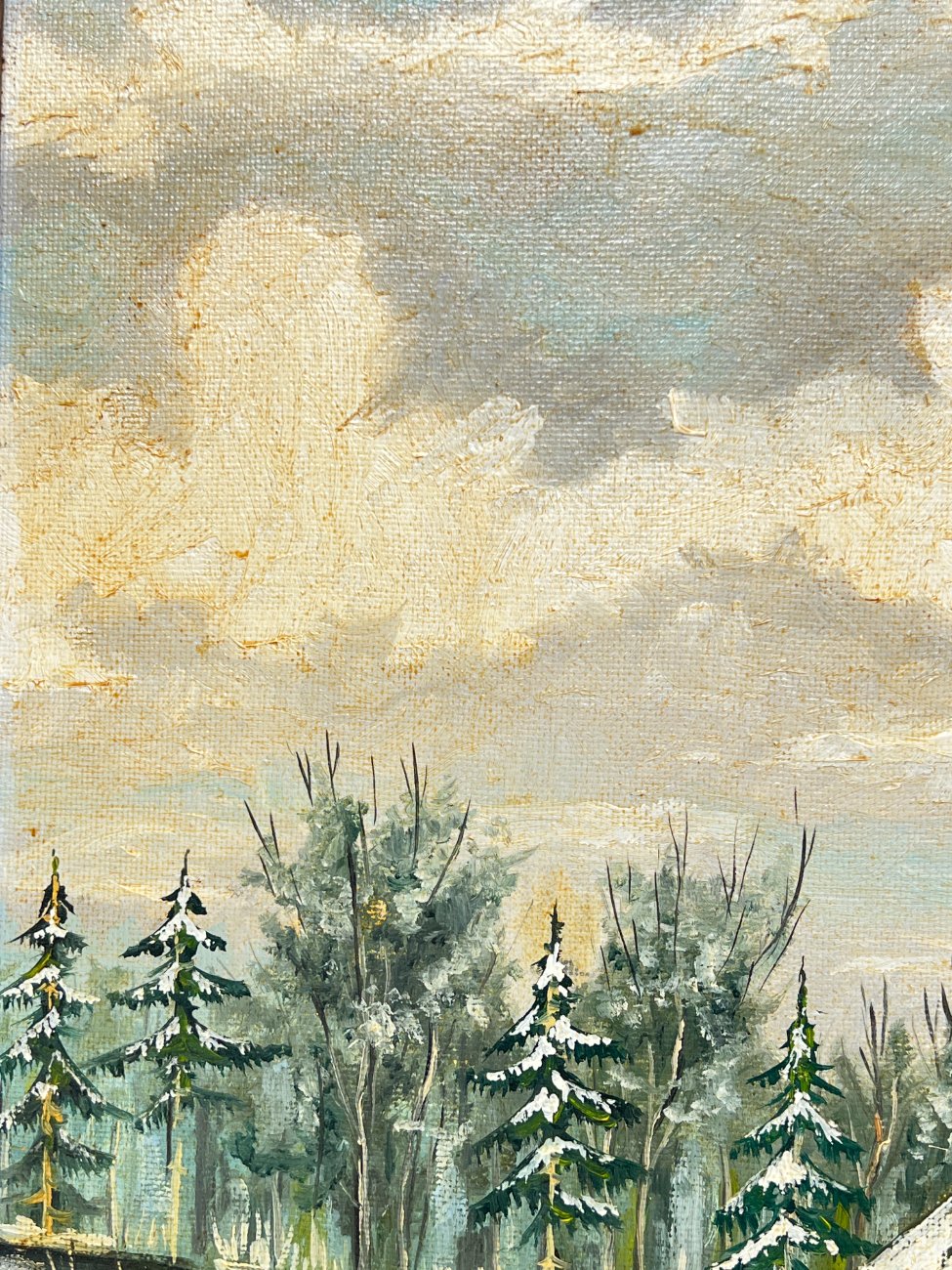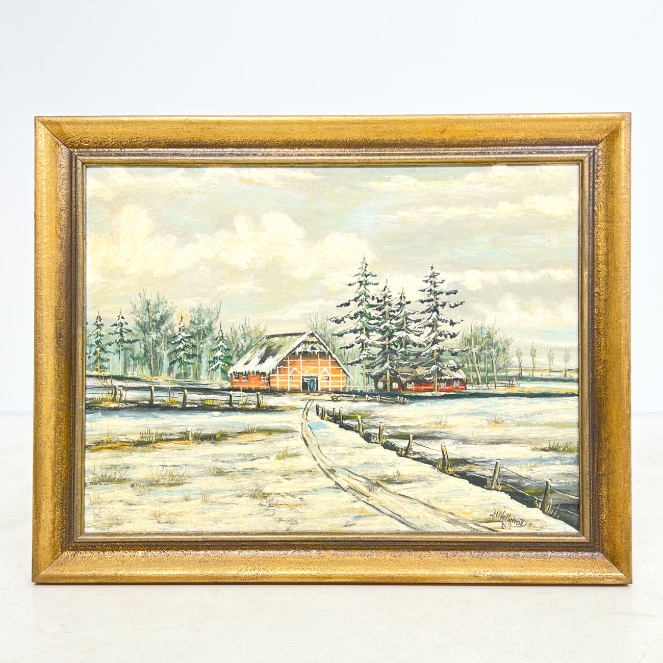 Aliejiniais dažais ant faneros tapytas žiemos peizažas su trobele mediniame aukso spalvos rėme.