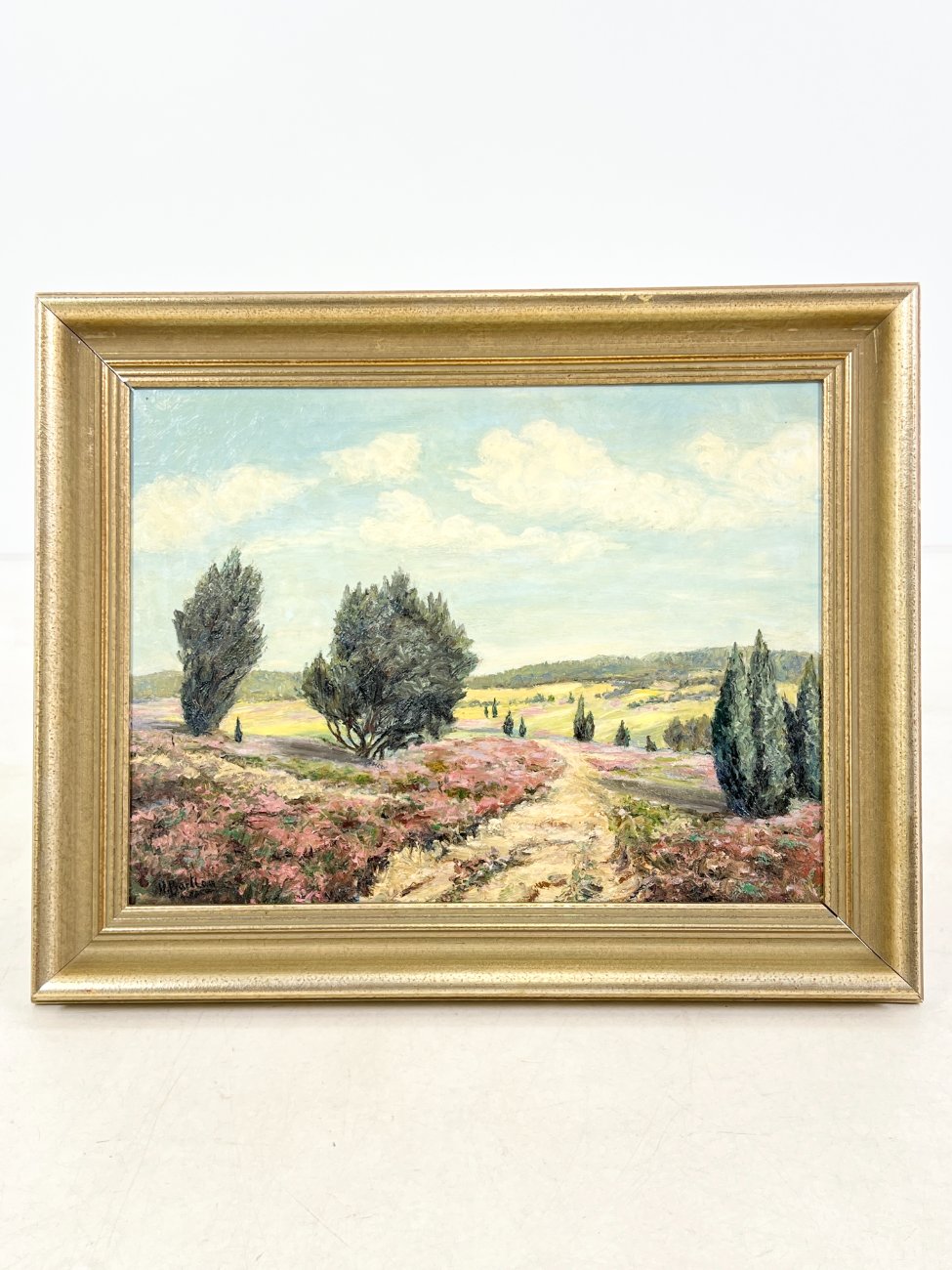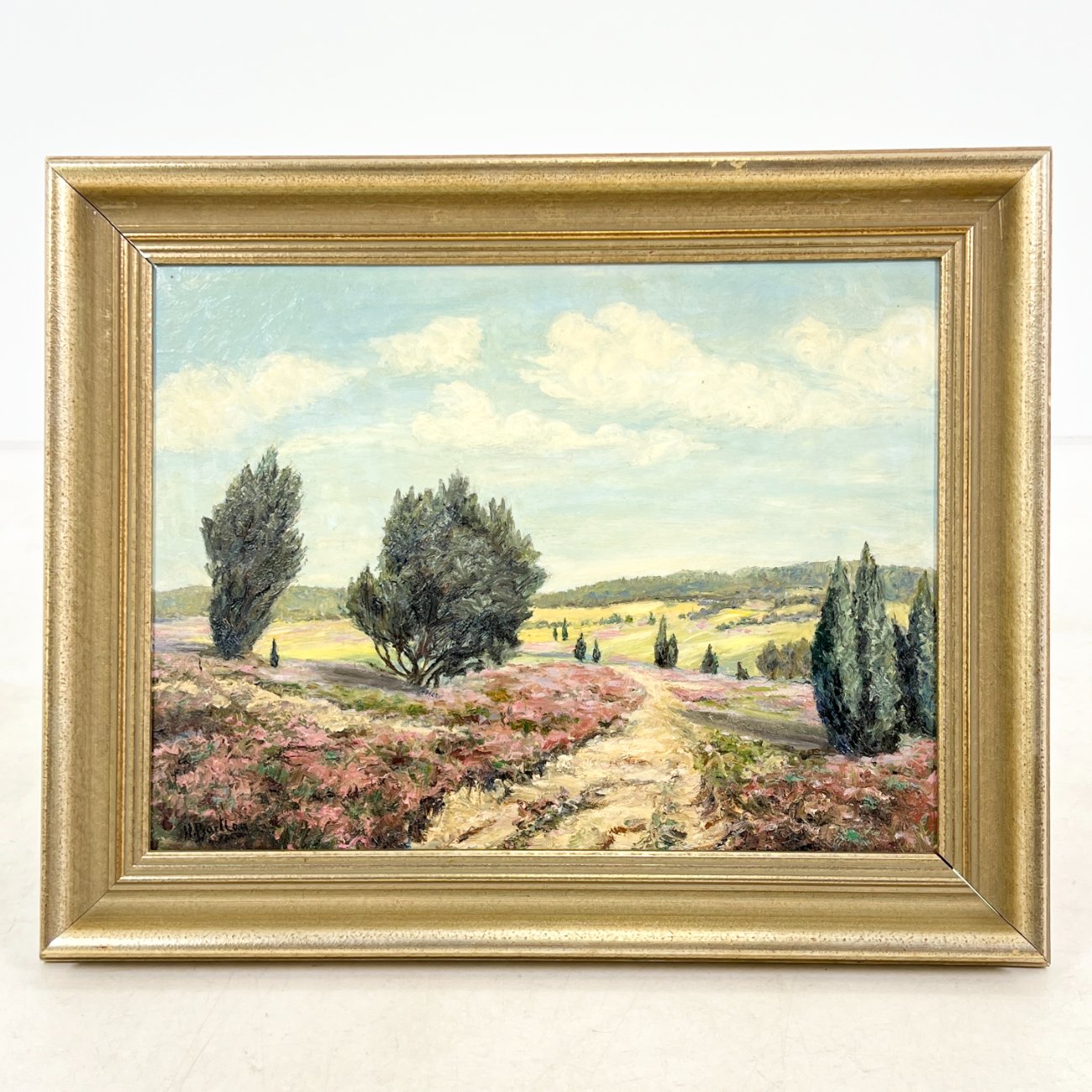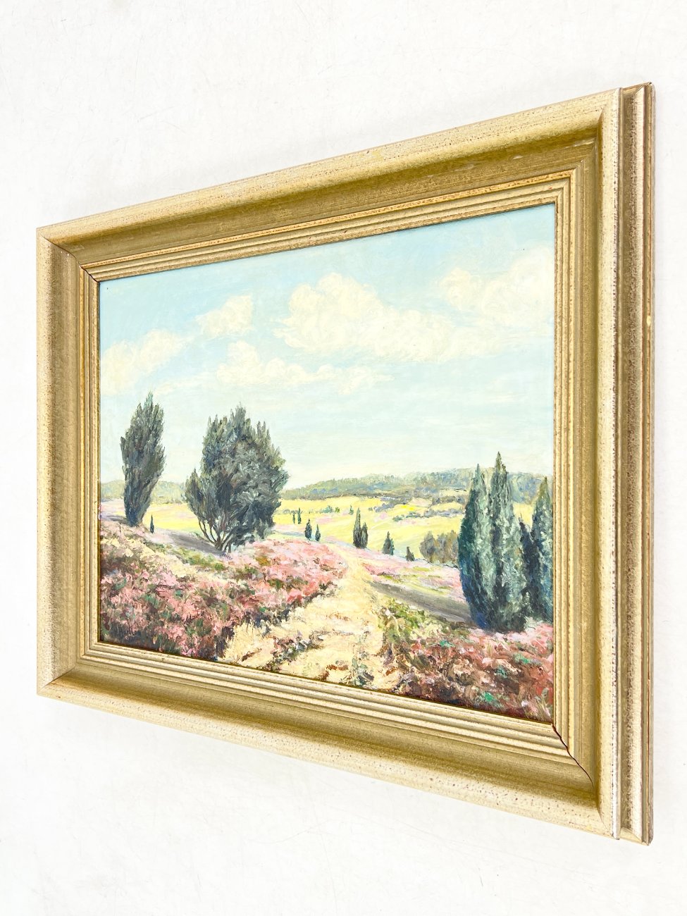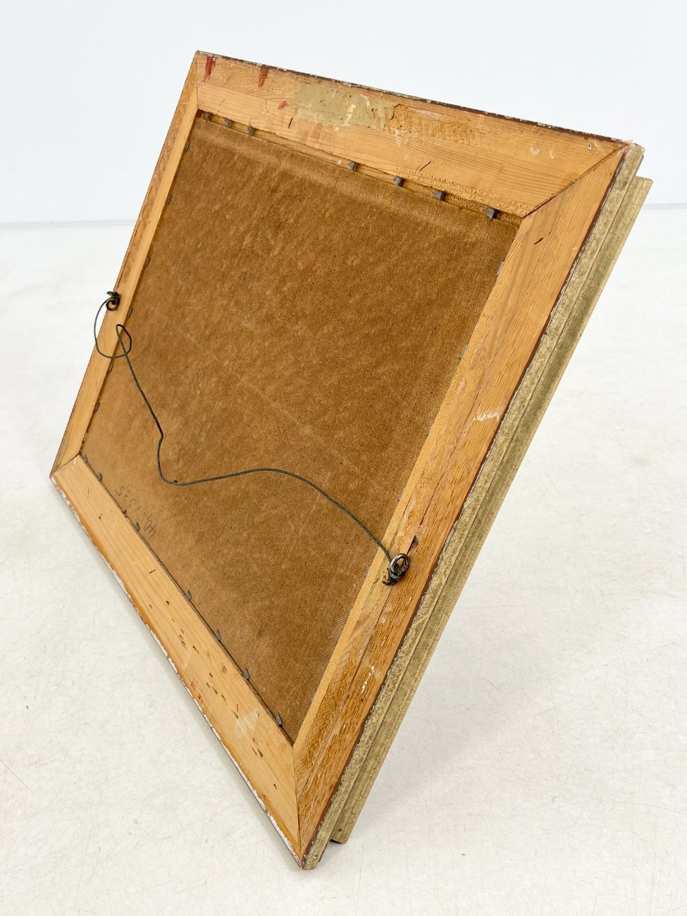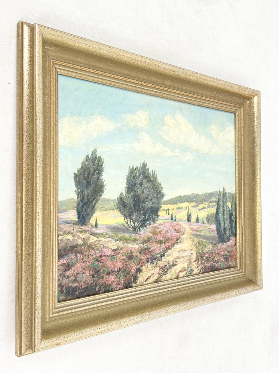Ant kartono aliejiniais dažais tapytas gamtos peizažas medžio rėme.