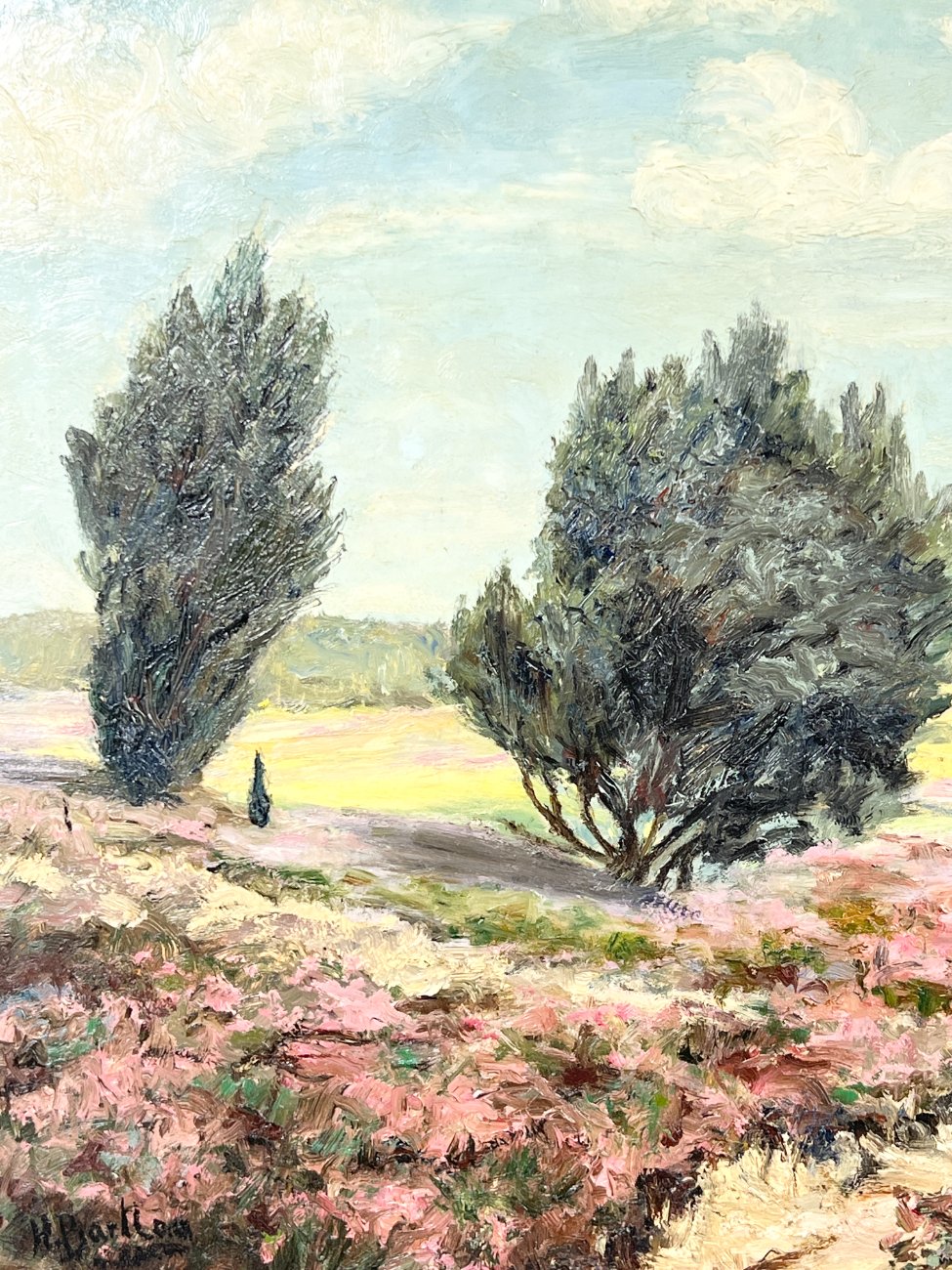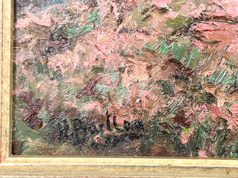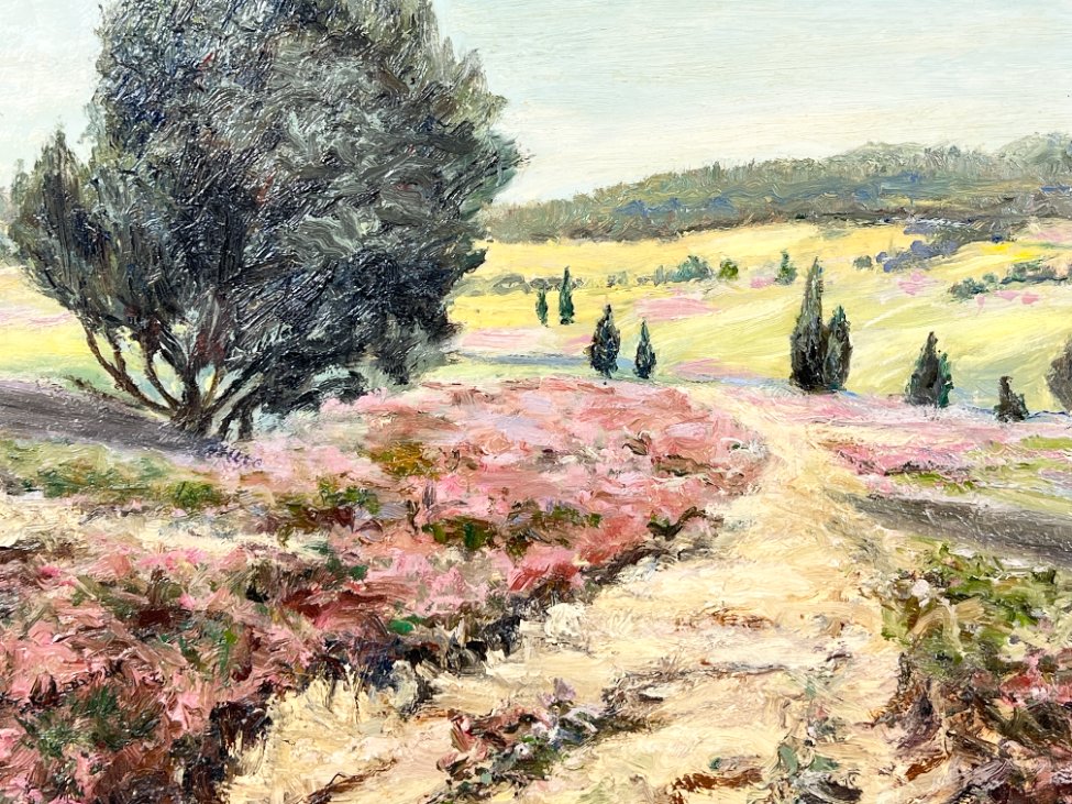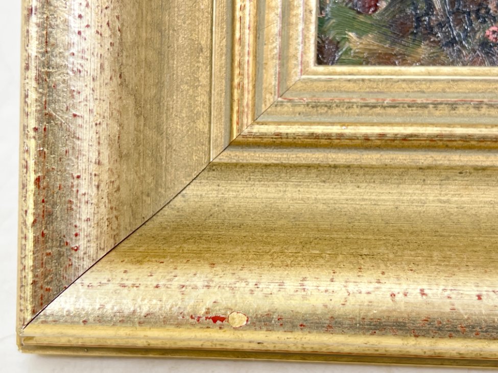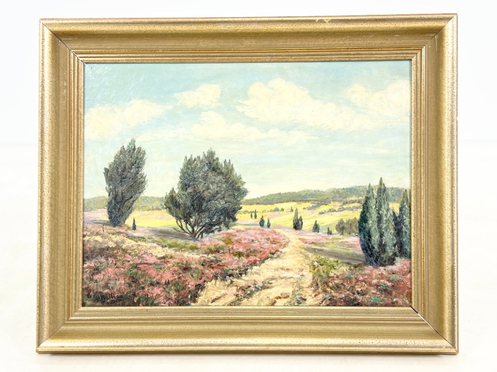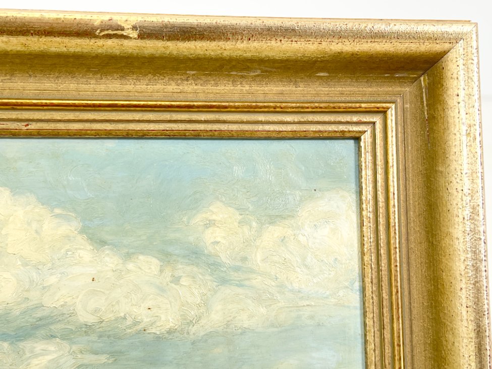 Ant kartono aliejiniais dažais tapytas gamtos peizažas medžio rėme.