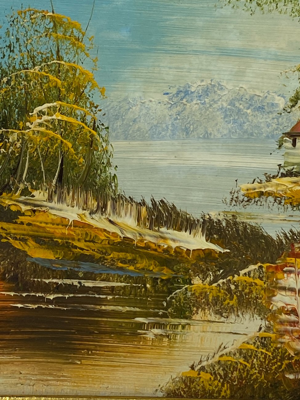 Guašu ant faneruotės tapytas gamtos peizažas.