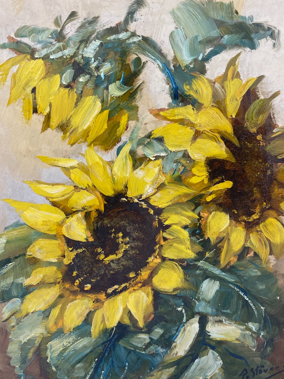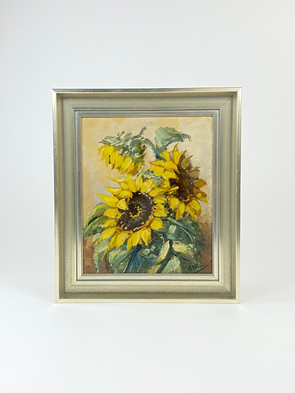 Ant kartono tapytas natiurmortas “Saulėgrąžos” mediniame rėme.