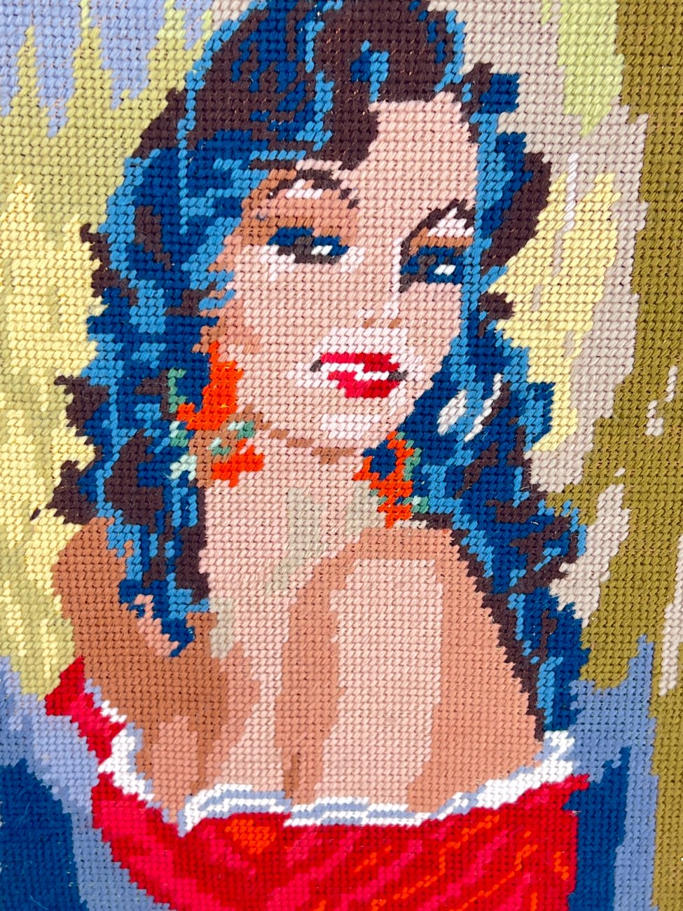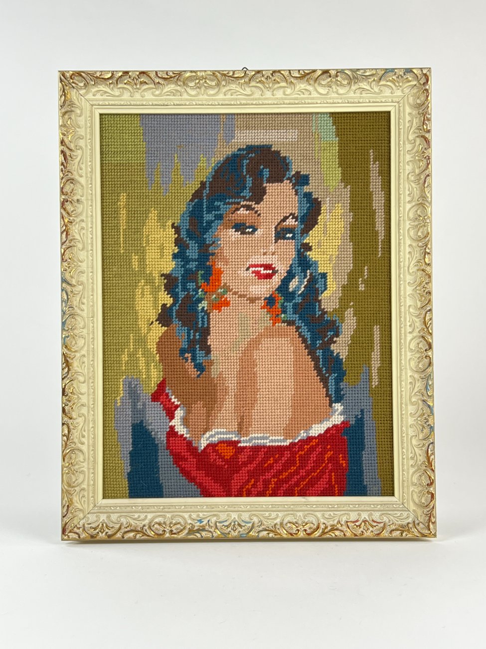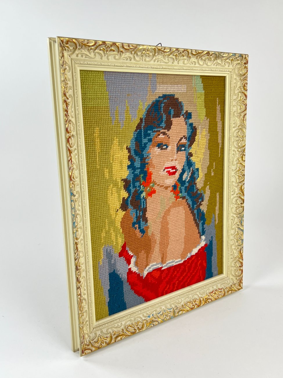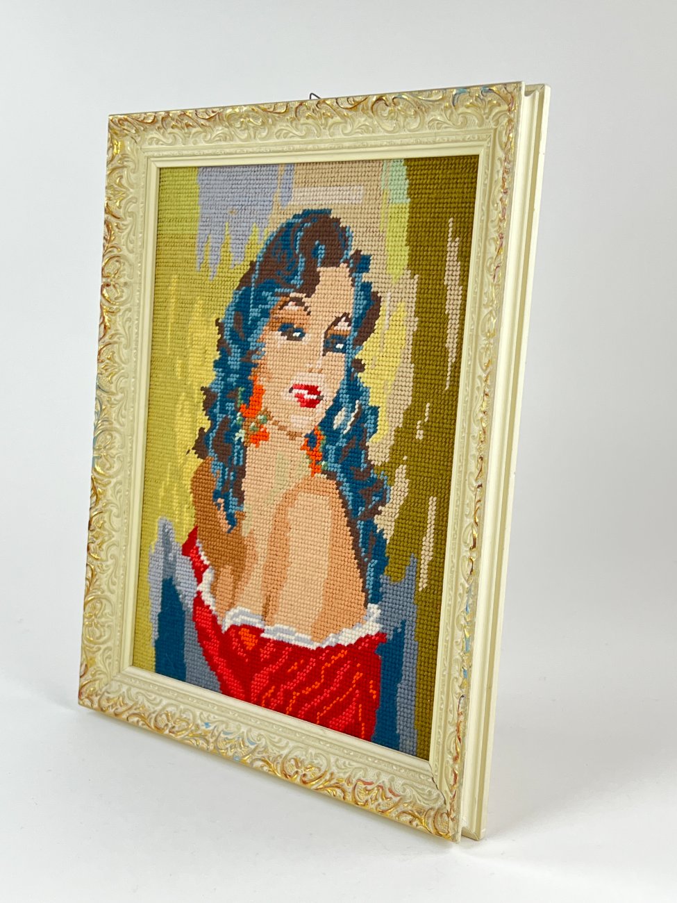 Siuvinėtas moters portretas mediniame rėme.