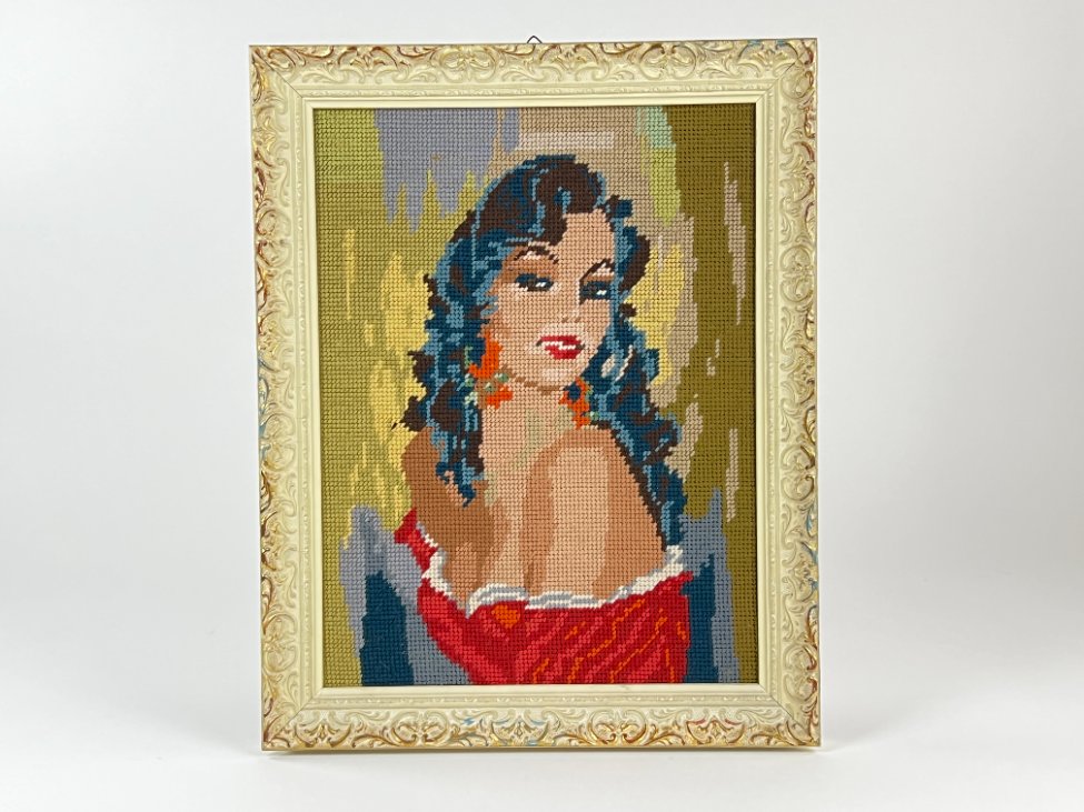 Siuvinėtas moters portretas mediniame rėme 3x32x40 cm