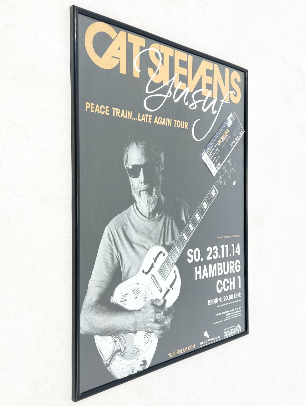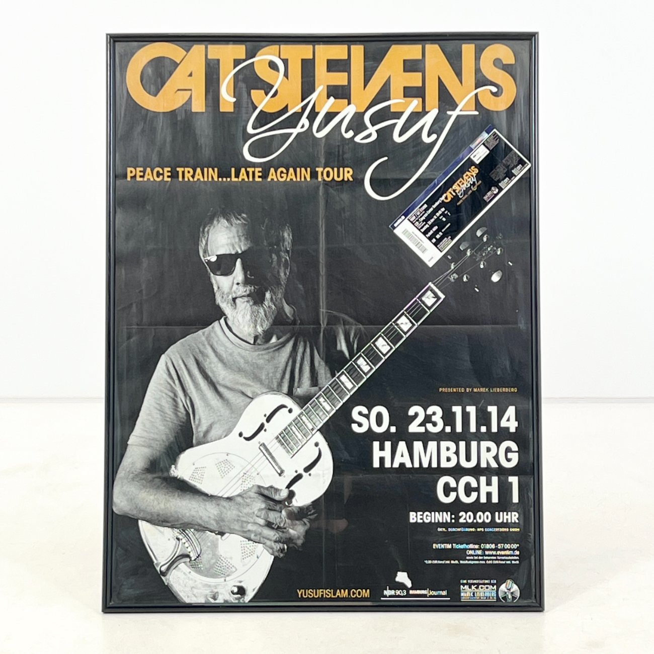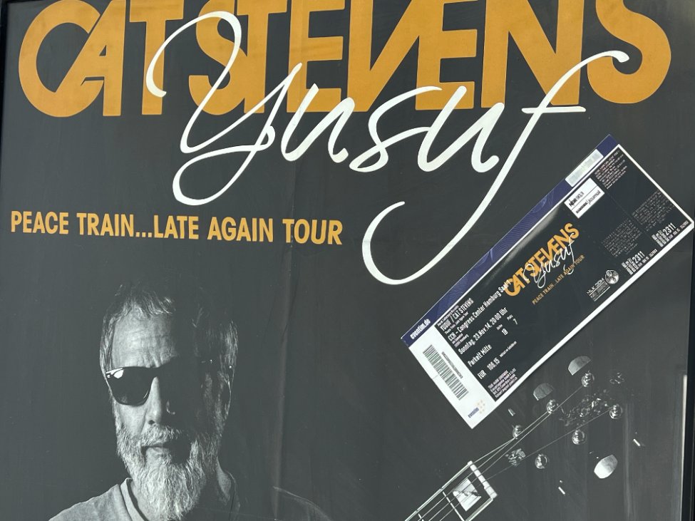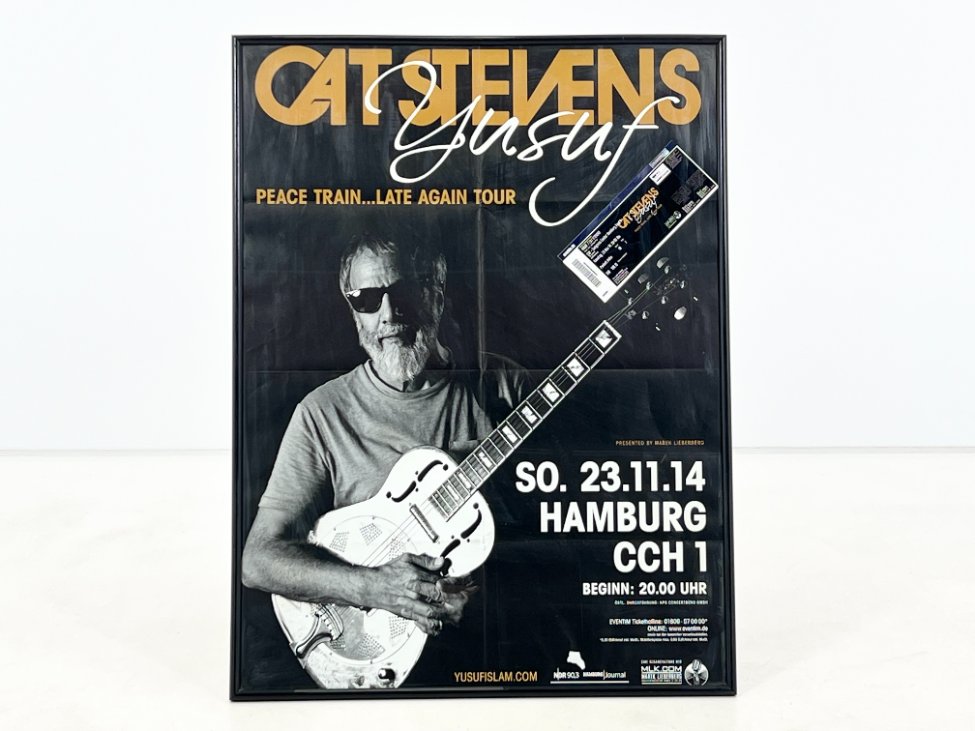 Cat Stevens Peace Train… Late Again Tour plakatas su bilietu plastikiniame rėme.