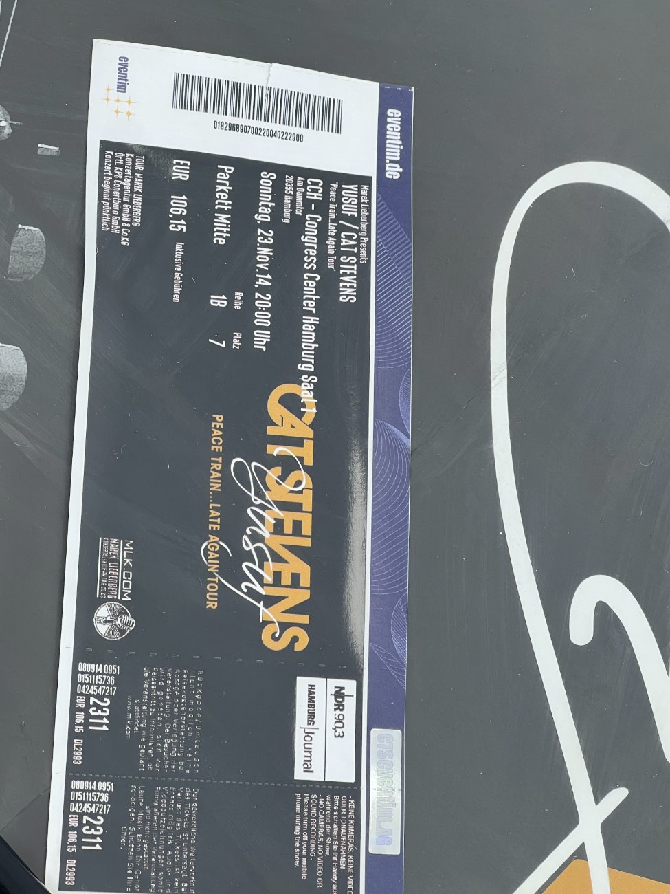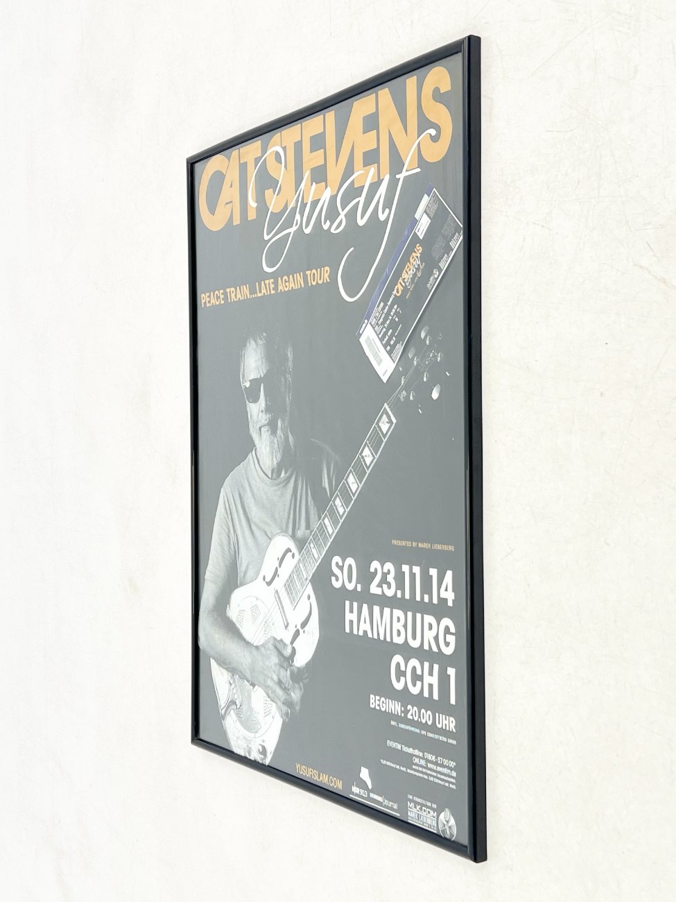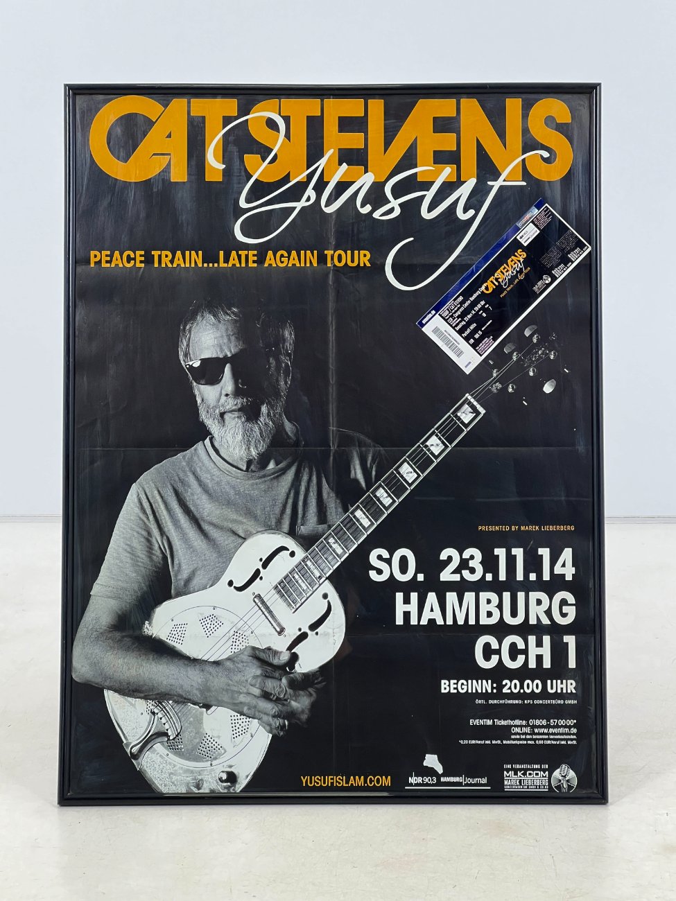 Cat Stevens Peace Train… Late Again Tour plakatas su bilietu plastikiniame rėme.
