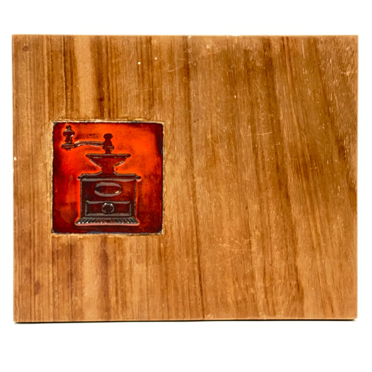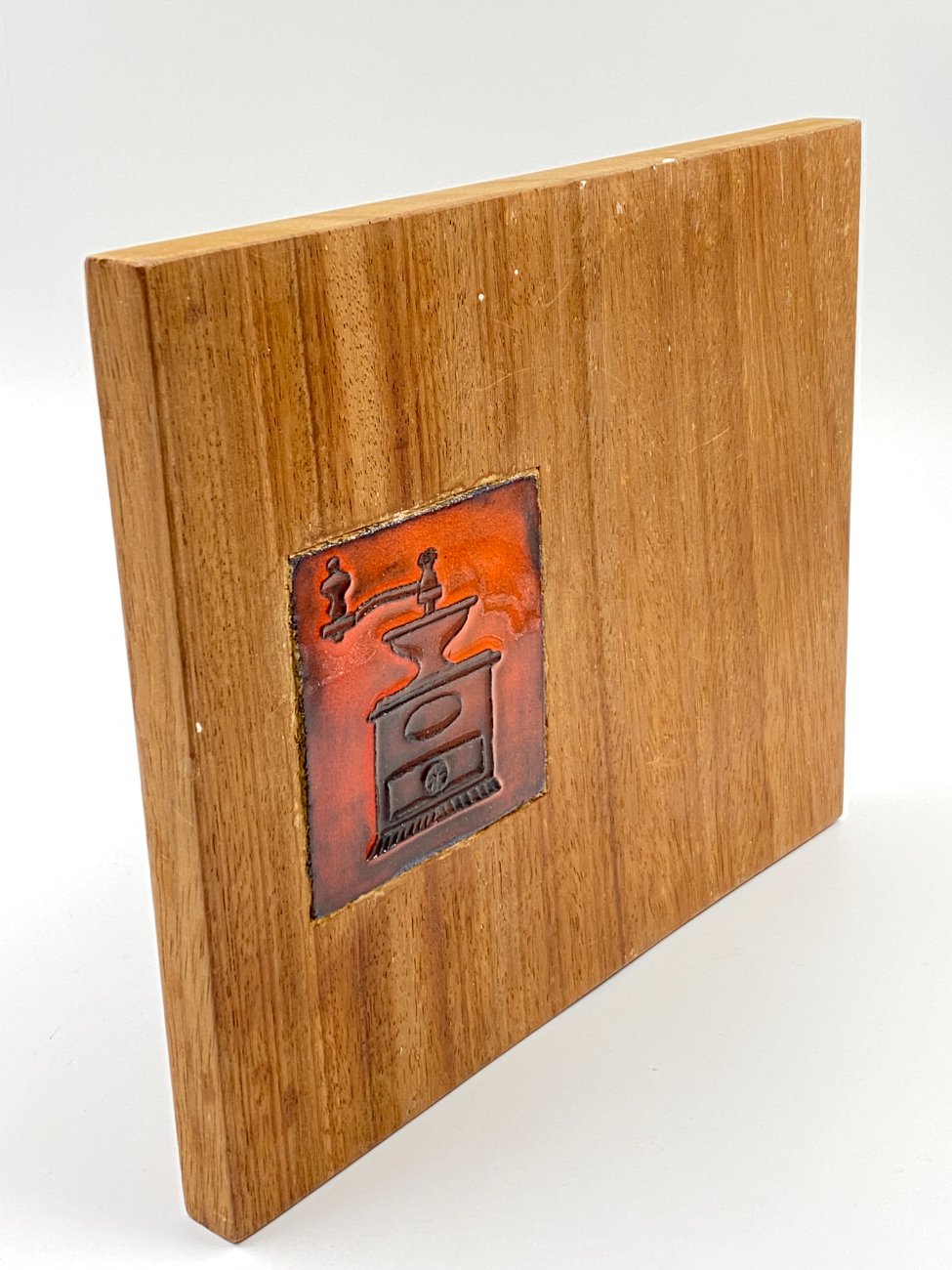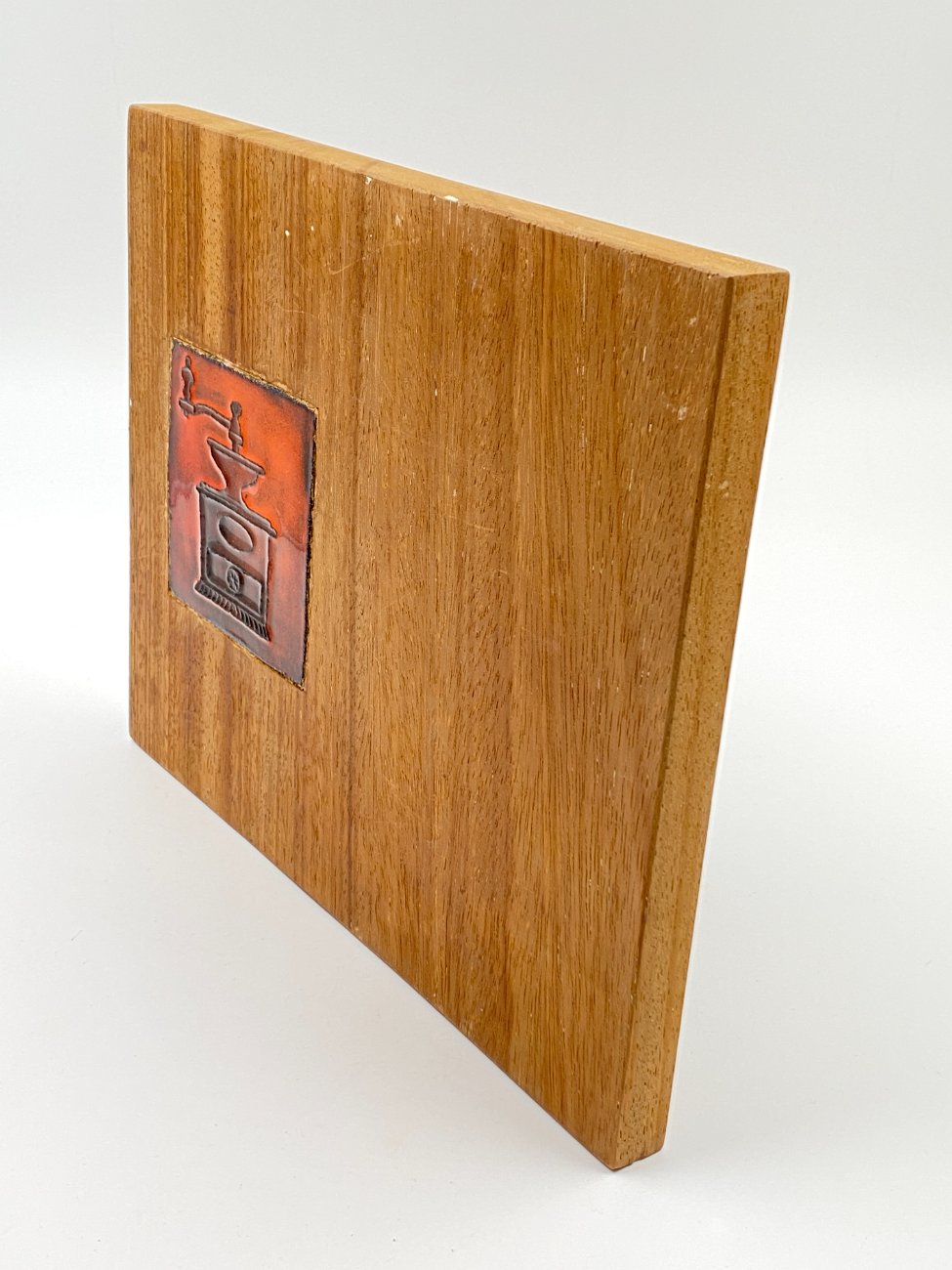 Dekoratyvinė medinė lentelė su keramikine detale.
