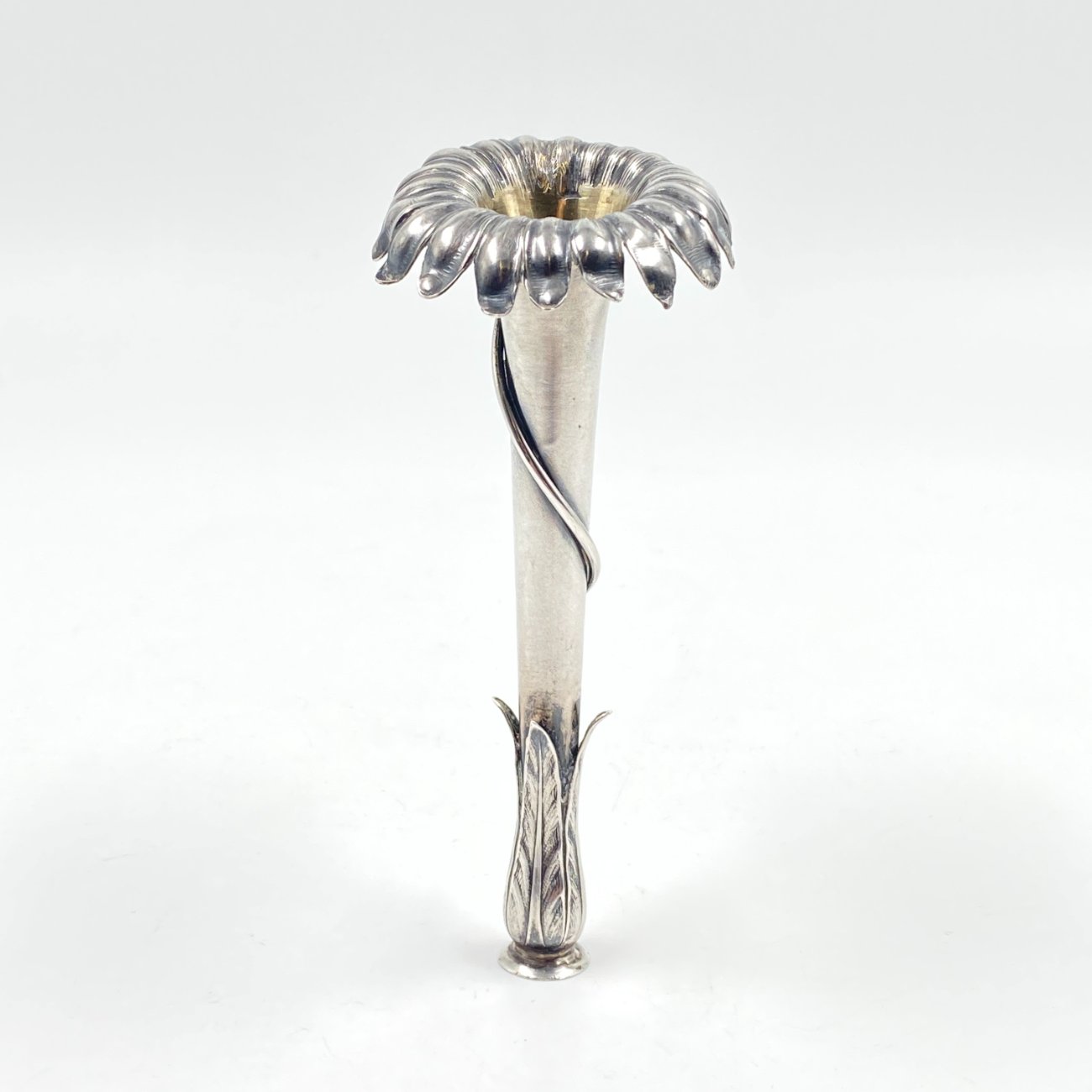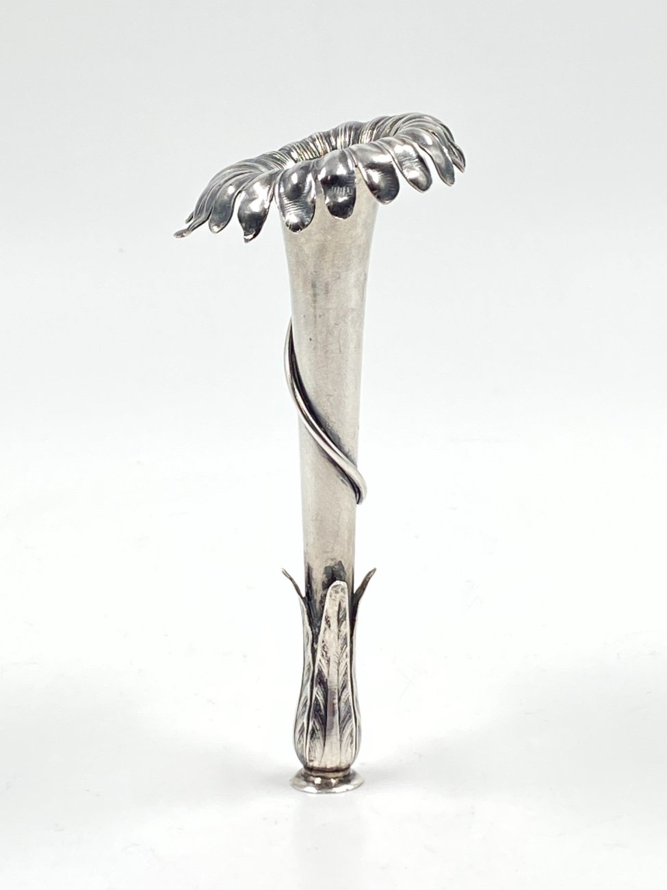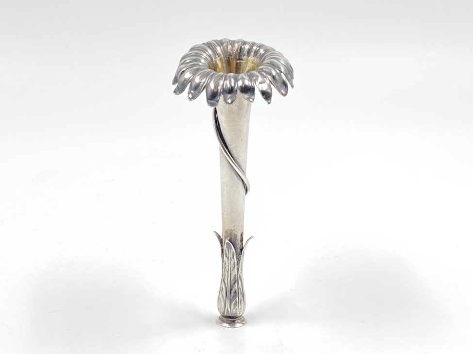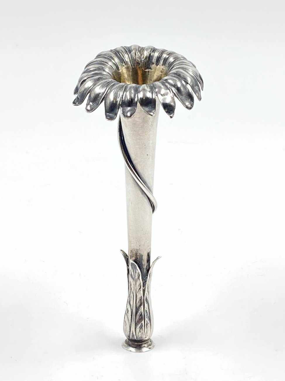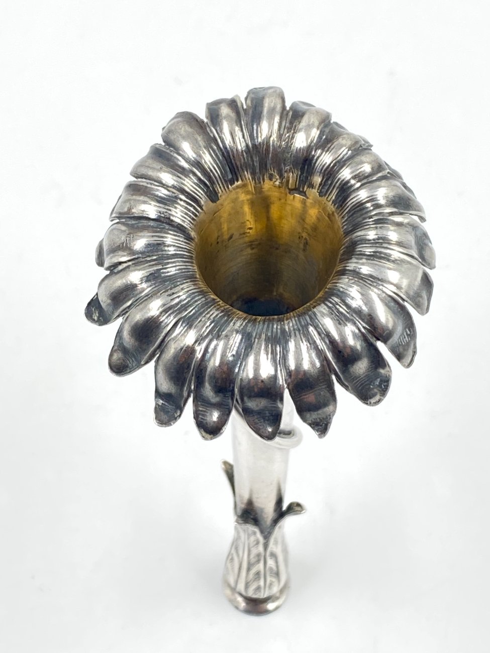 Sidabruoto metalo, gėlės žiedo formos vazelė.