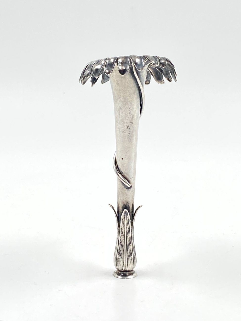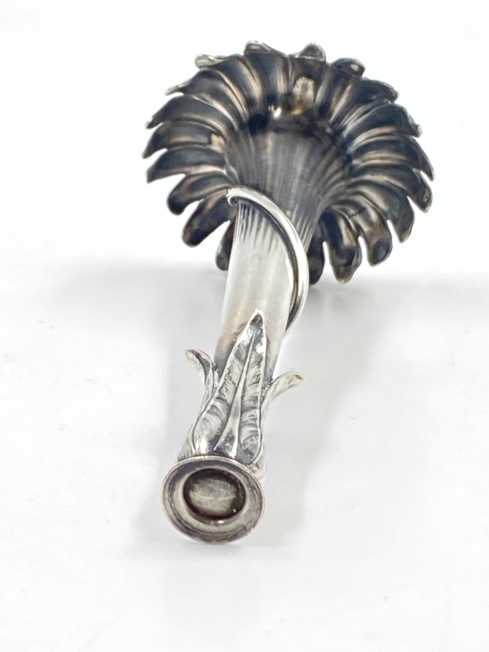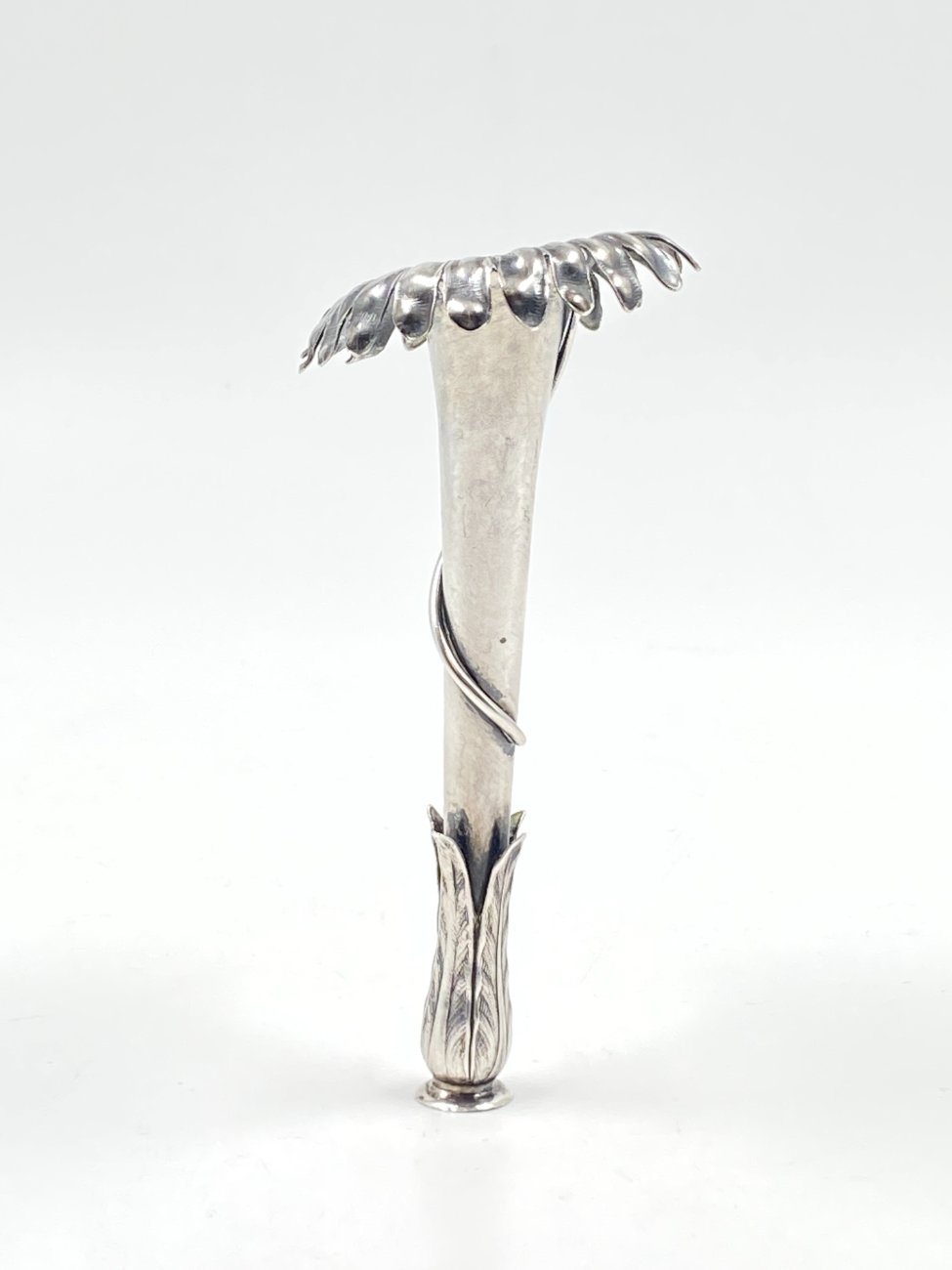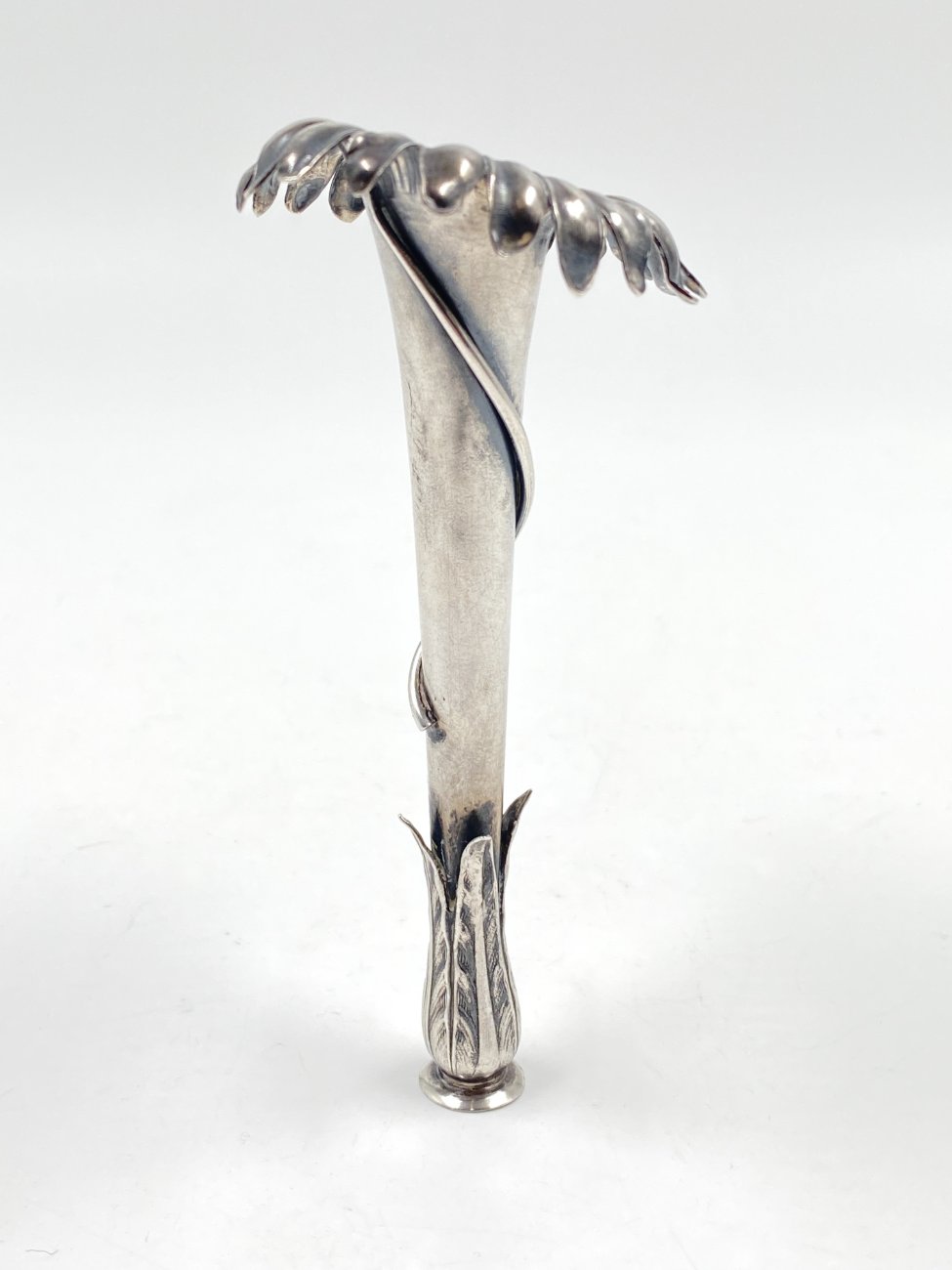 Sidabruoto metalo, gėlės žiedo formos vazelė.