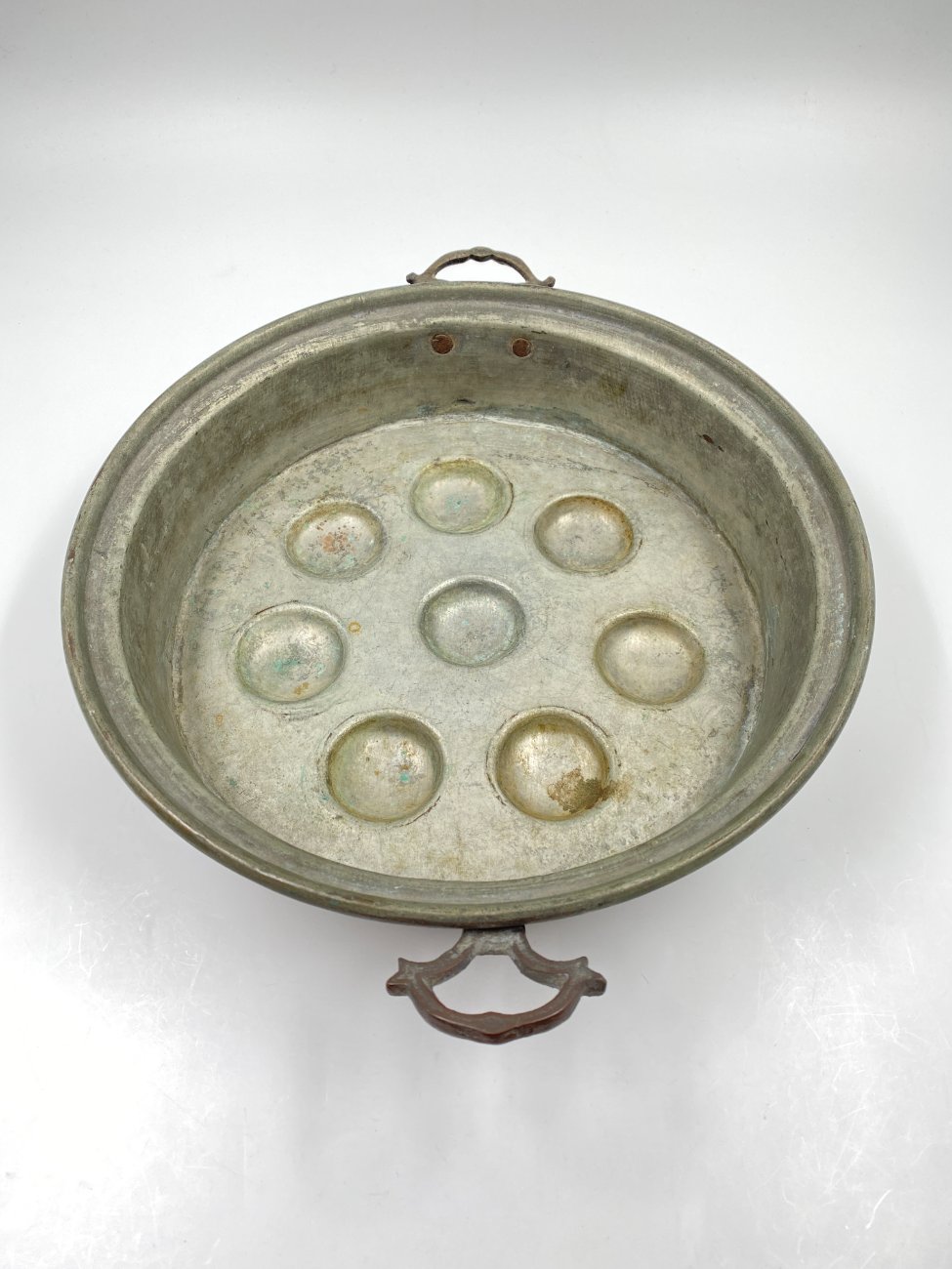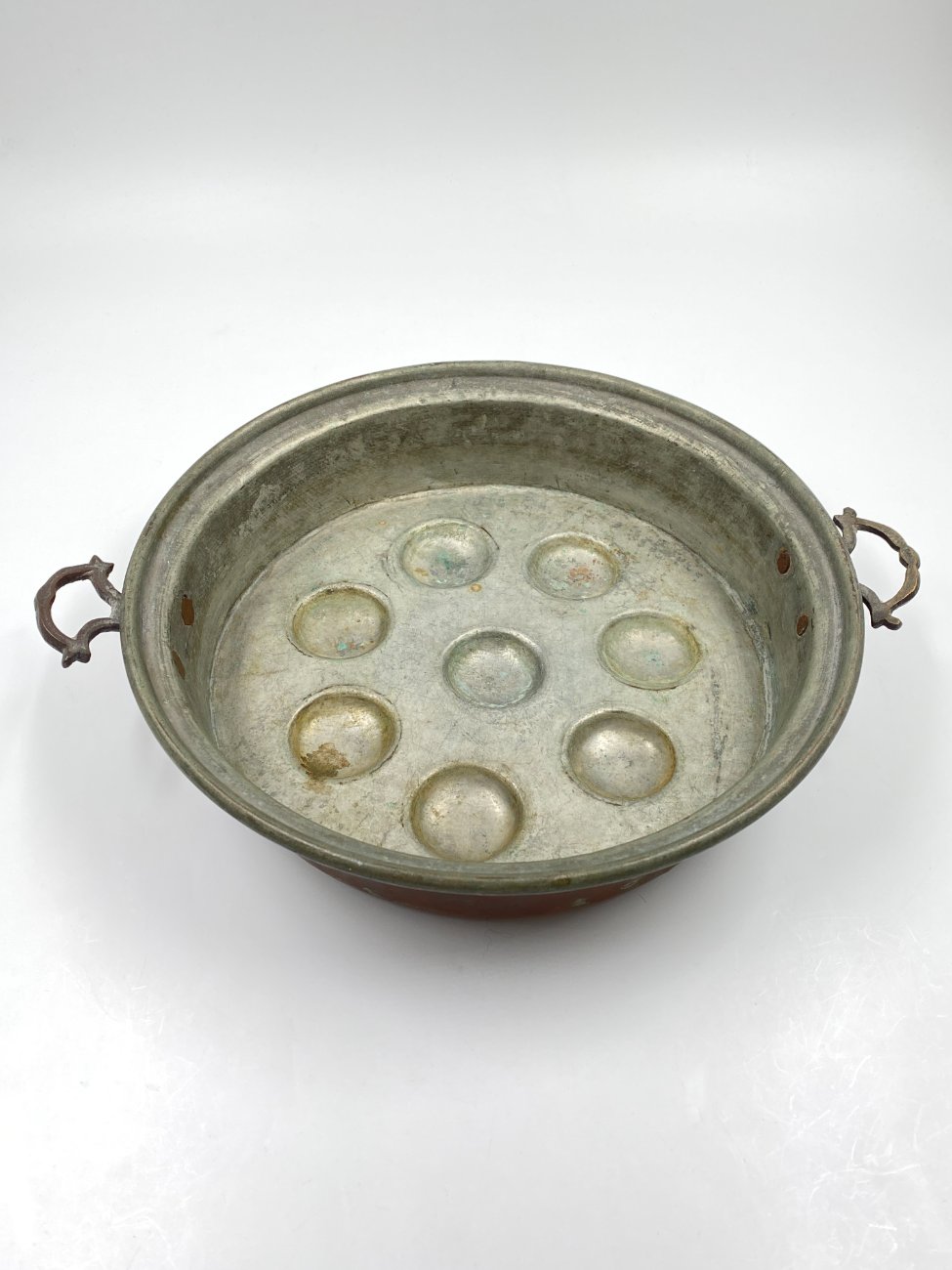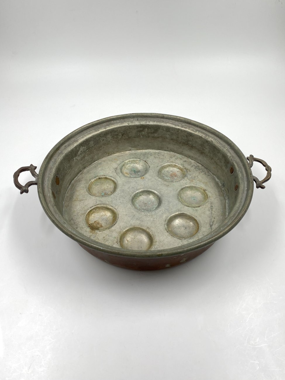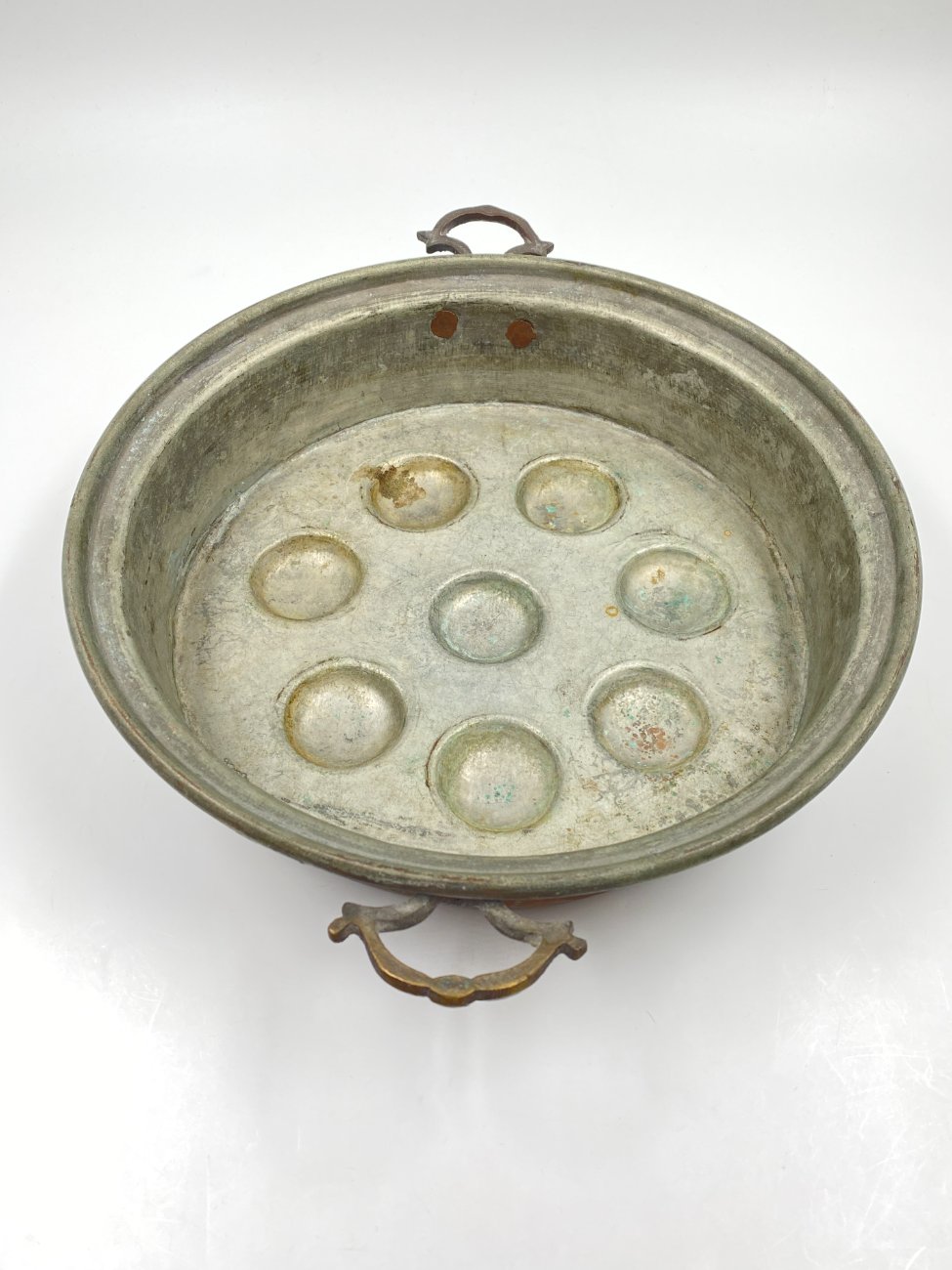 Metalinė sraigių keptuvė žalvarinėmis rankenomis.