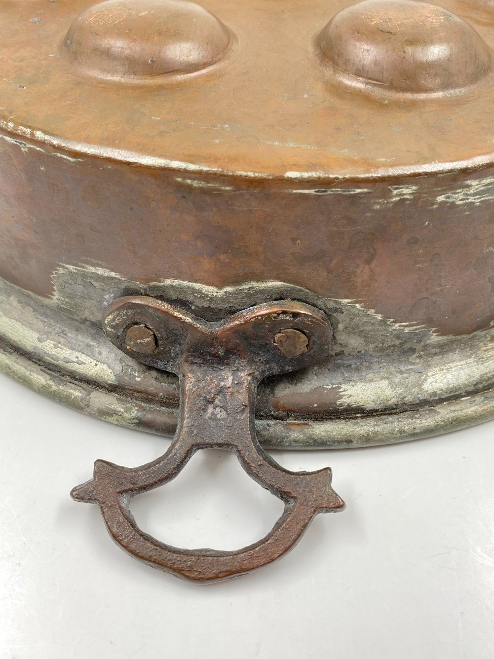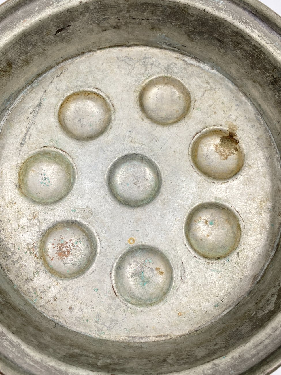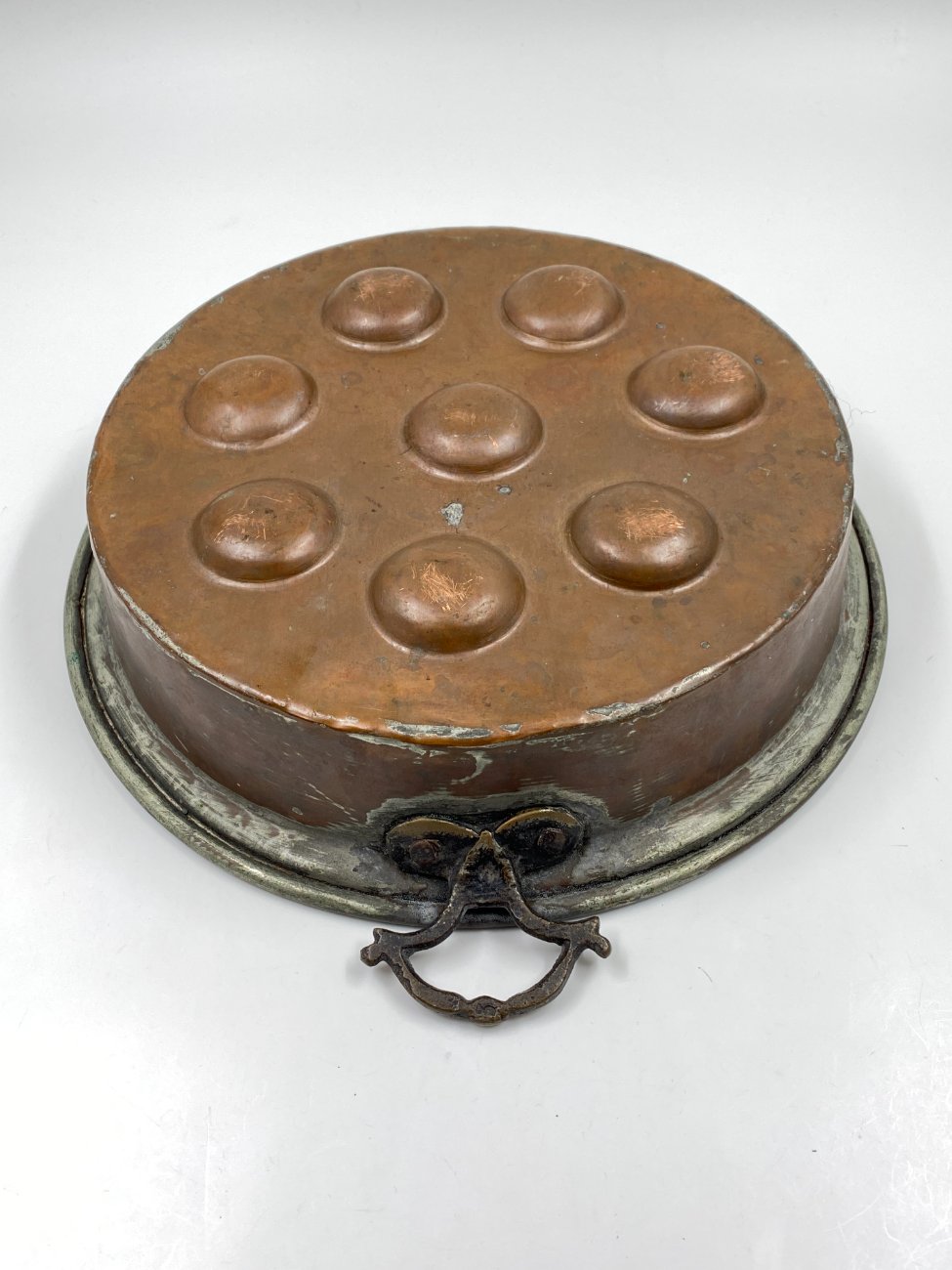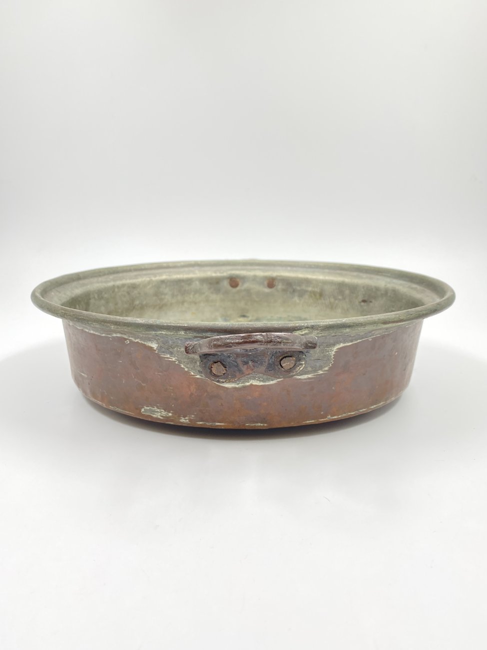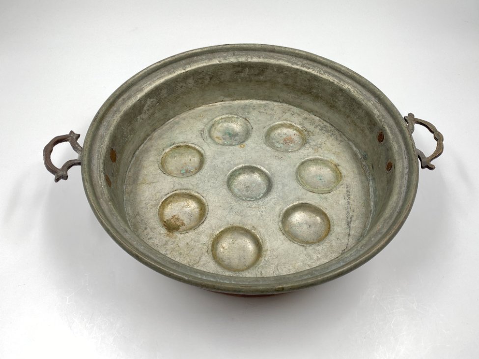 Metalinė sraigių keptuvė žalvarinėmis rankenomis.