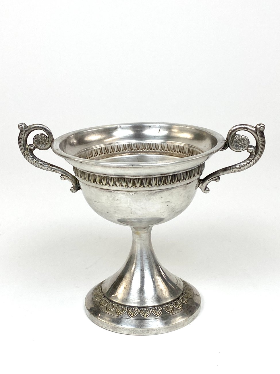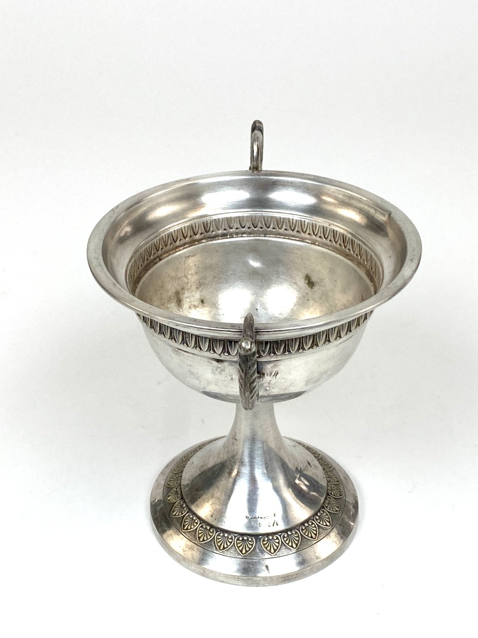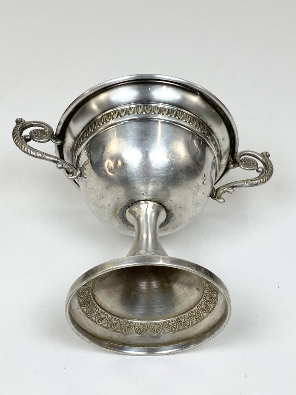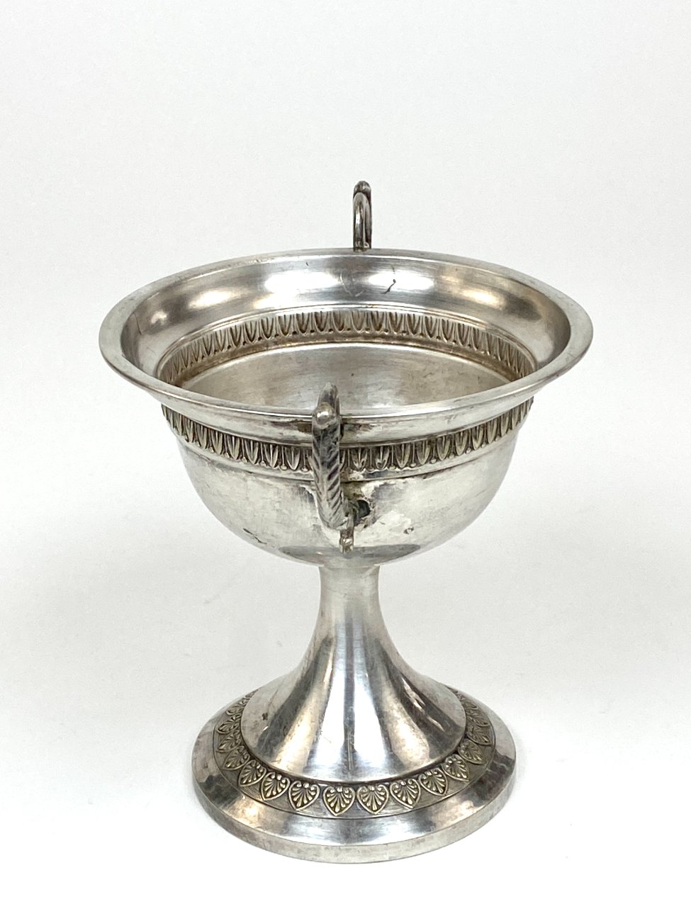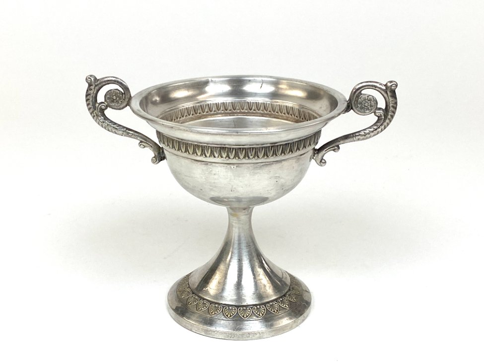 Sidabruoto metalo indas ant kojelės, su rankenomis iš šonų.