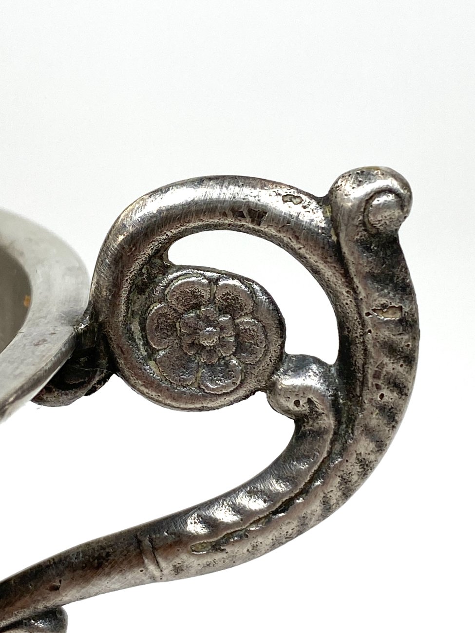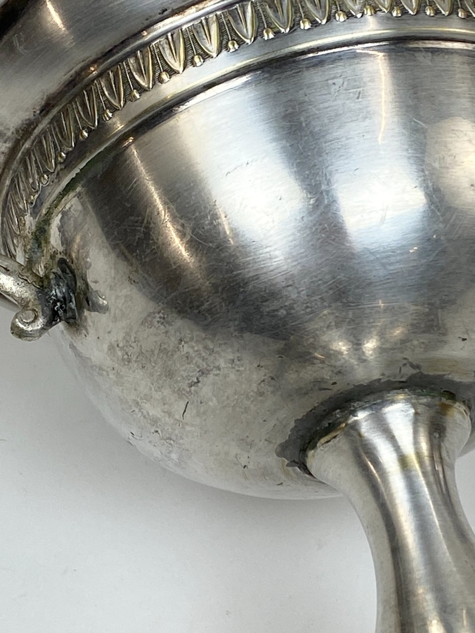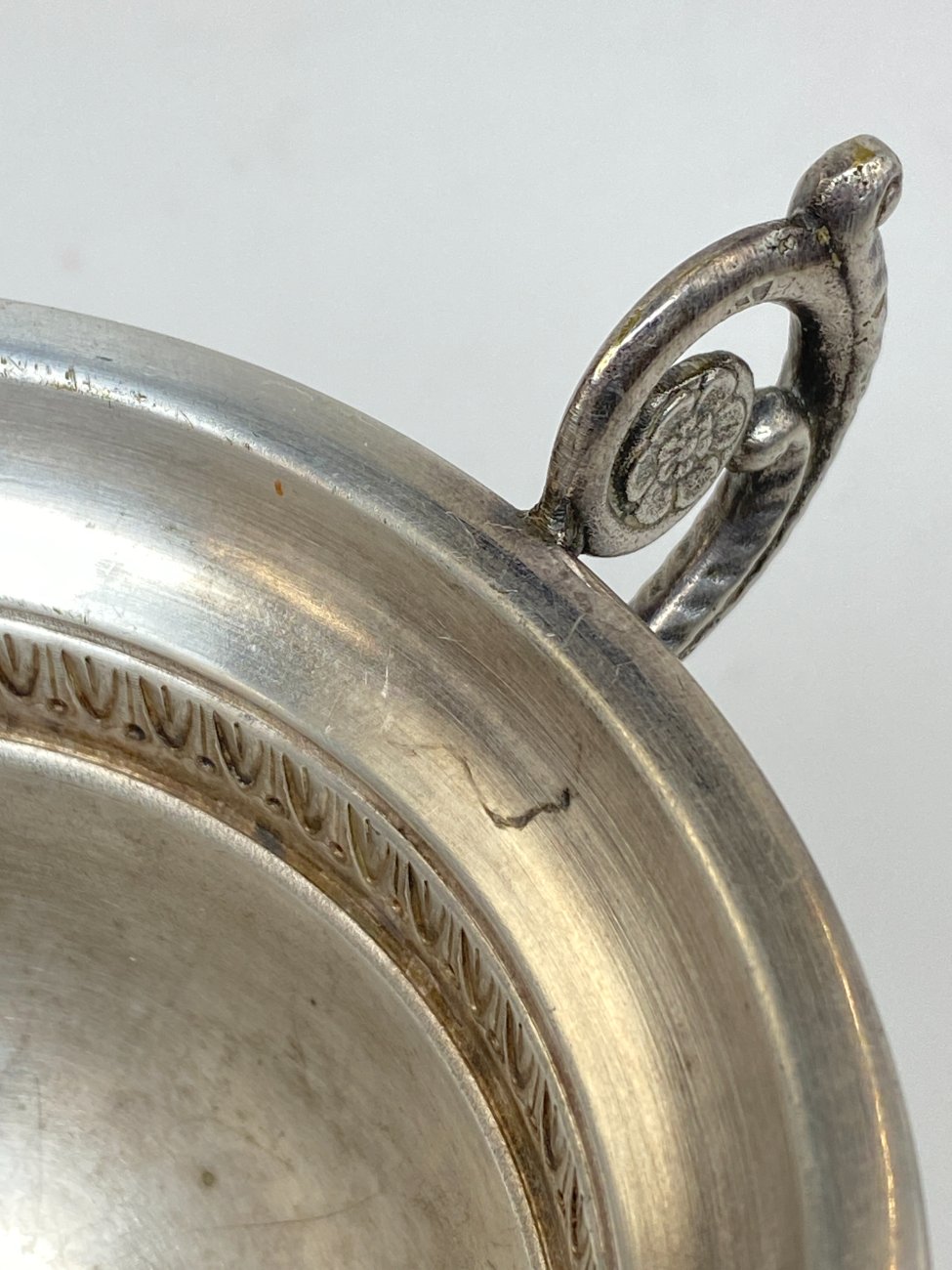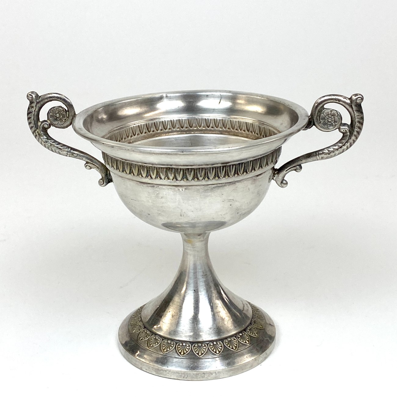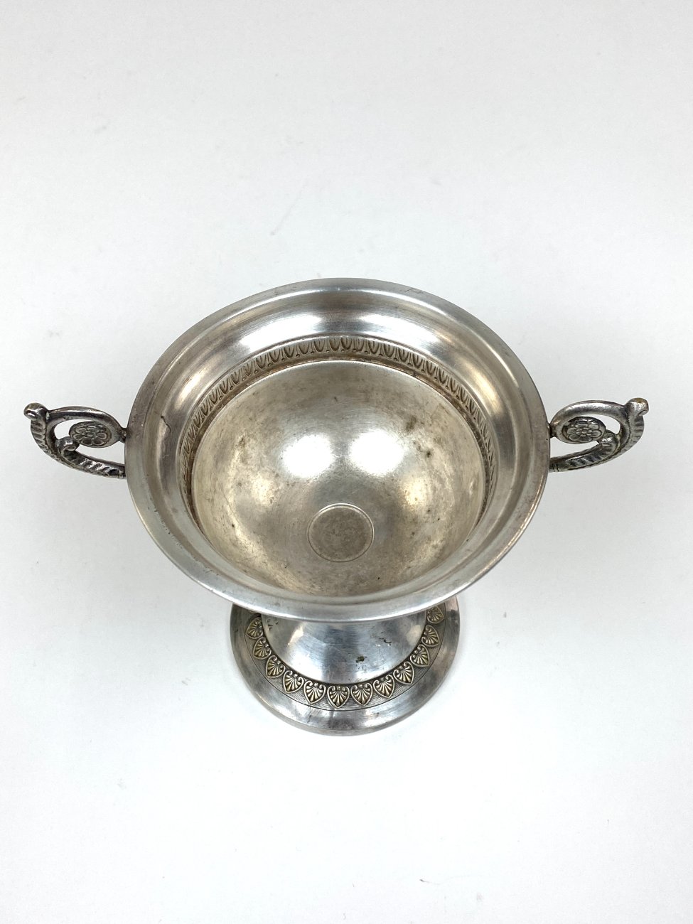 Sidabruoto metalo indas ant kojelės, su rankenomis iš šonų.