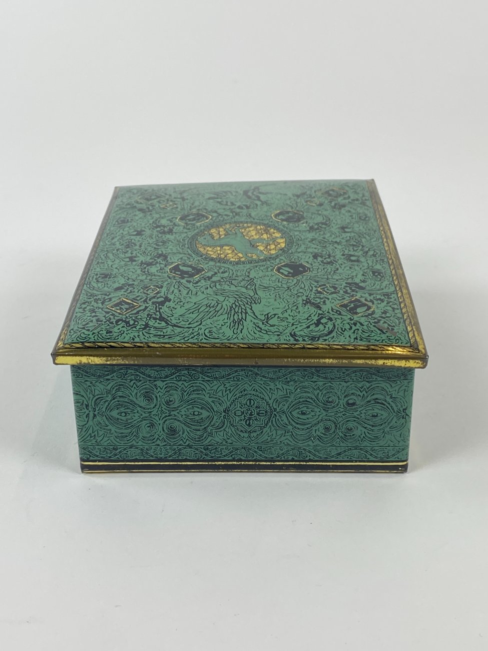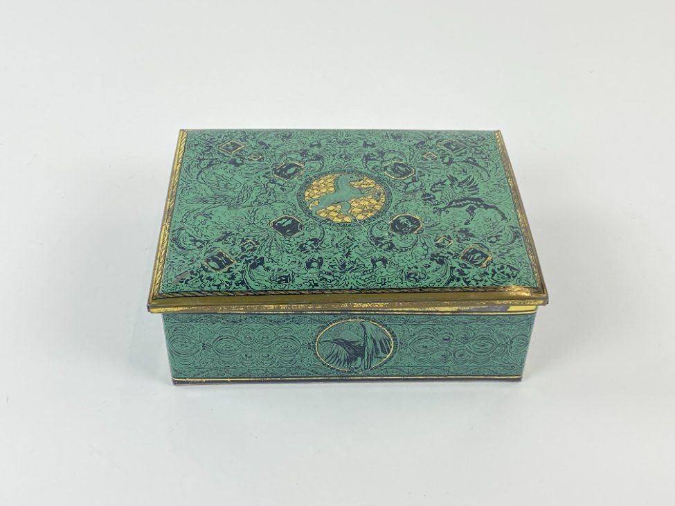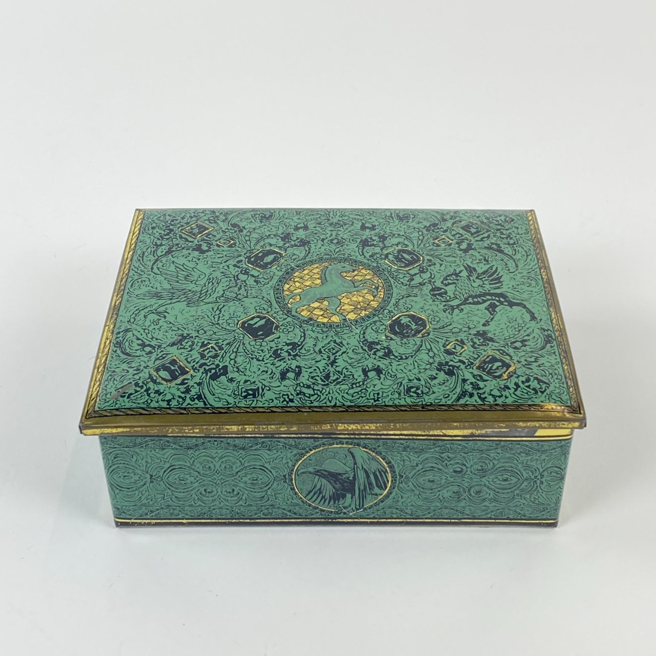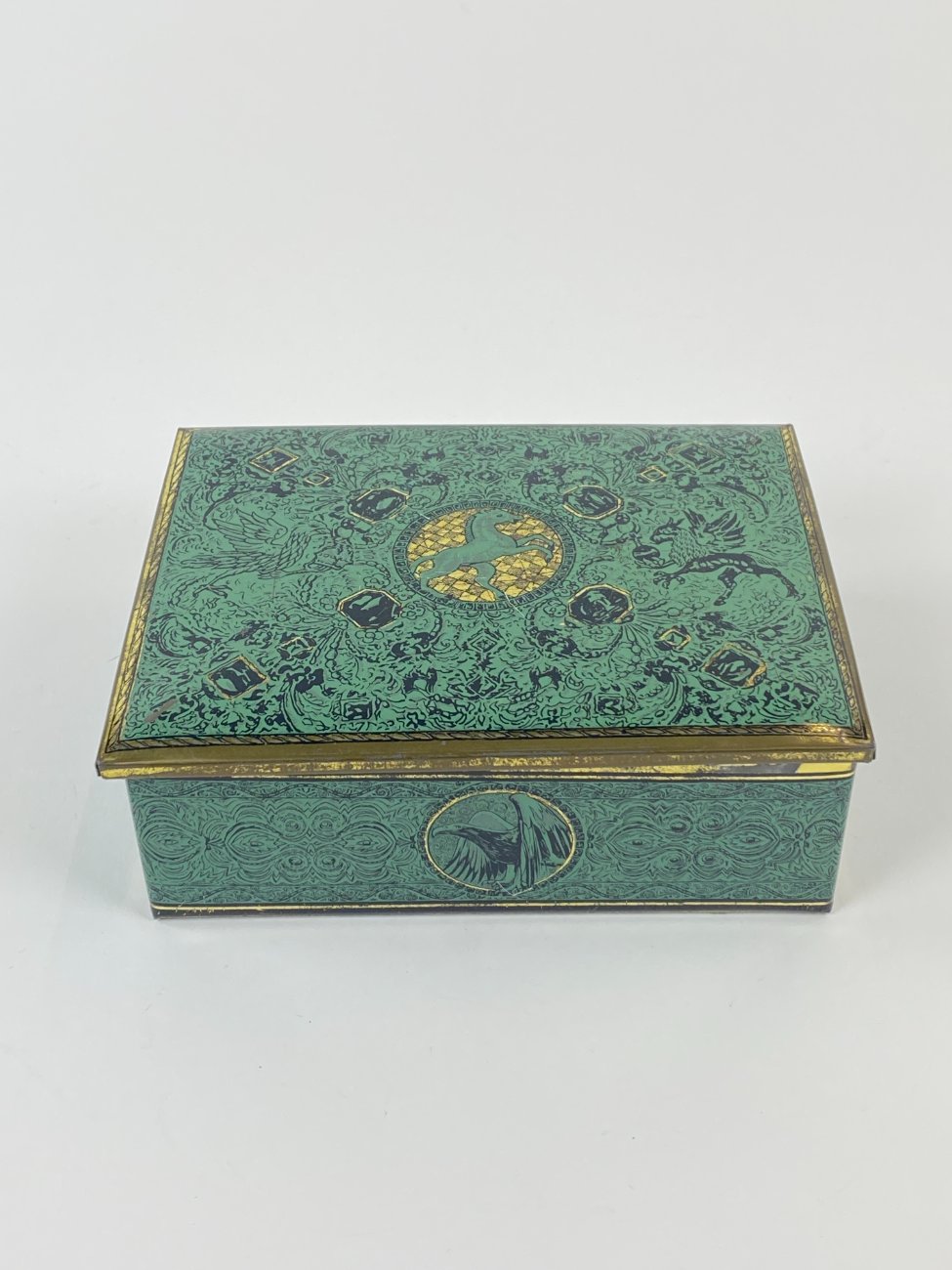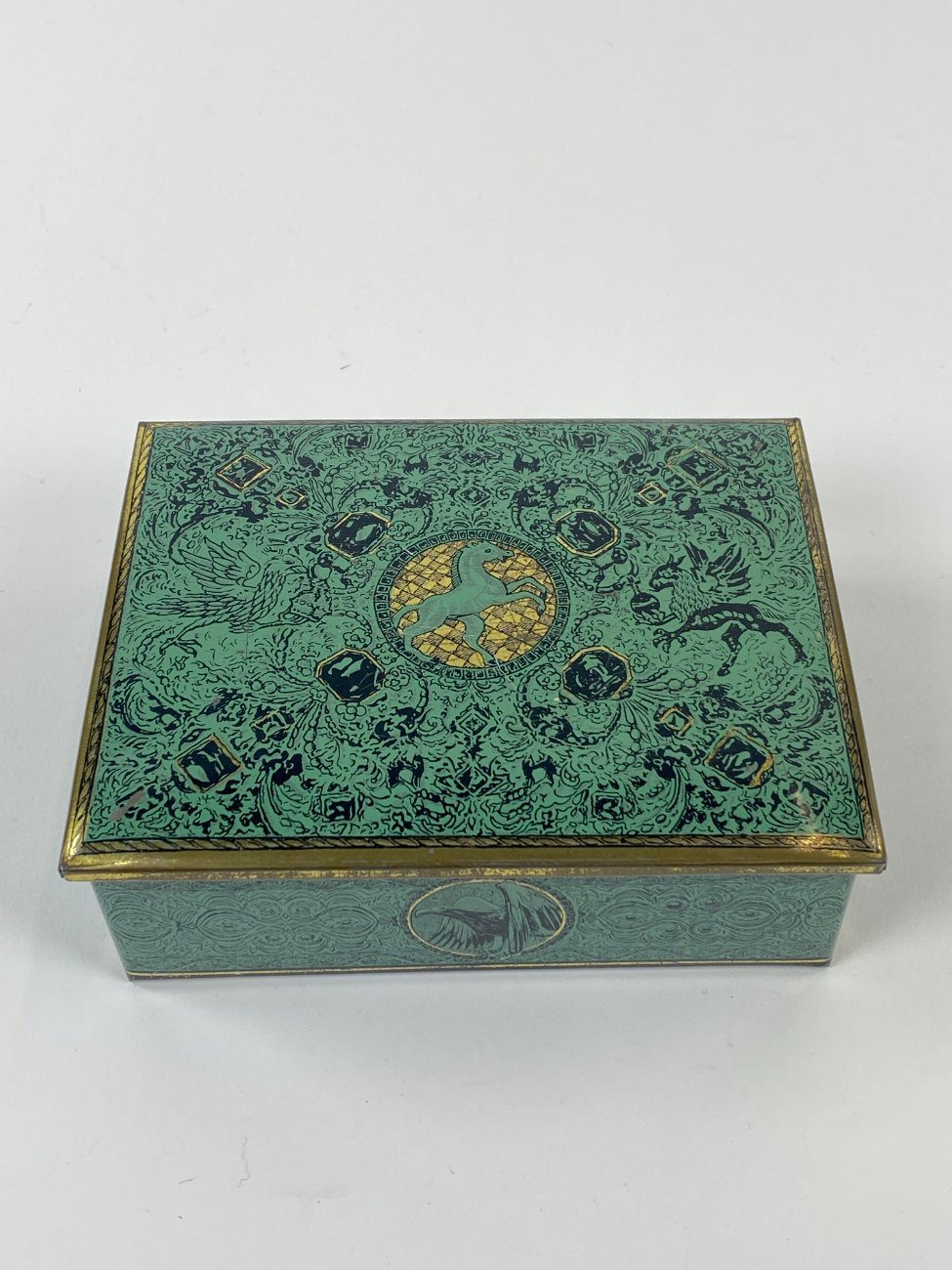 Vintažinė skardinė dėžutė su žirgų ir erelių atvaizdais 12,5x16x5,5 cm