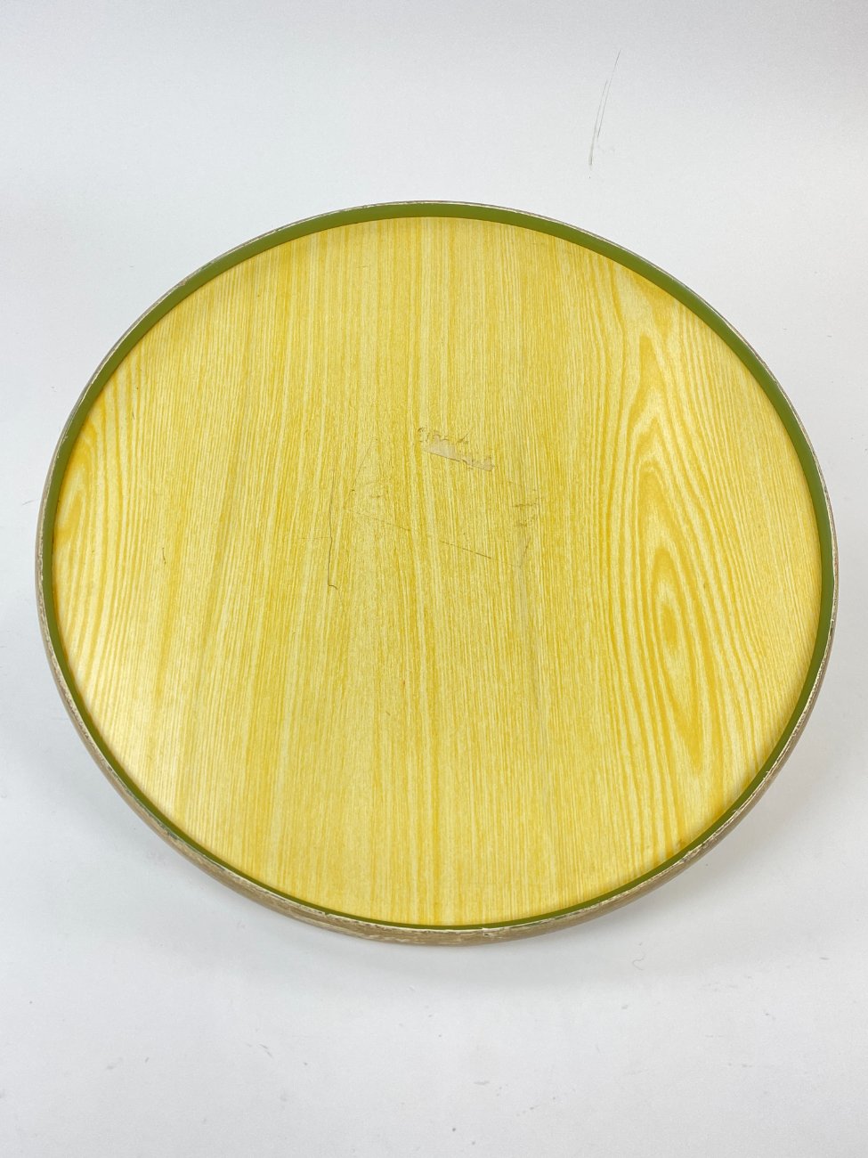 Apvalus pilkšvos spalvos padėklas.