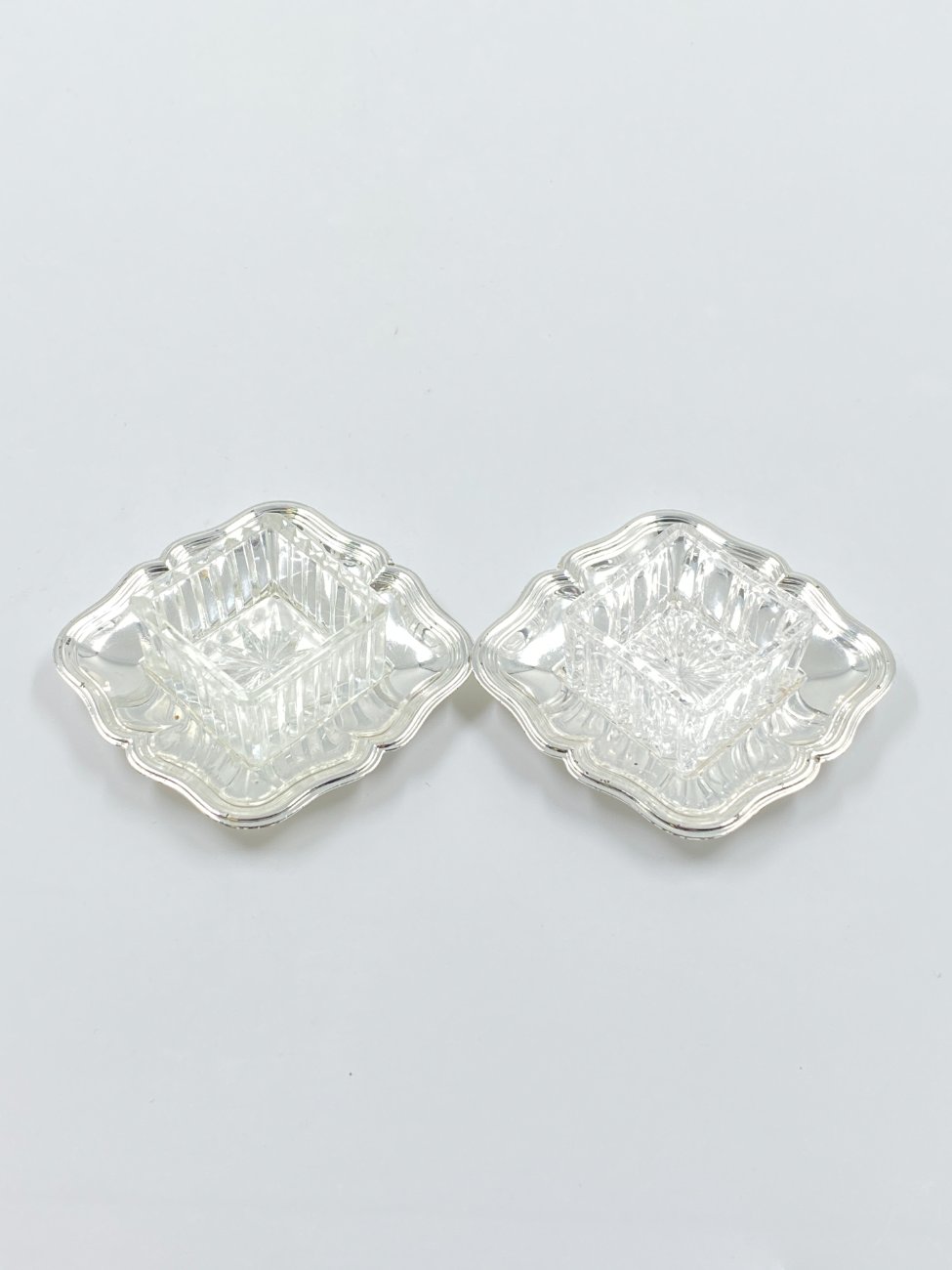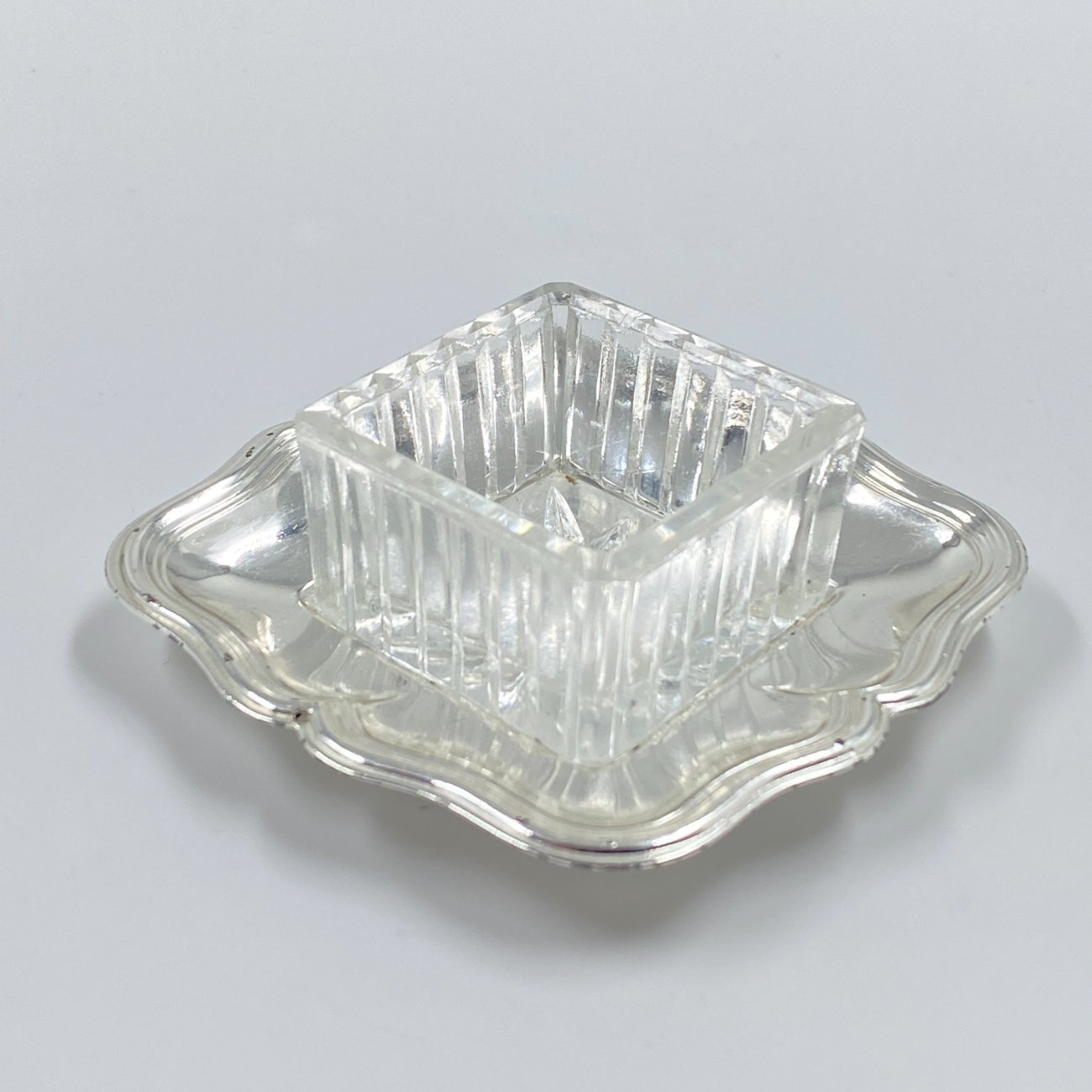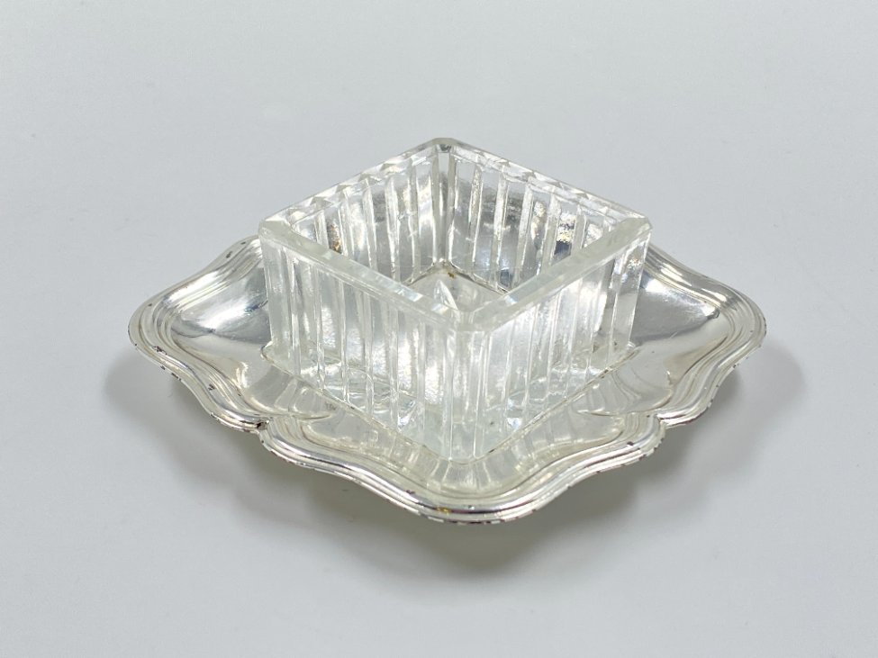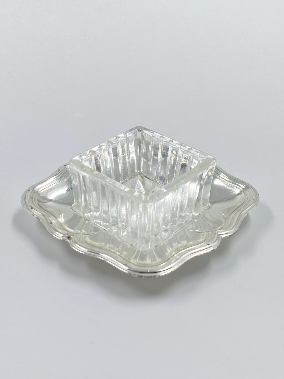 Stiklinis indelis su sidabruoto metalo padėkliuku.