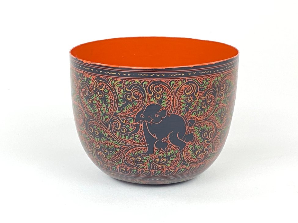 Tradicinis Mianmaro dubenėlis su dramblio atvaizdais.