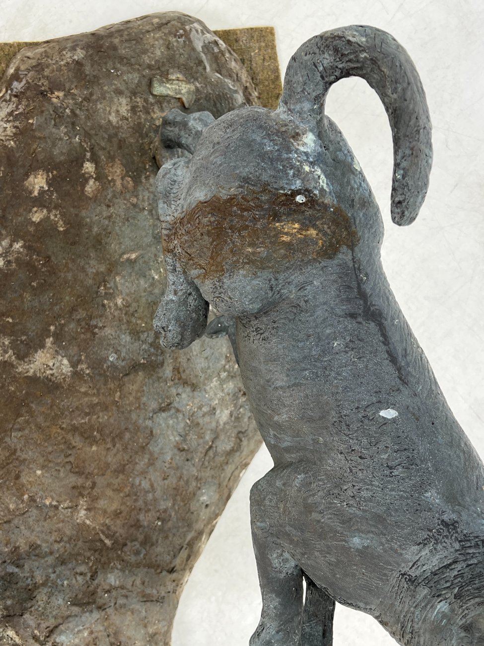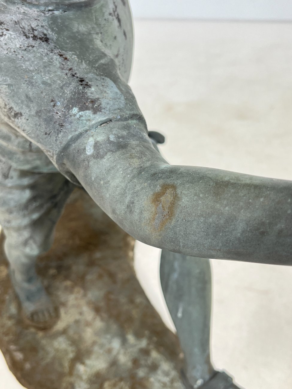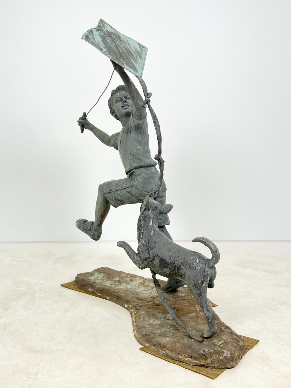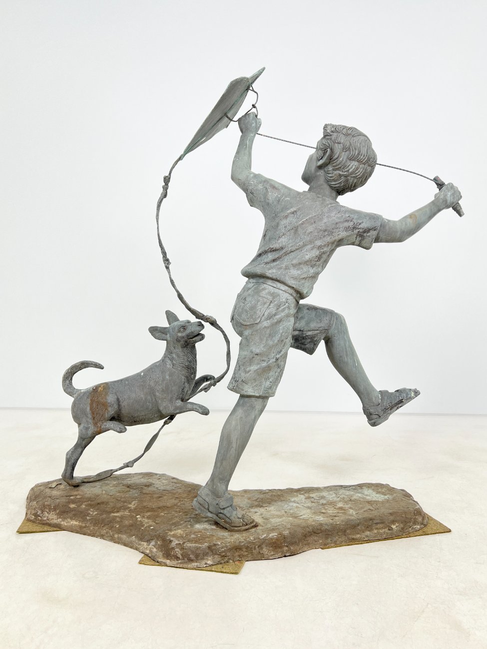 Bronzinė berniuko su aitvaru ir šuniu statula.