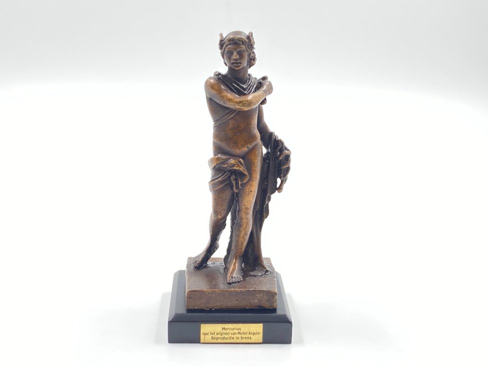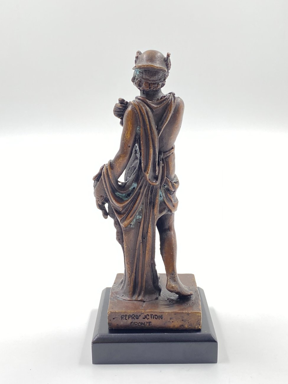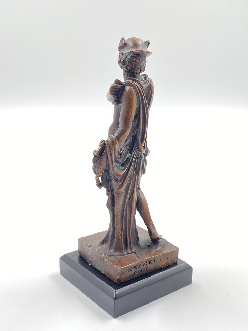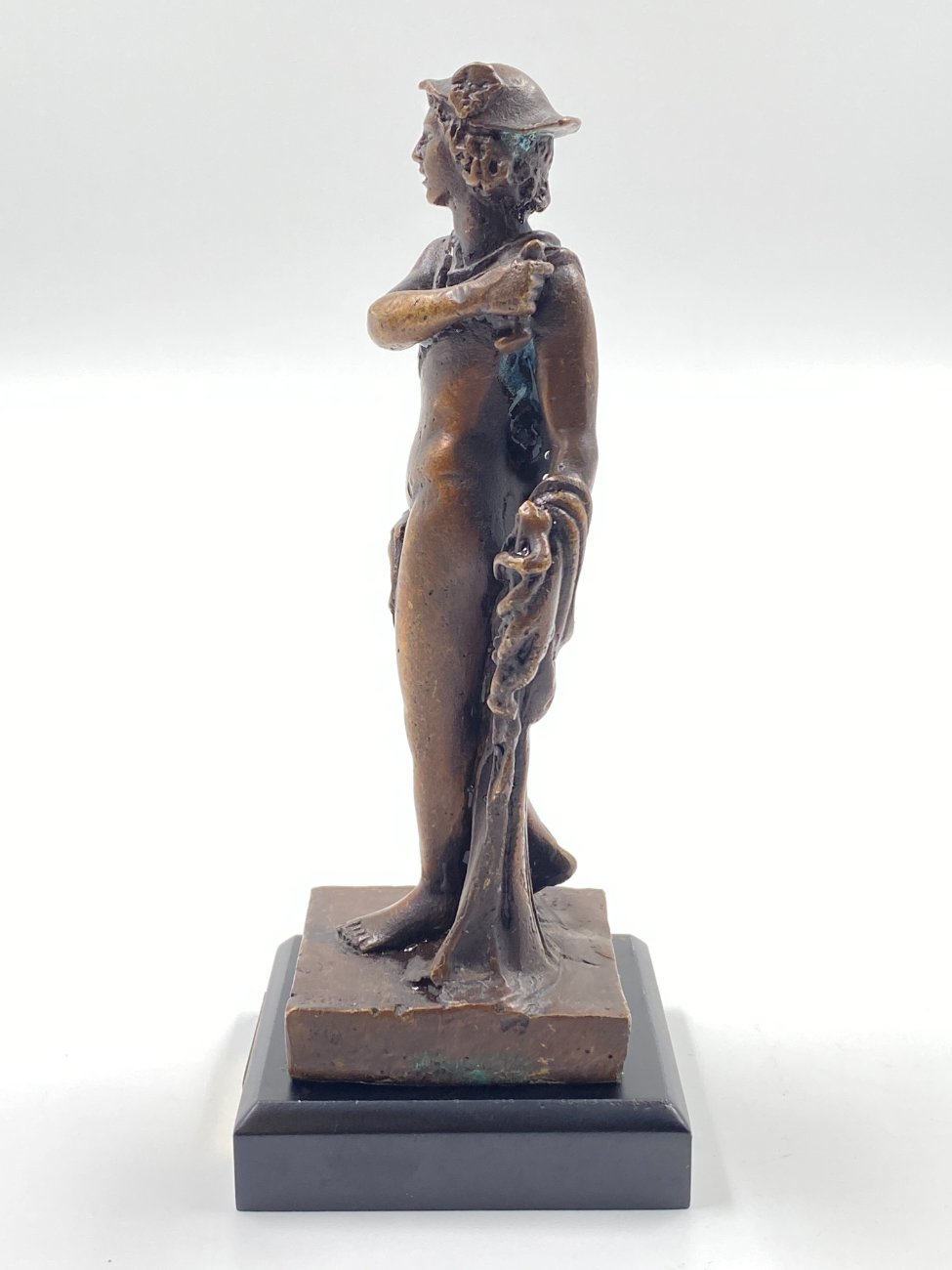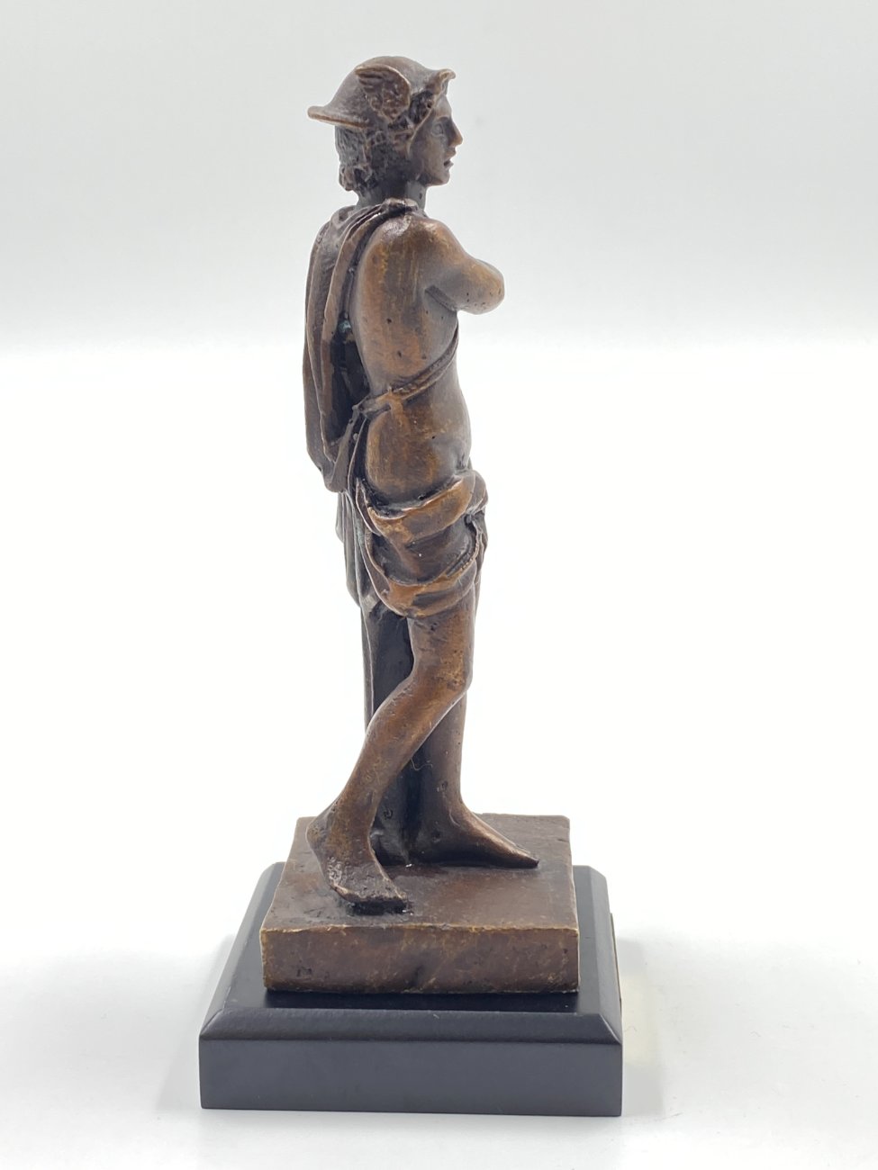 Bronzinė Merkurijaus statula ant medinio postamento 6,5×6,5×16 cm