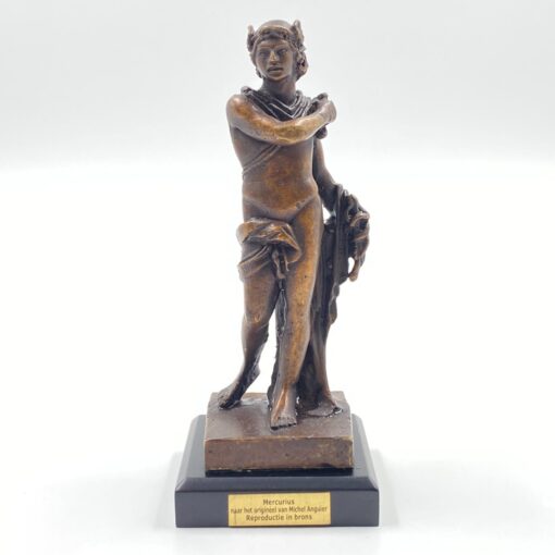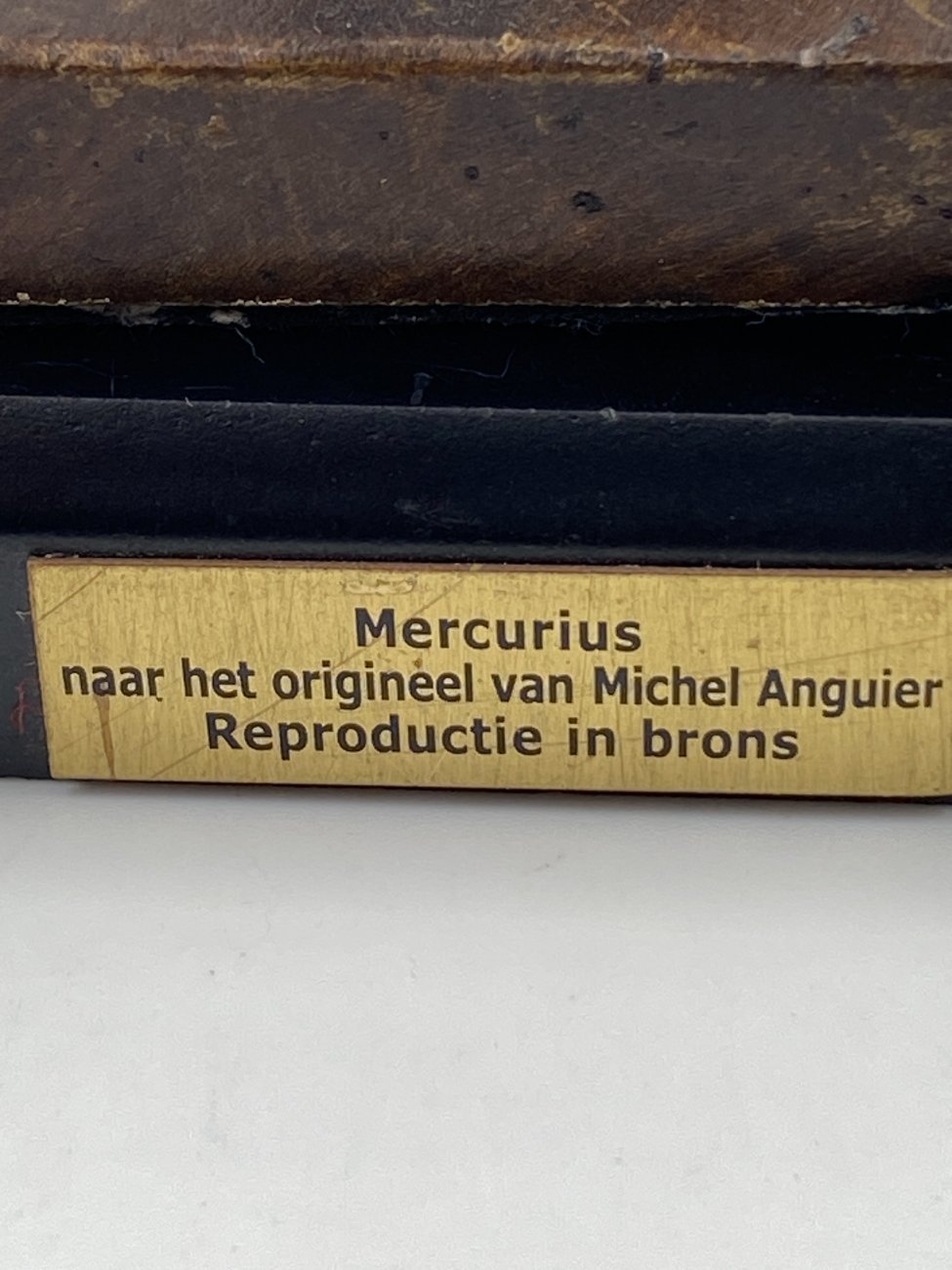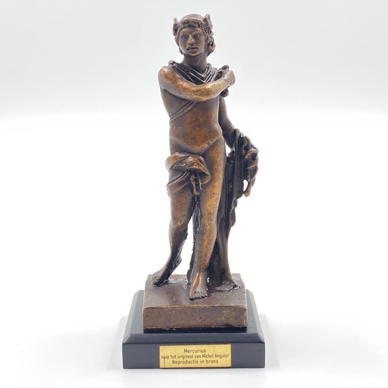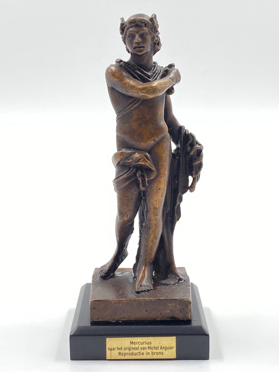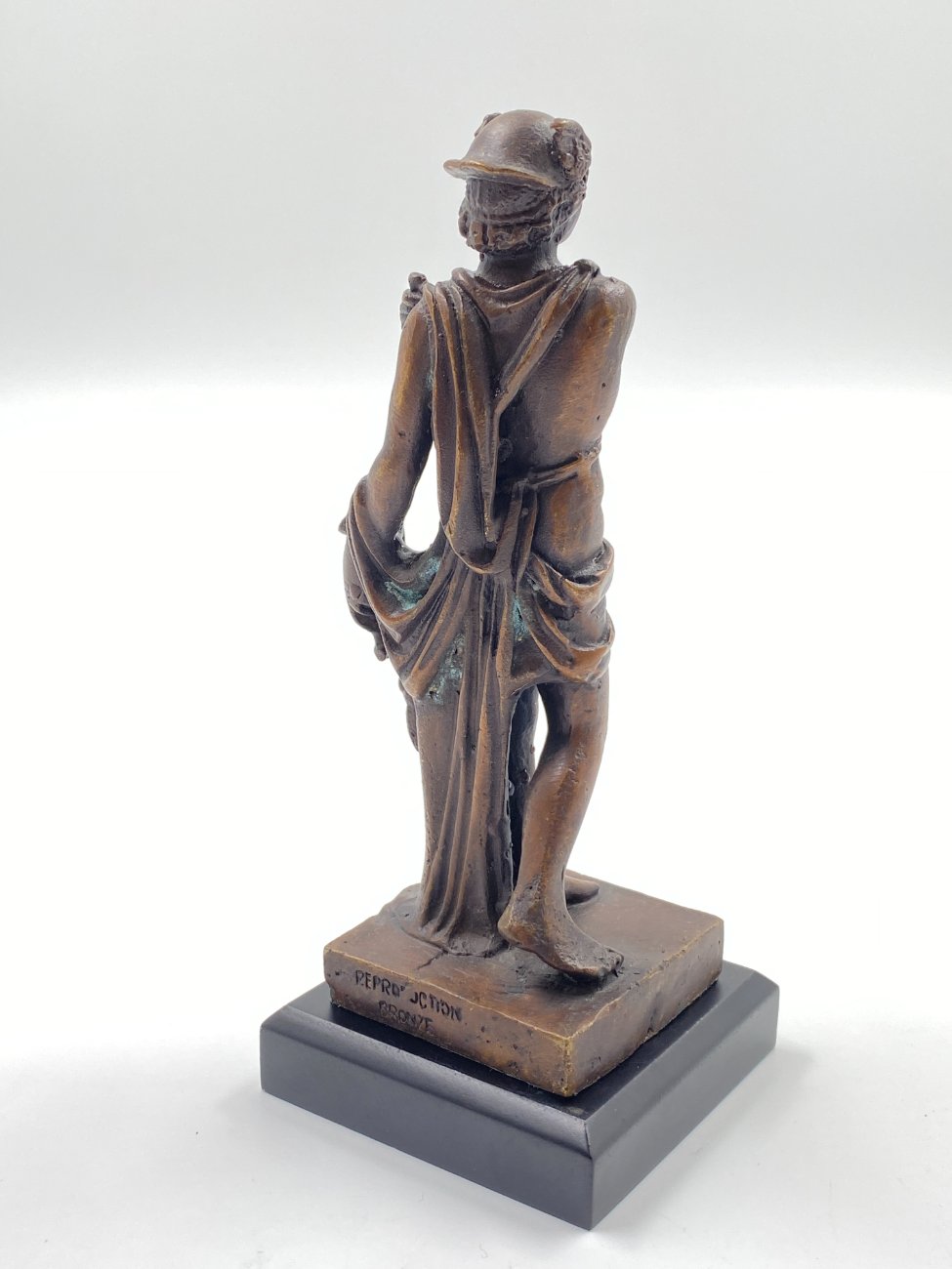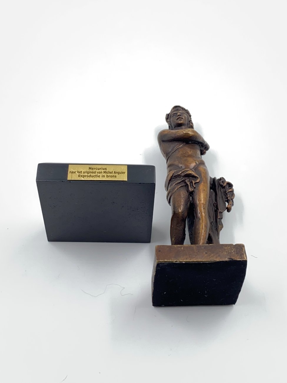 Bronzinė Merkurijaus statula ant medinio postamento 6,5×6,5×16 cm