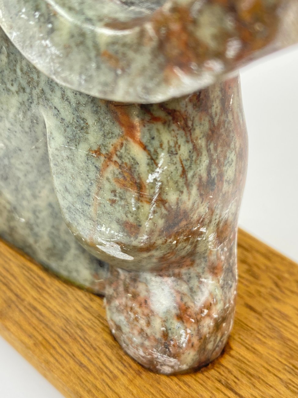 Dramblio statulėlė iš muilo akmens ant medinio postamento.