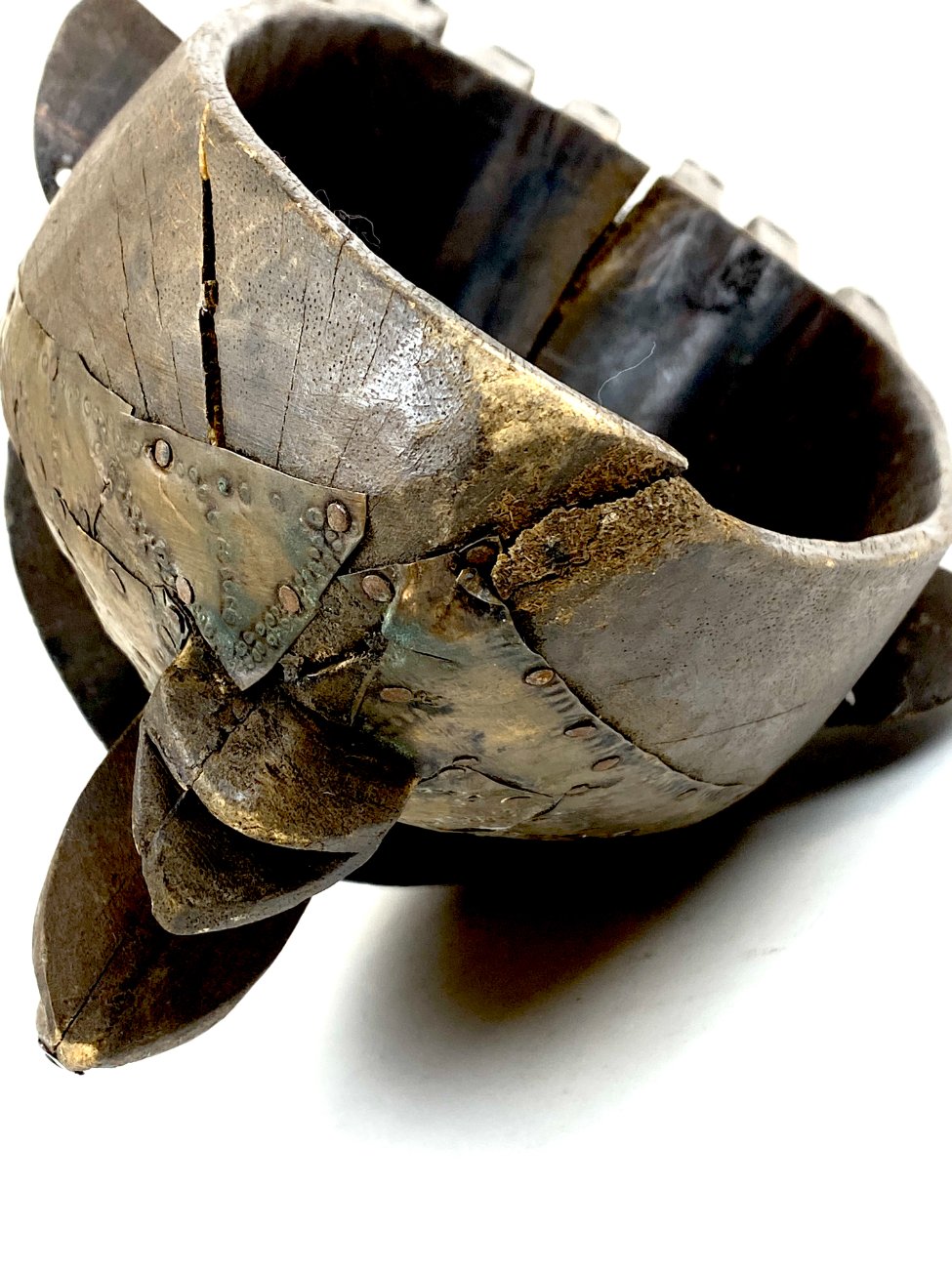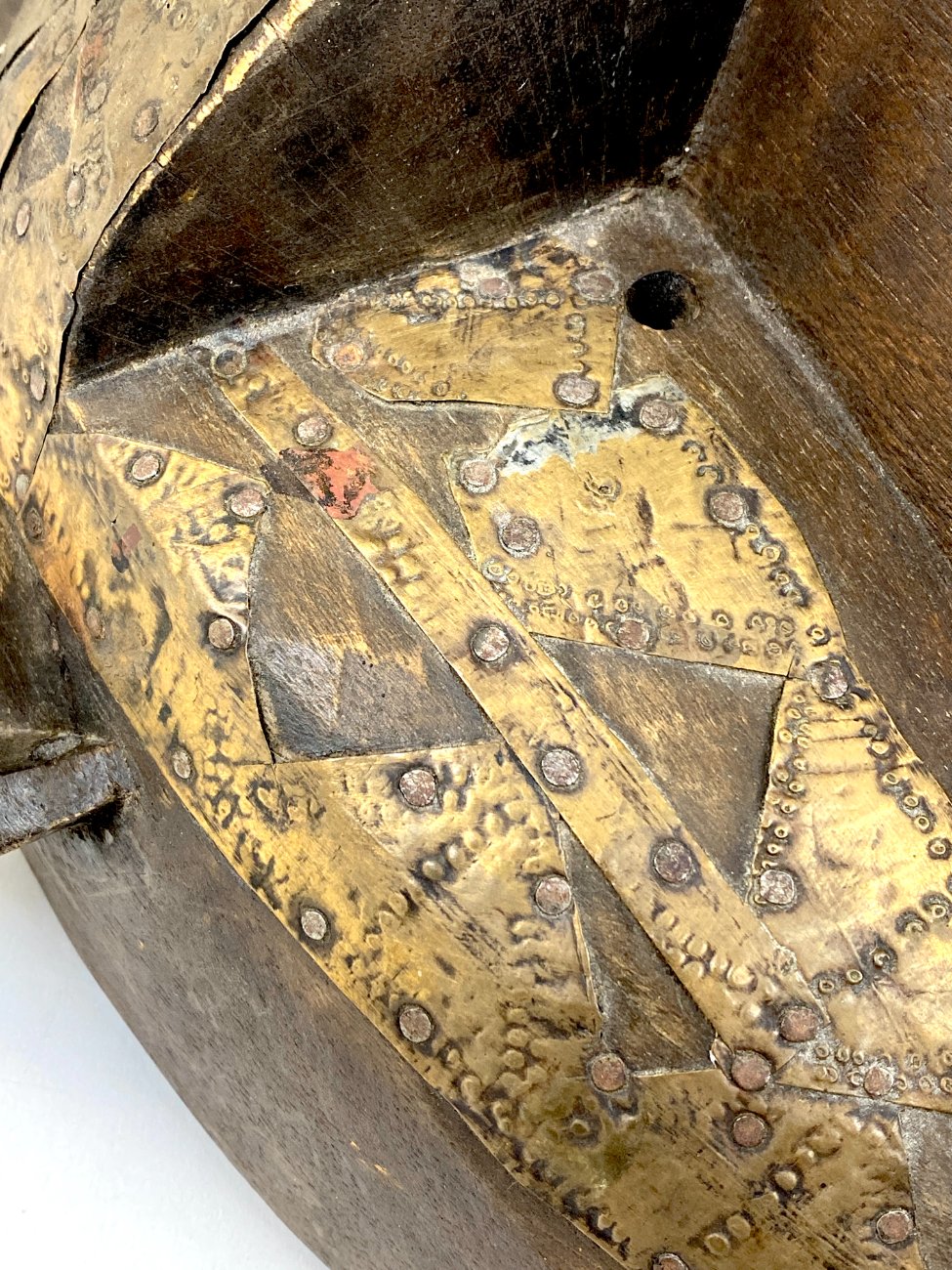 Apeiginė Bamana N’tomo medinė kaukė su žalvario apdailomis. Tikėtina kilmės šalis – Malis.