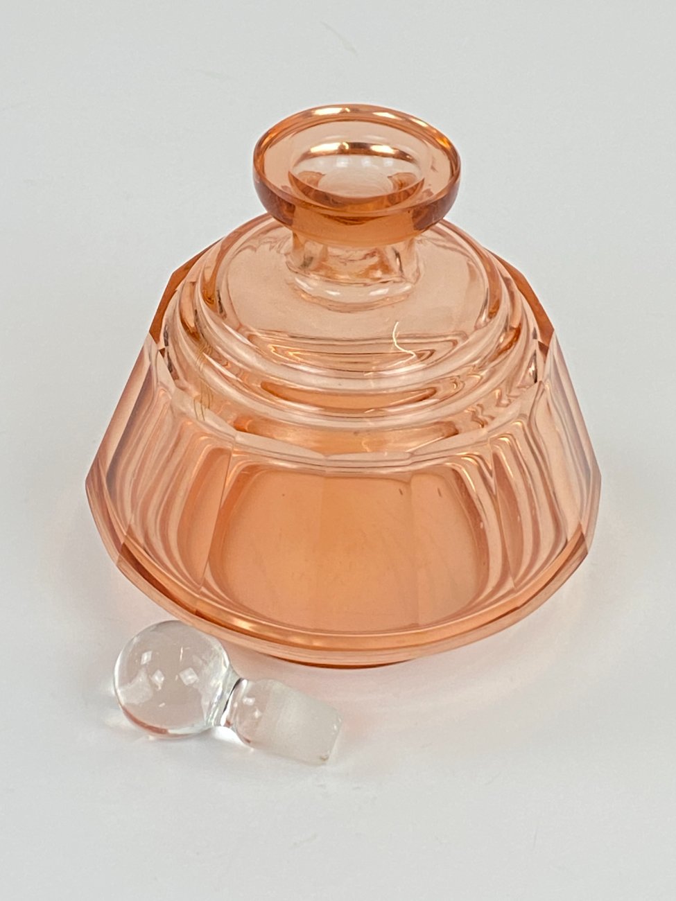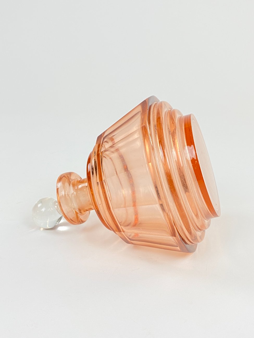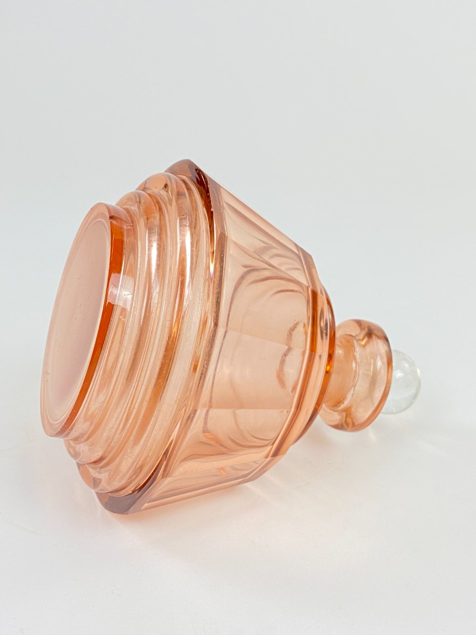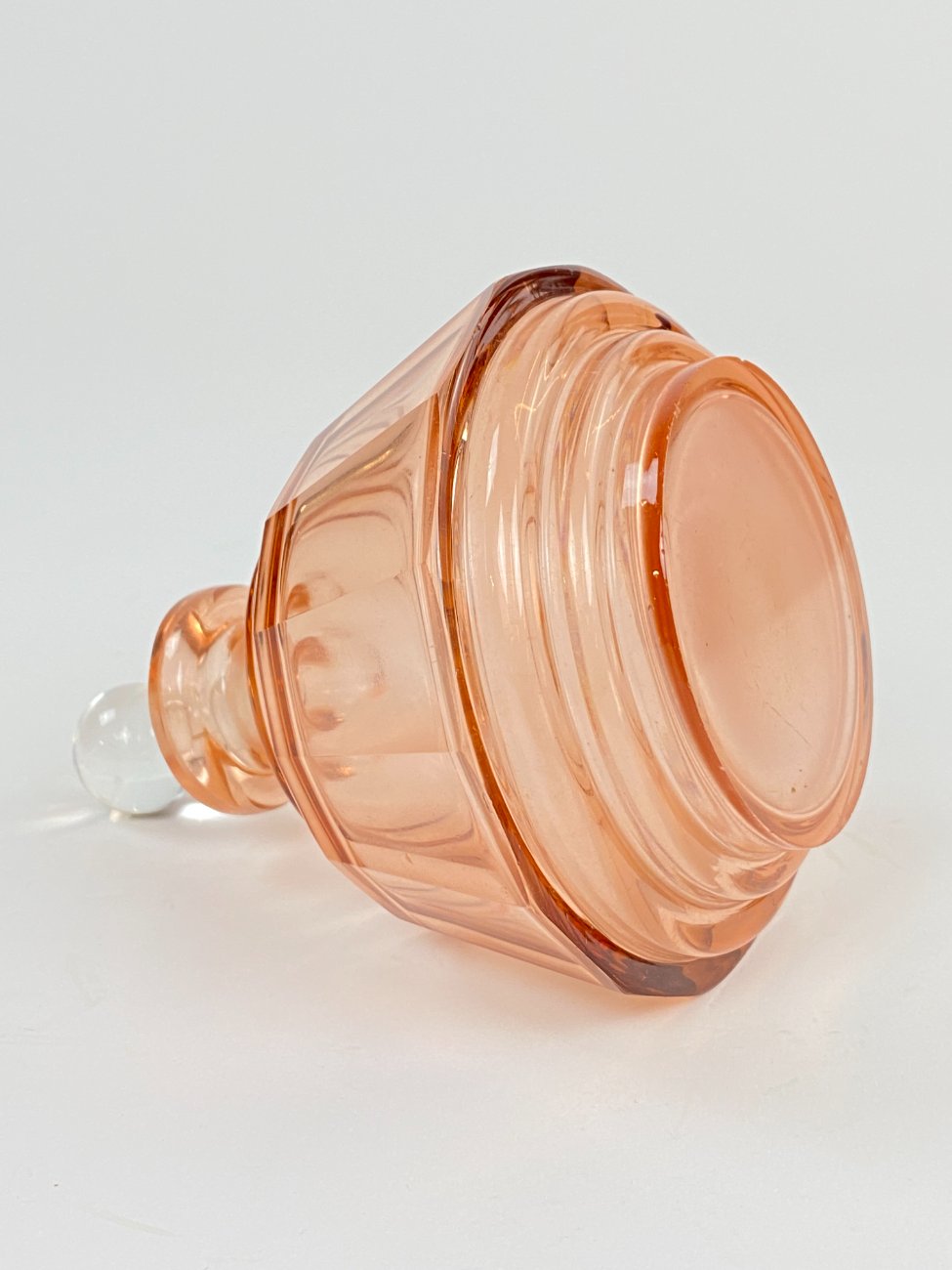 Stiklinis miniatiūrinis rožinės spalvos grafinas.