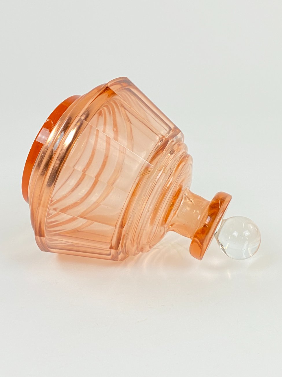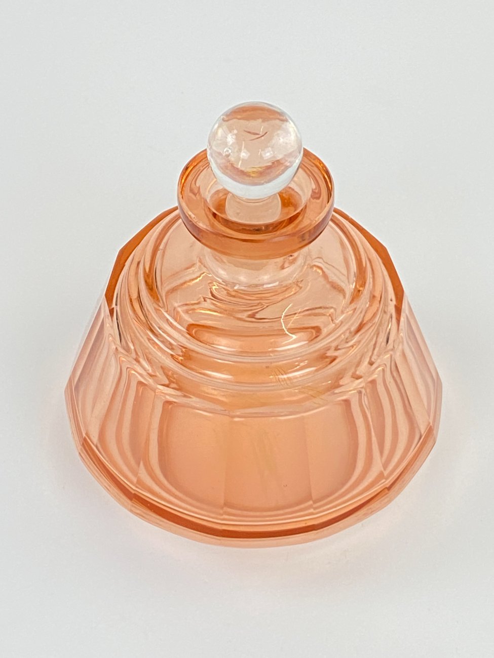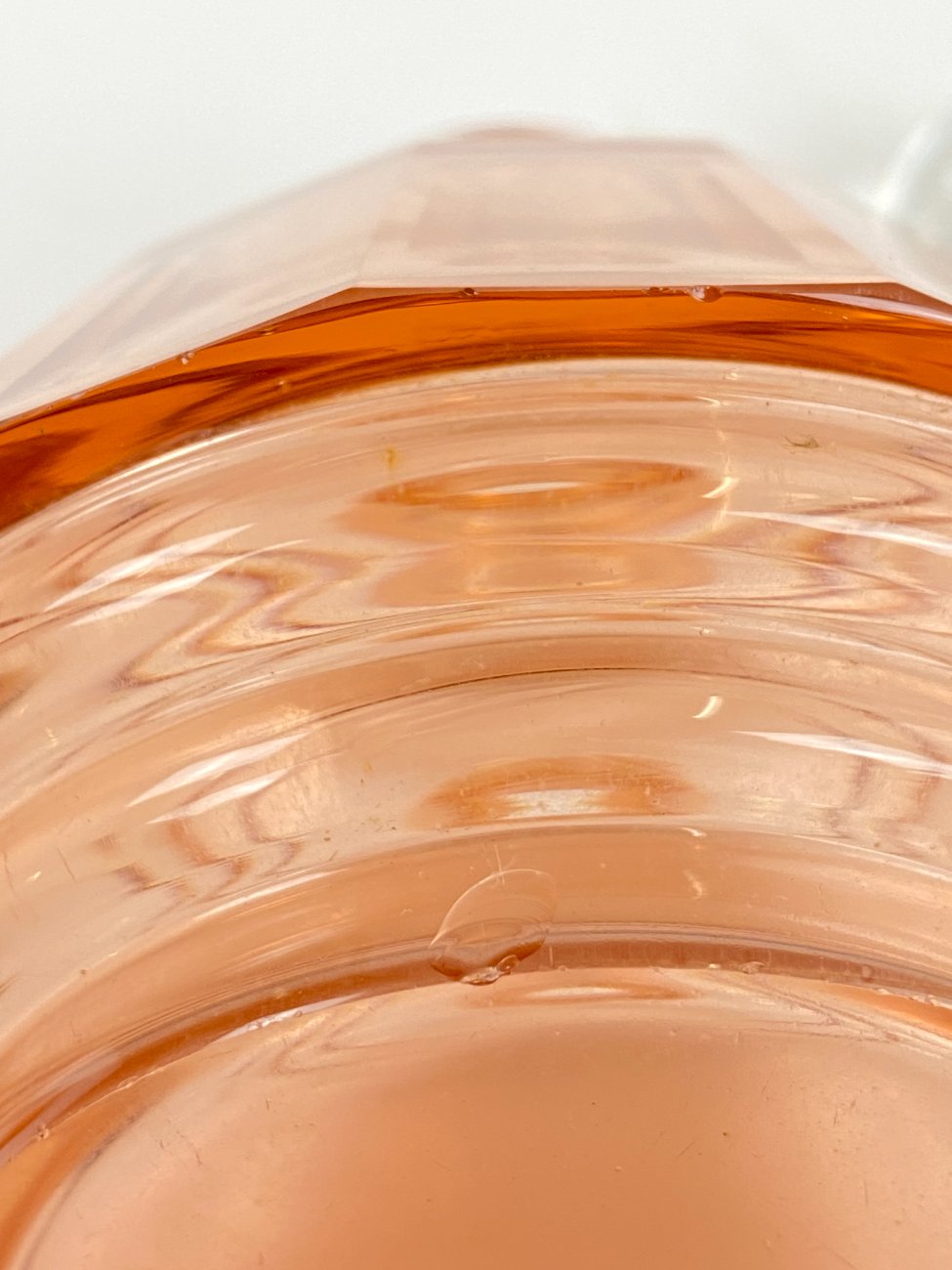 Stiklinis miniatiūrinis rožinės spalvos grafinas.