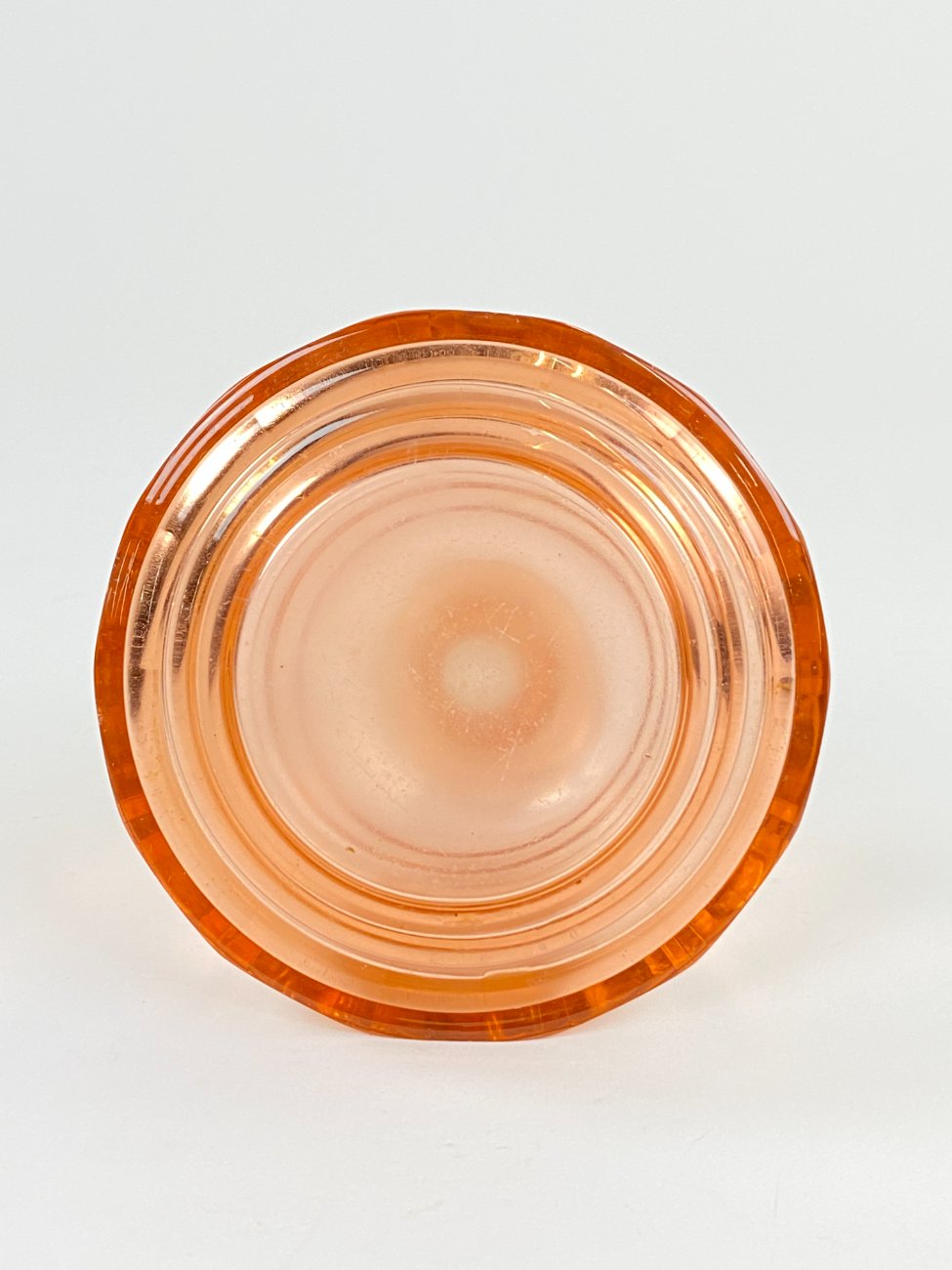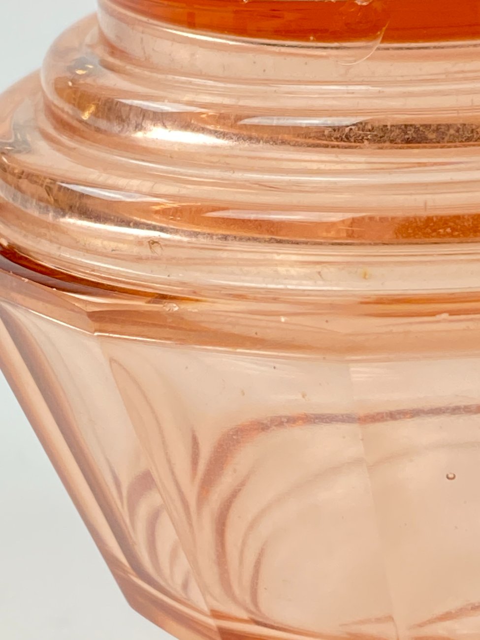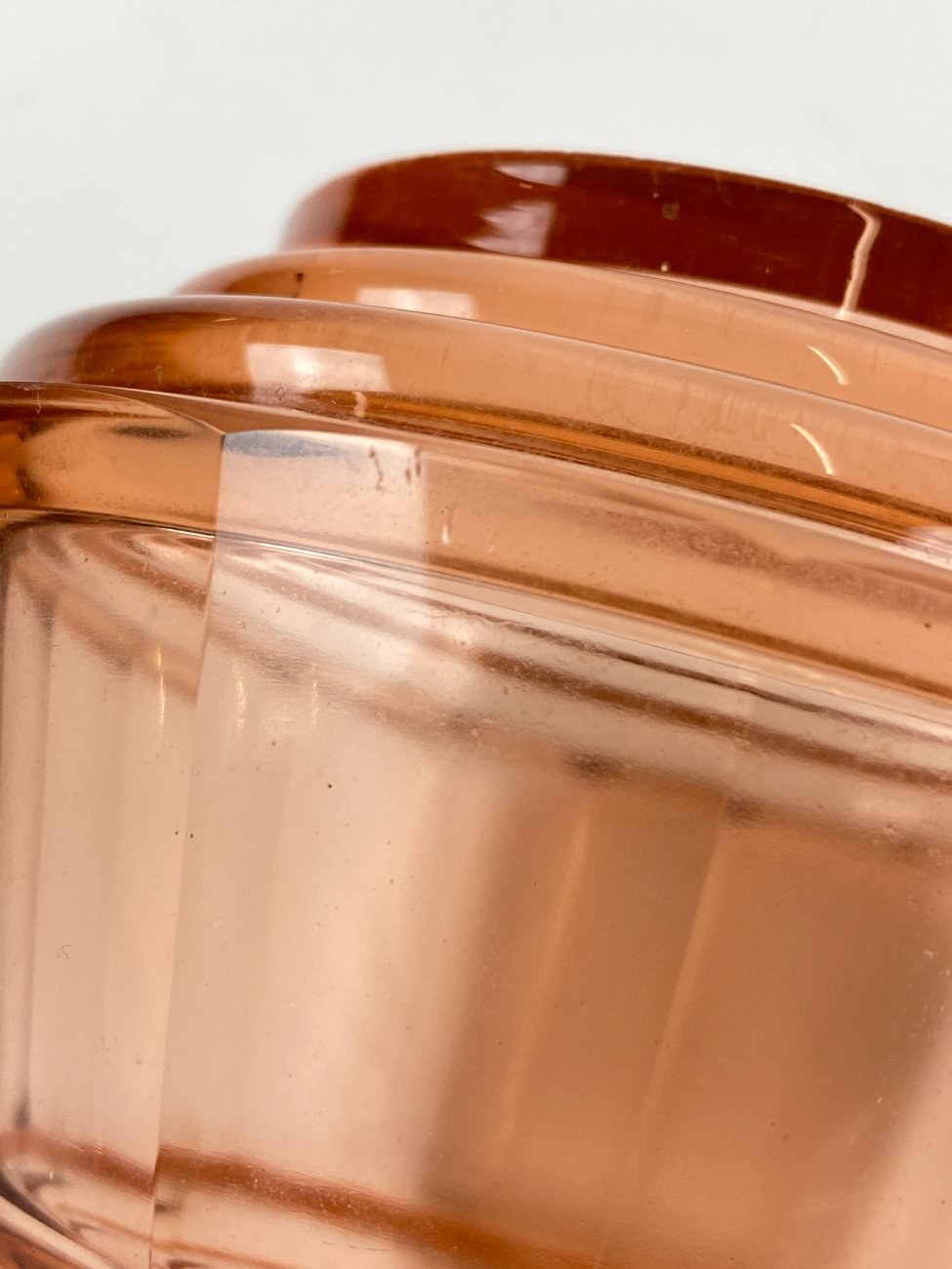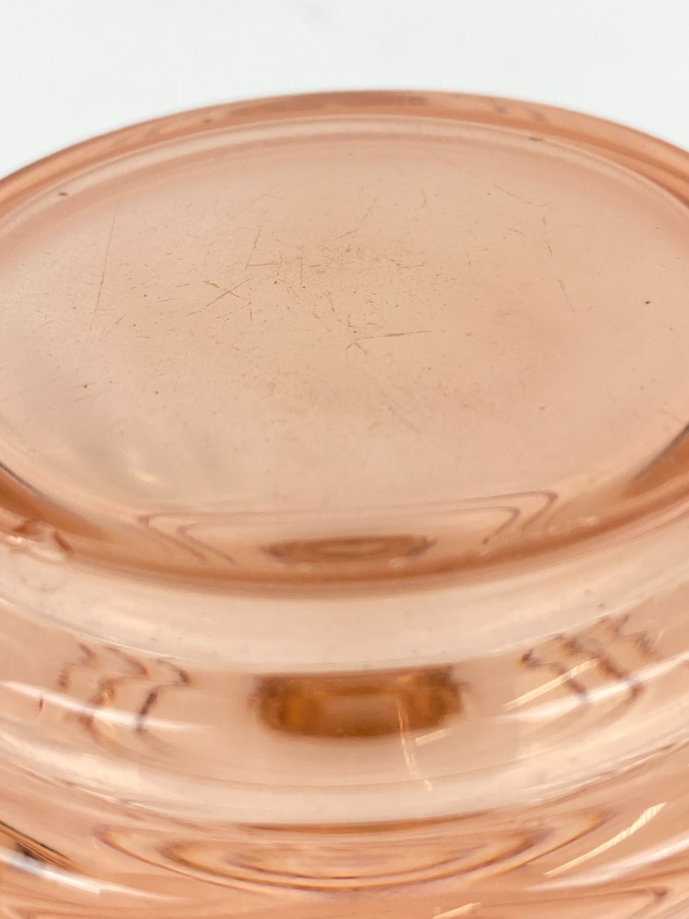 Stiklinis miniatiūrinis rožinės spalvos grafinas.