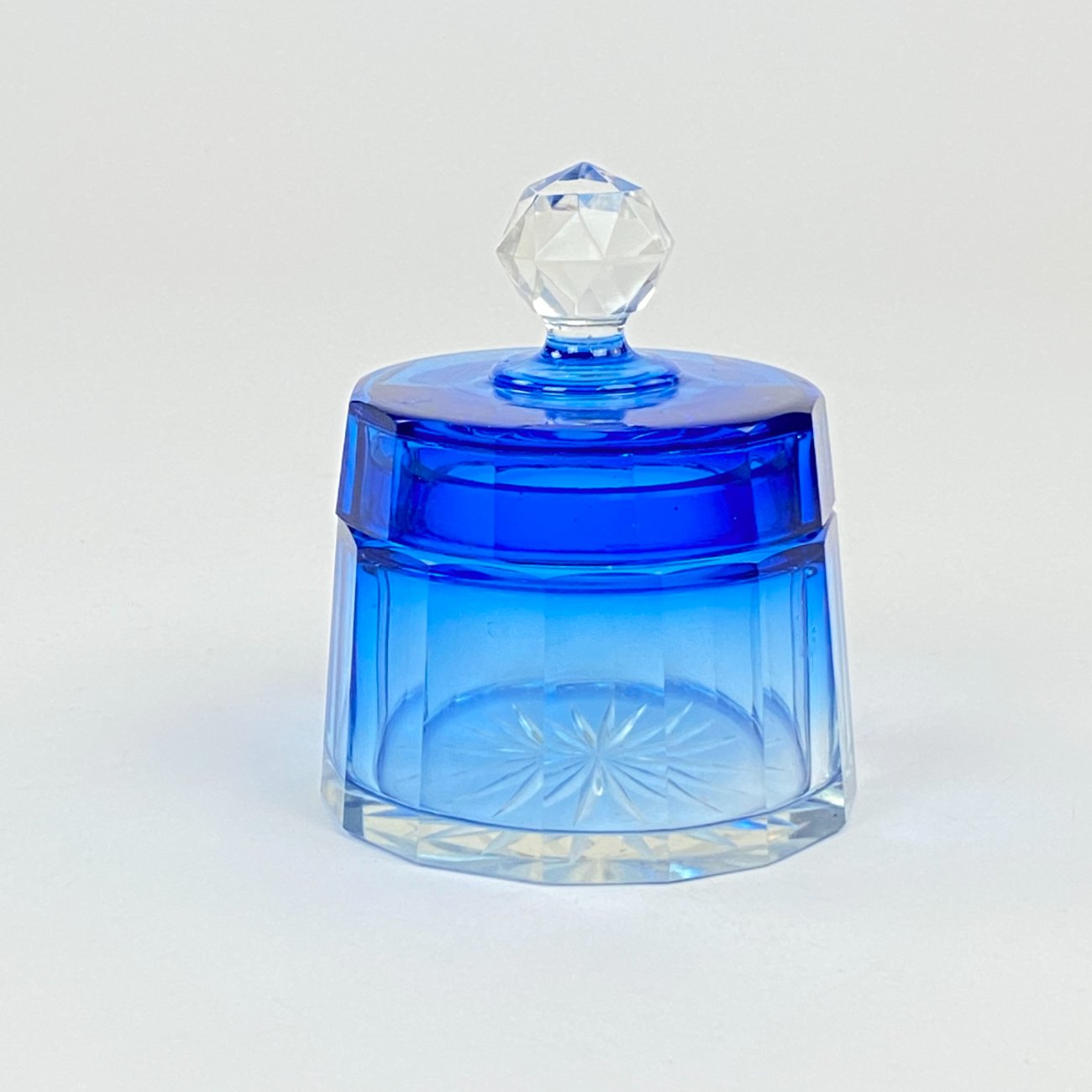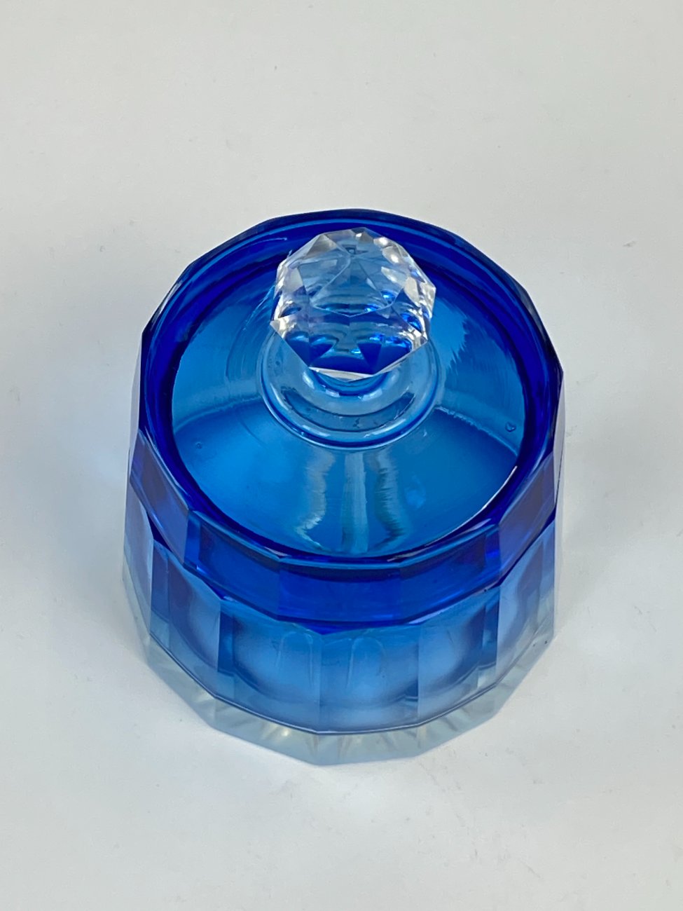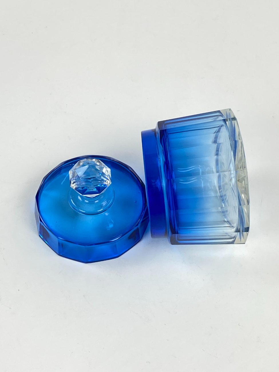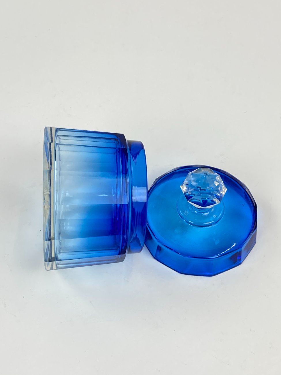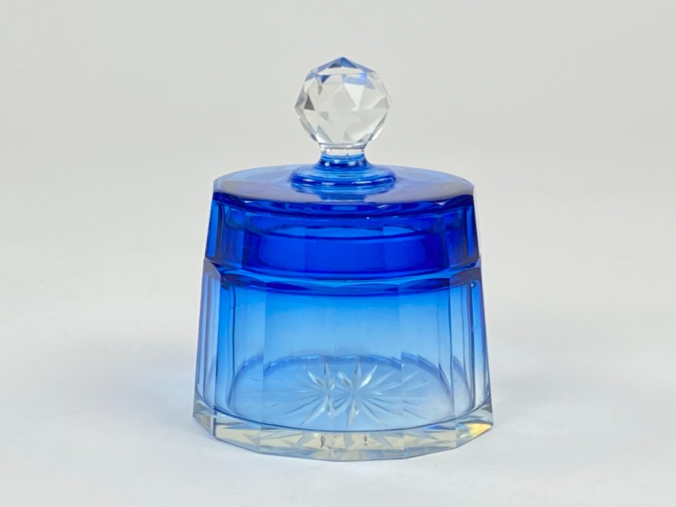 Melsvos spalvos stiklinis kosmetinis indelis su dangteliu.