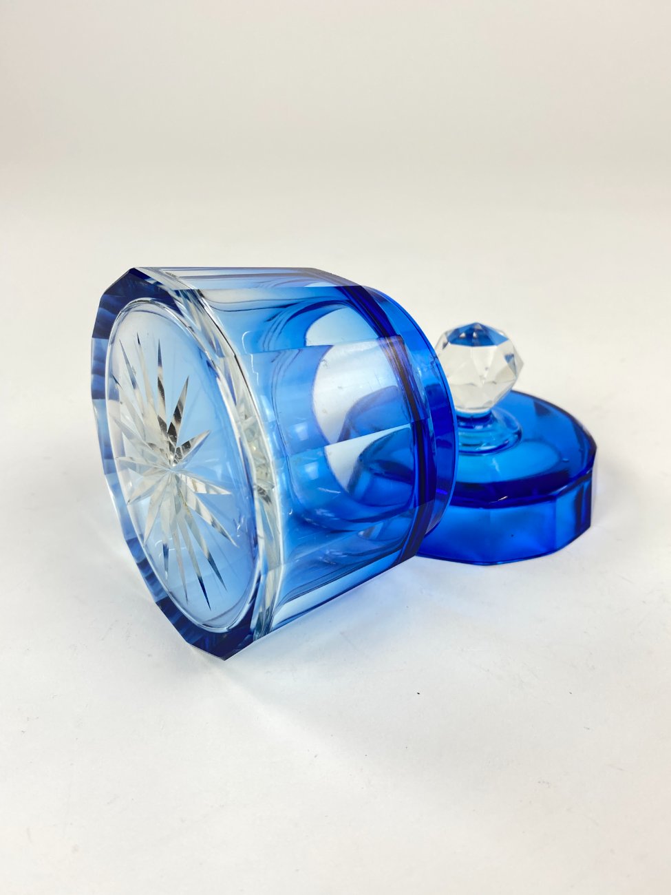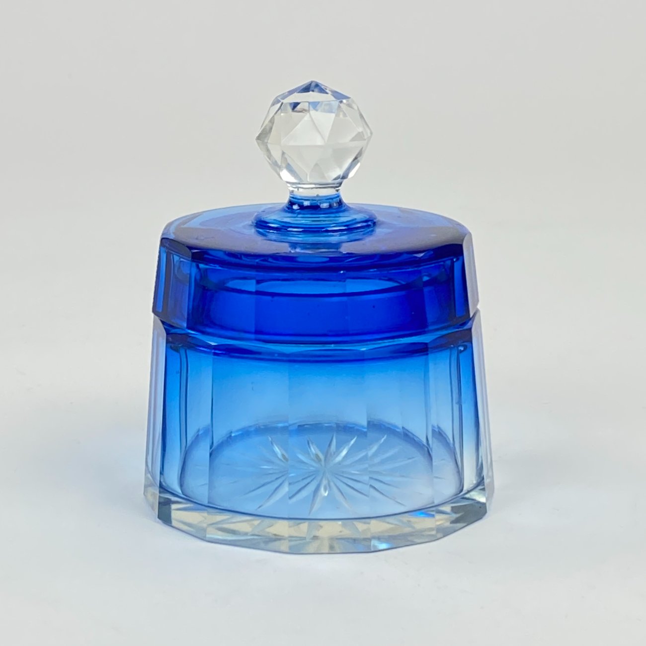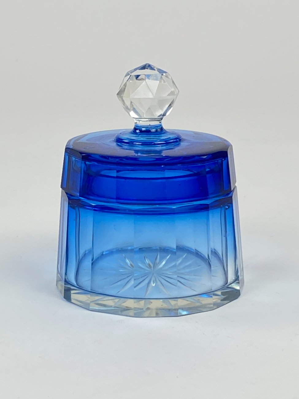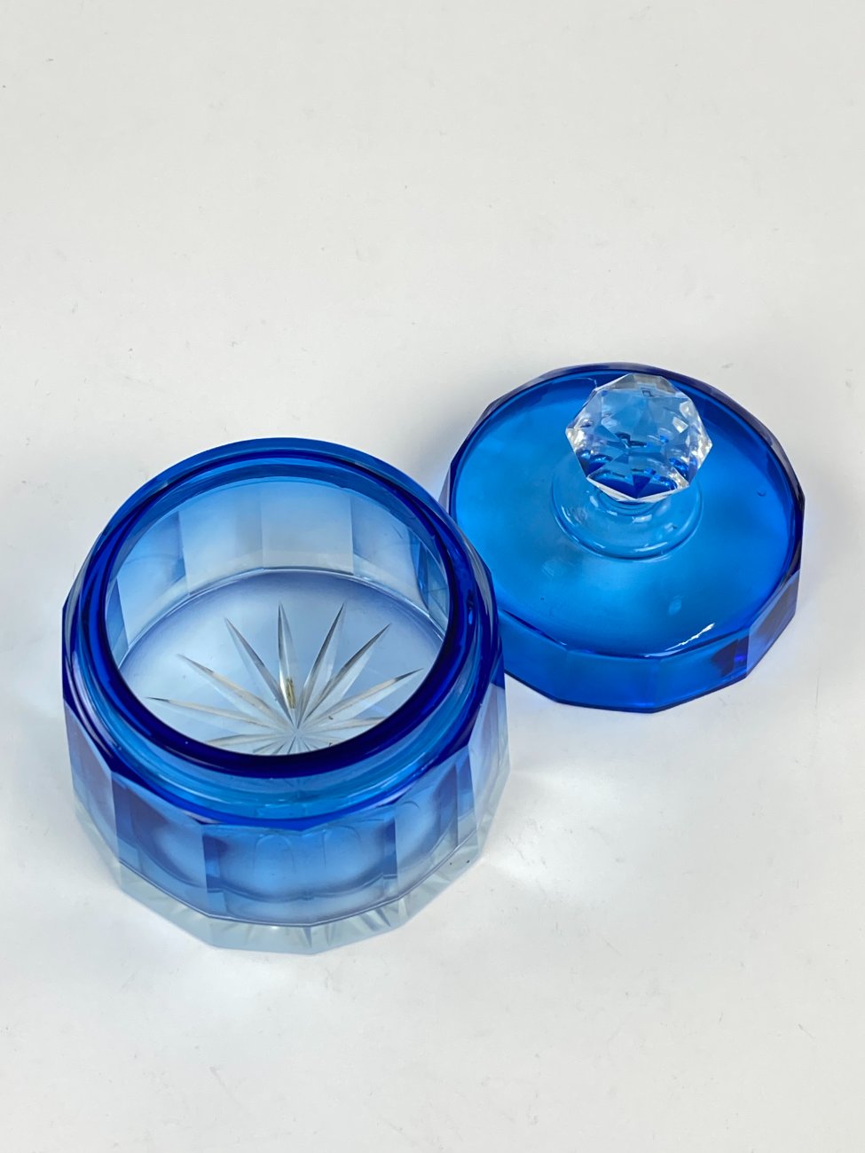 Melsvos spalvos stiklinis kosmetinis indelis su dangteliu.