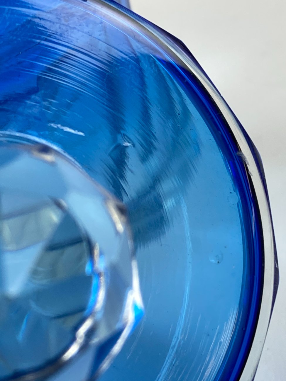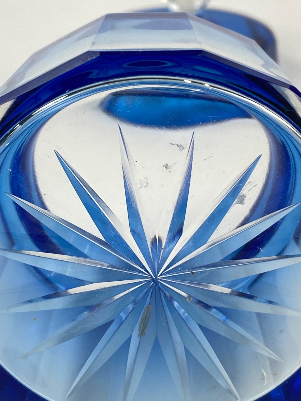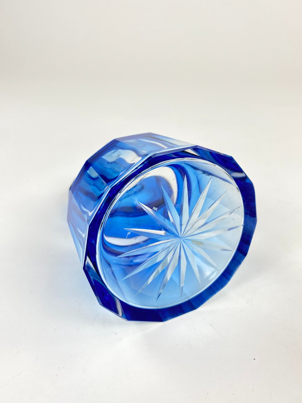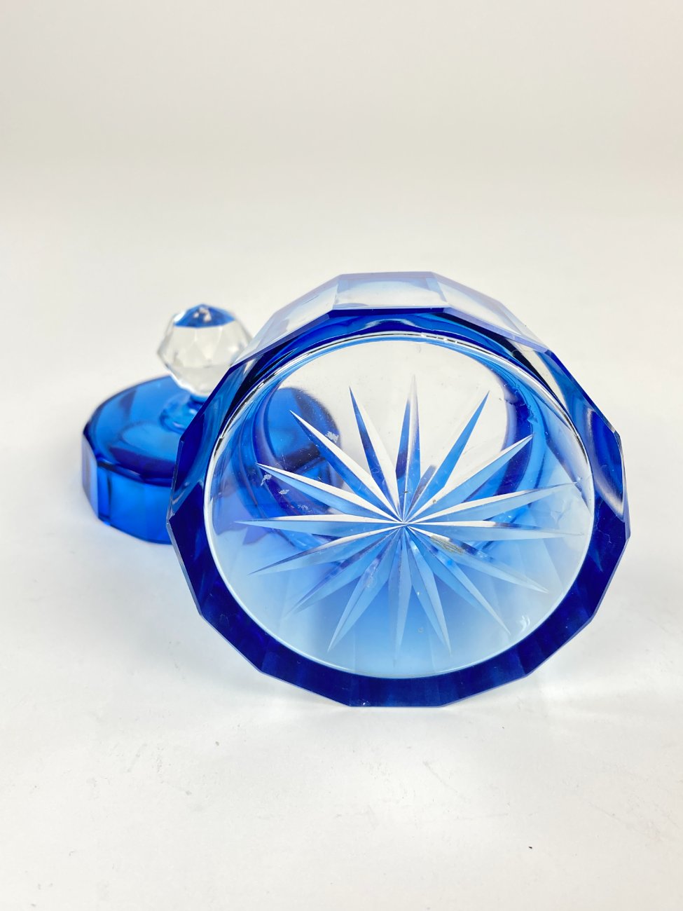 Melsvos spalvos stiklinis kosmetinis indelis su dangteliu.