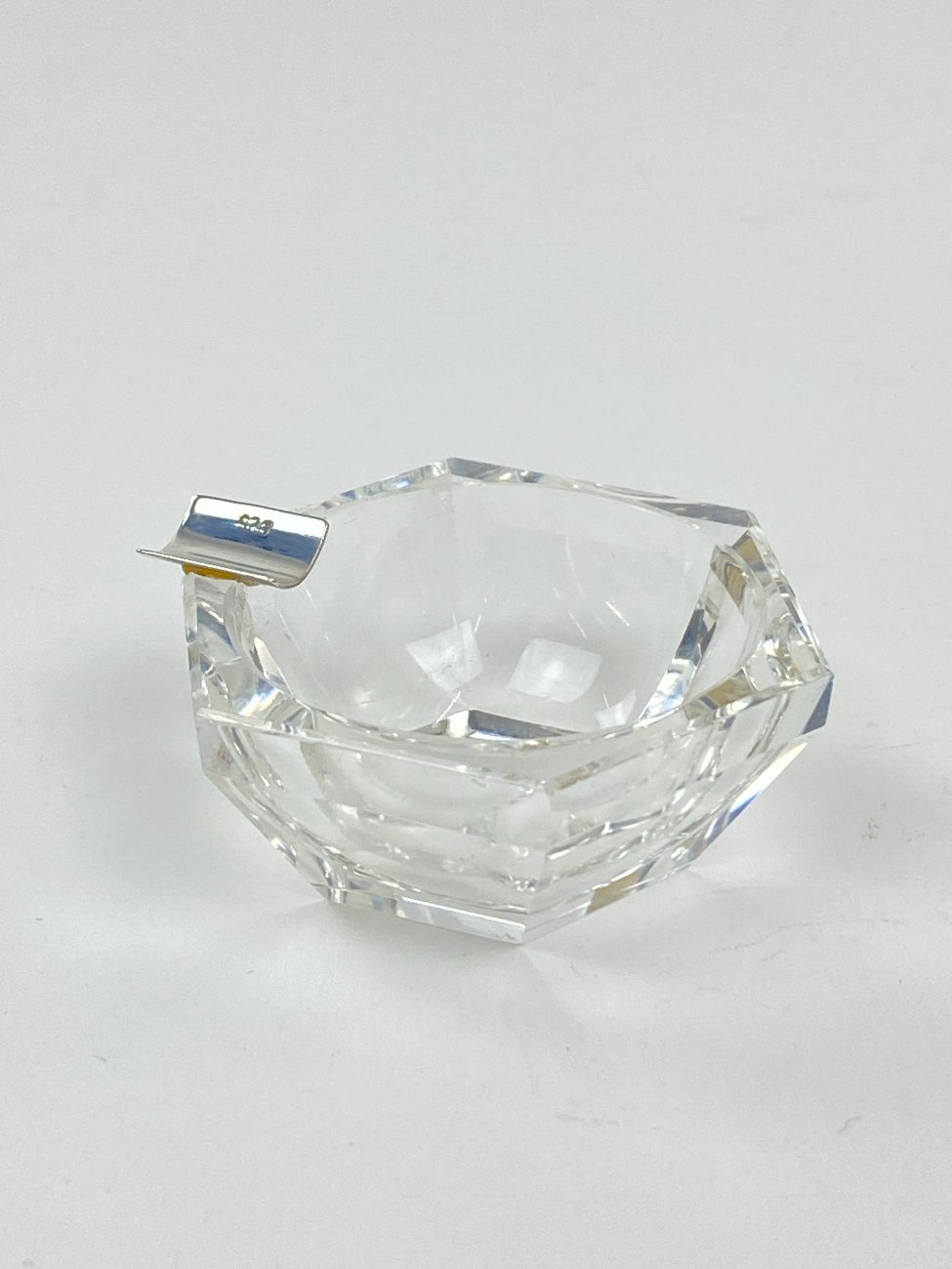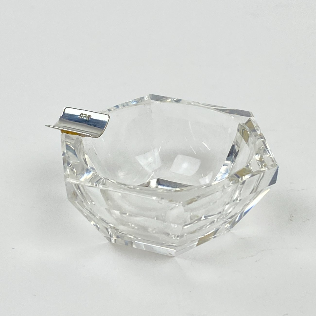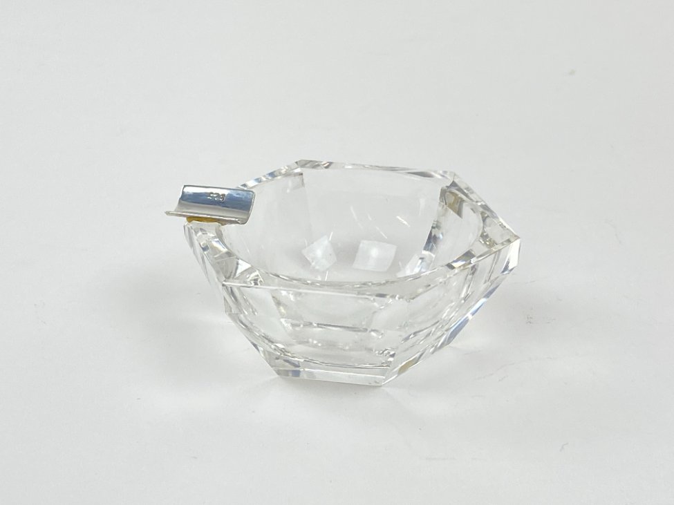 Stiklinė miniatiūrinė peleninė su 925 prabos sidabriniu grioveliu.