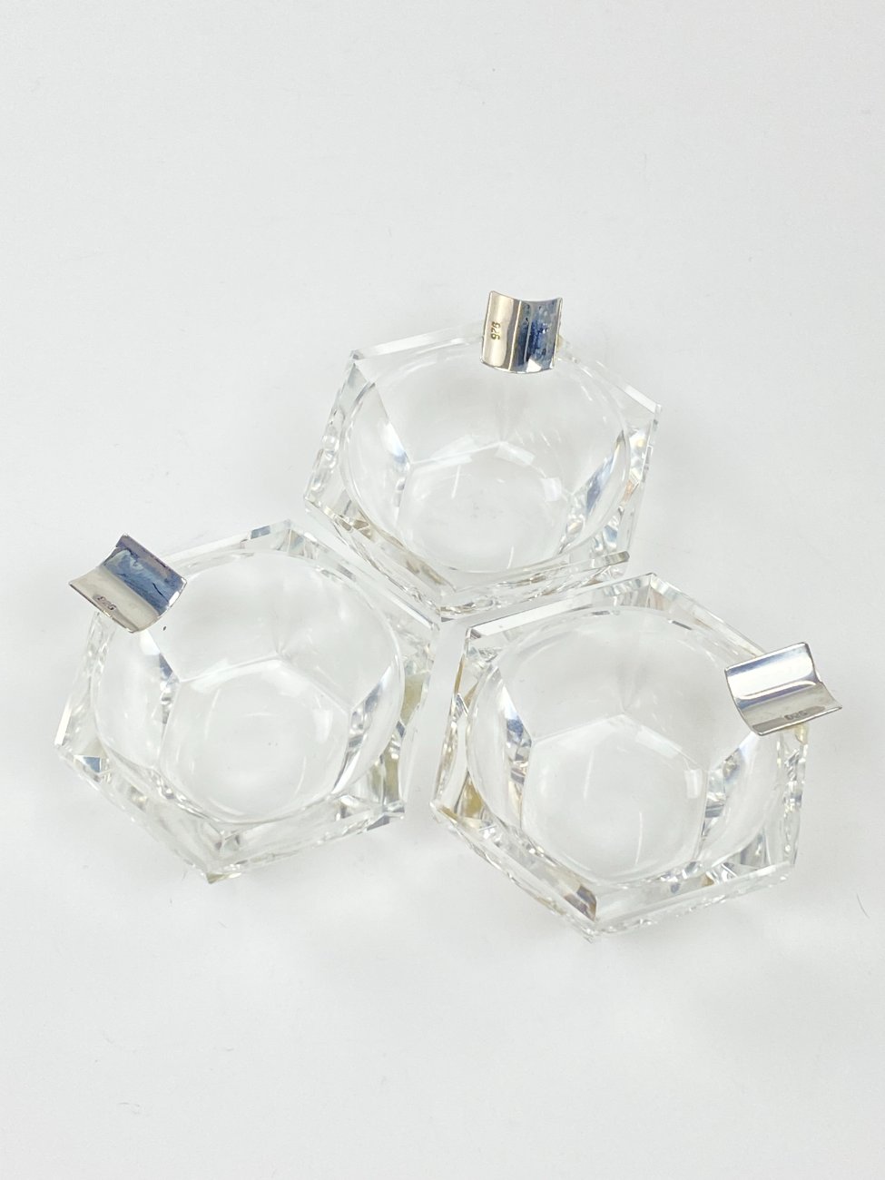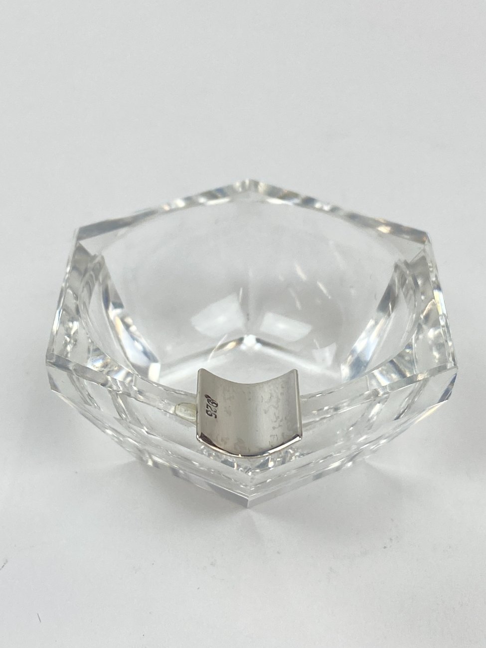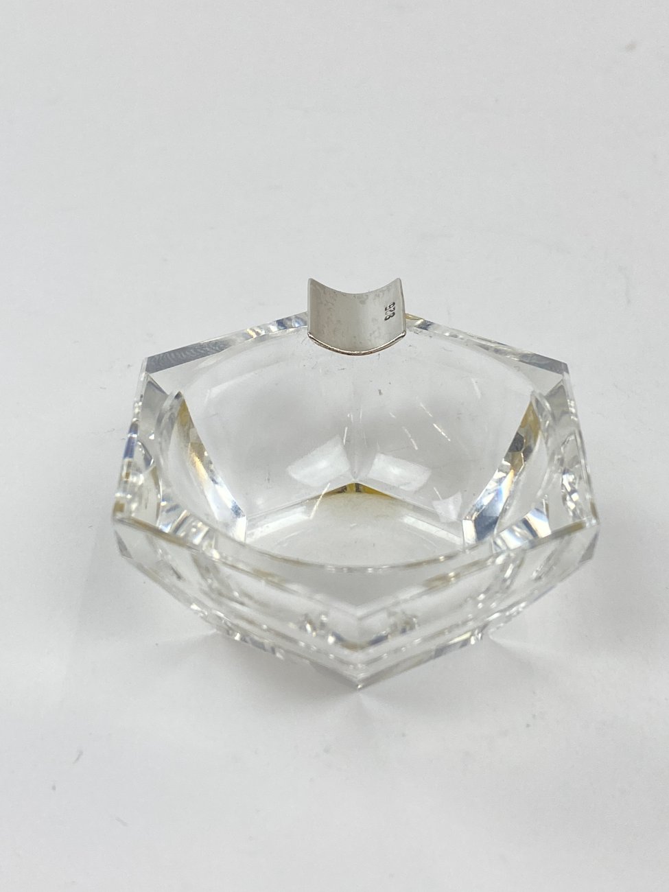 Stiklinė miniatiūrinė peleninė su 925 prabos sidabriniu grioveliu.