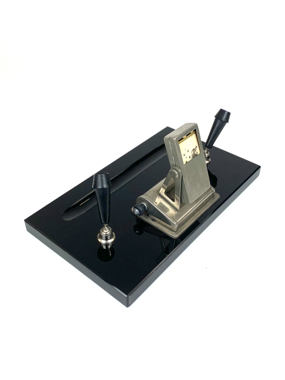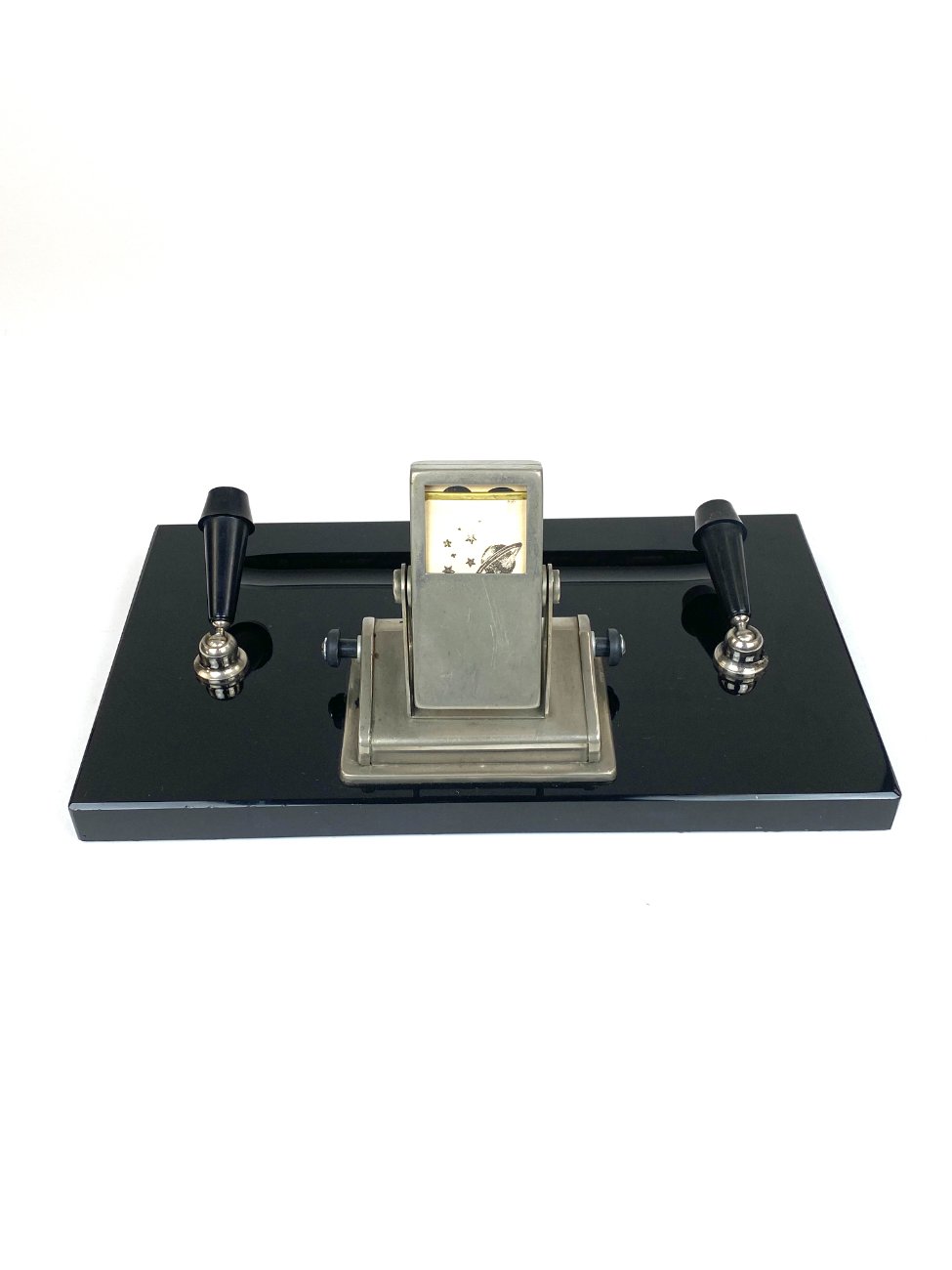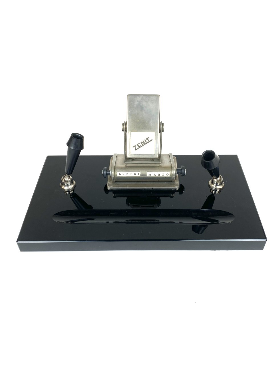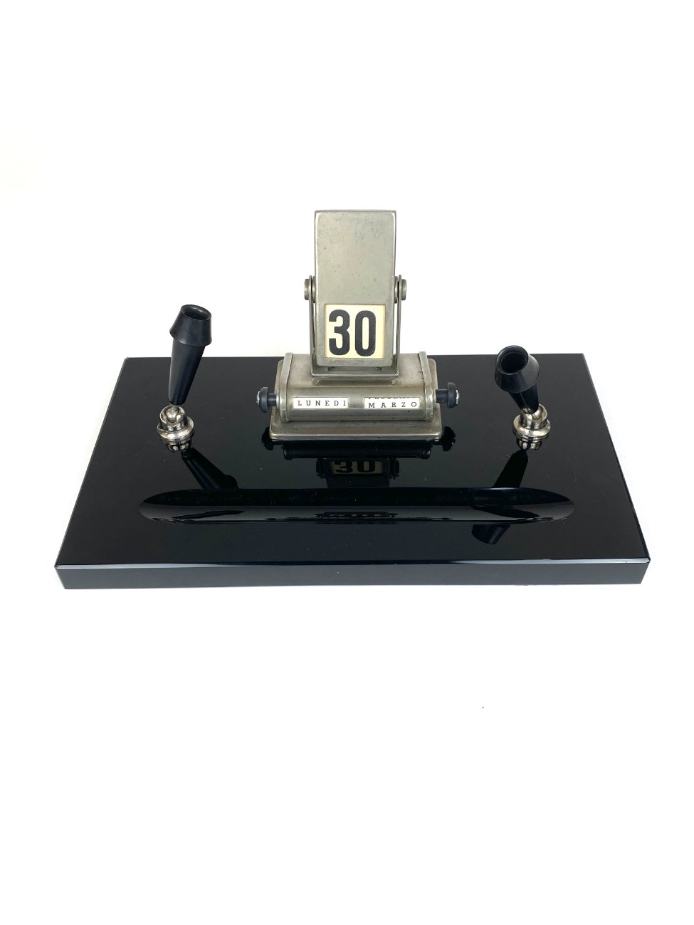 Itališkas vintažinis mechaninis stalinis kalendorius – rašiklių stovas ant akmens pagrindo 18x31x14 cm