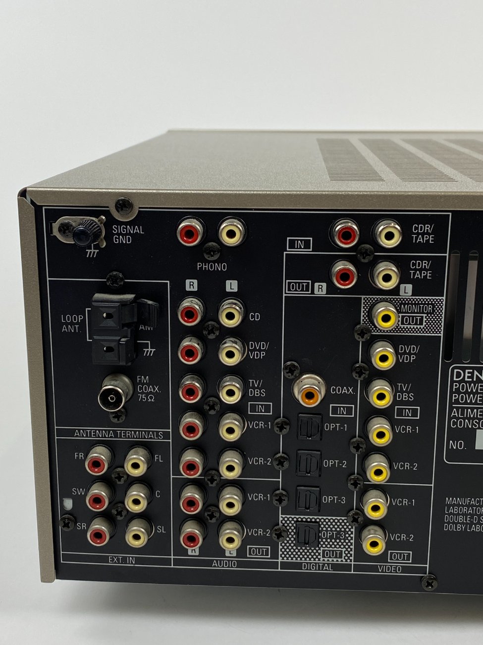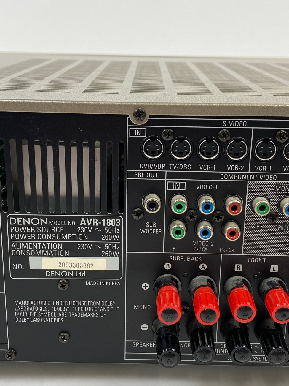 | Papildoma informacija | Ne viskas patikrinta, nes čia surround įrenginys, bet veikia. Tikrinta per Front kanalą: tiuneris veikia, kelis įėjimus patikrinus irgi veikė. Yra išorės pabraižymų., Šis modelis — „AV“ (audio/video) imtuvo stiprintuvas, skirtas namų kino sistemoms. |