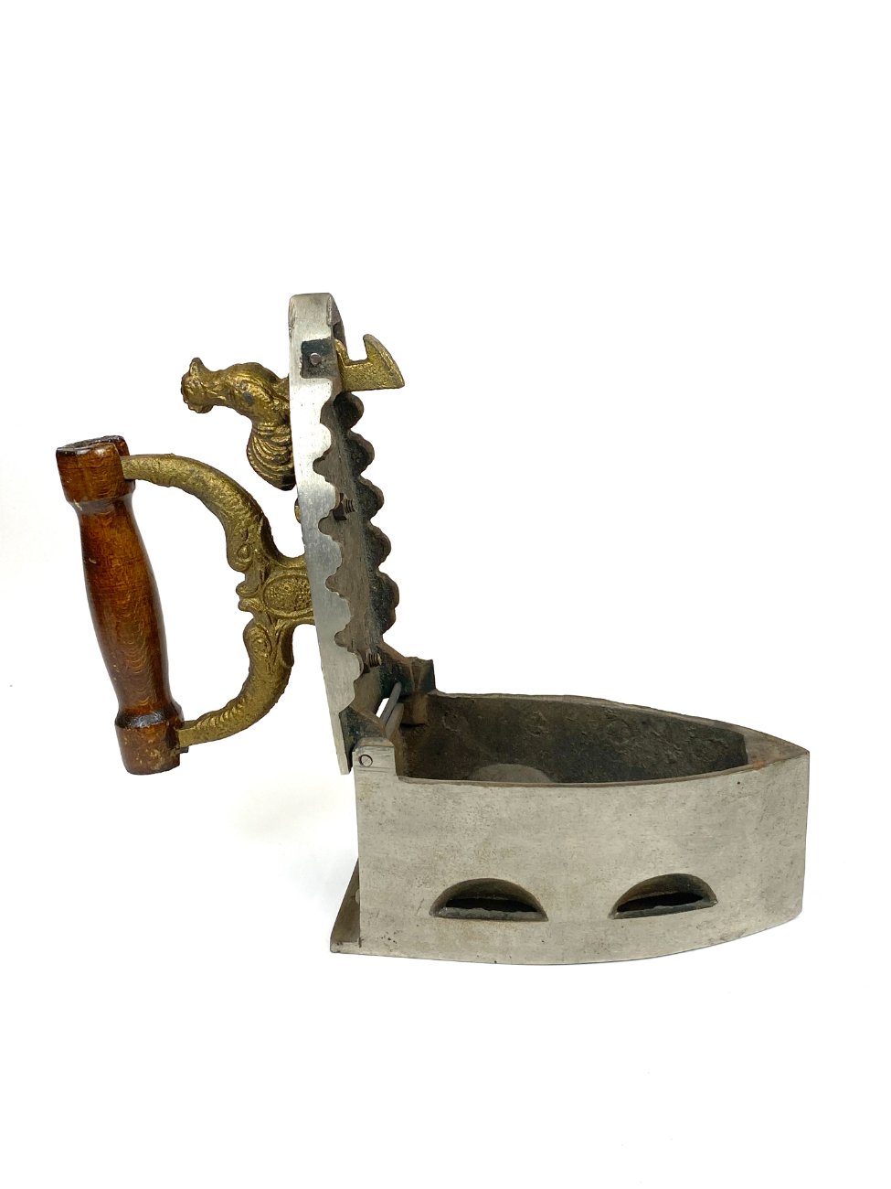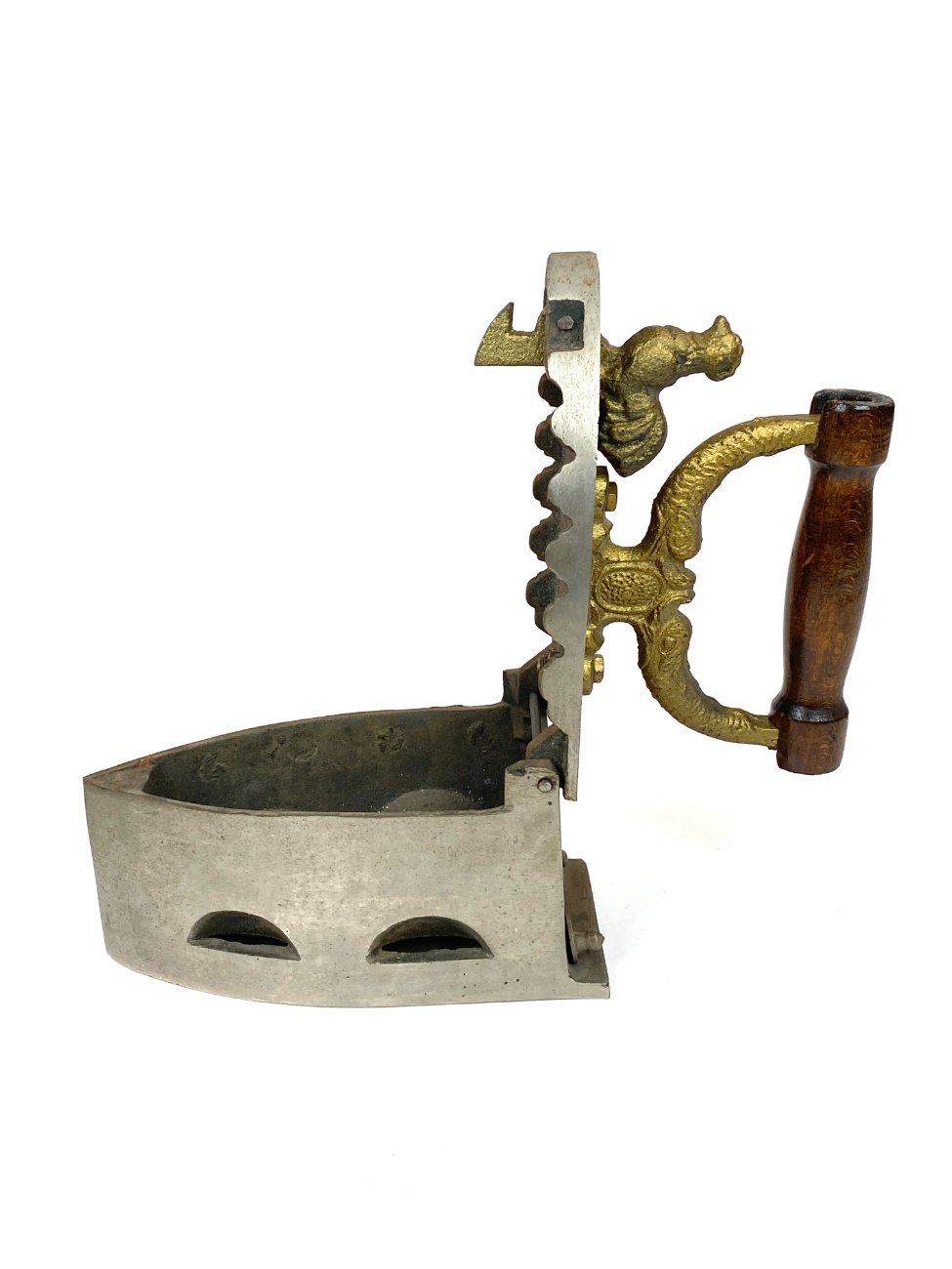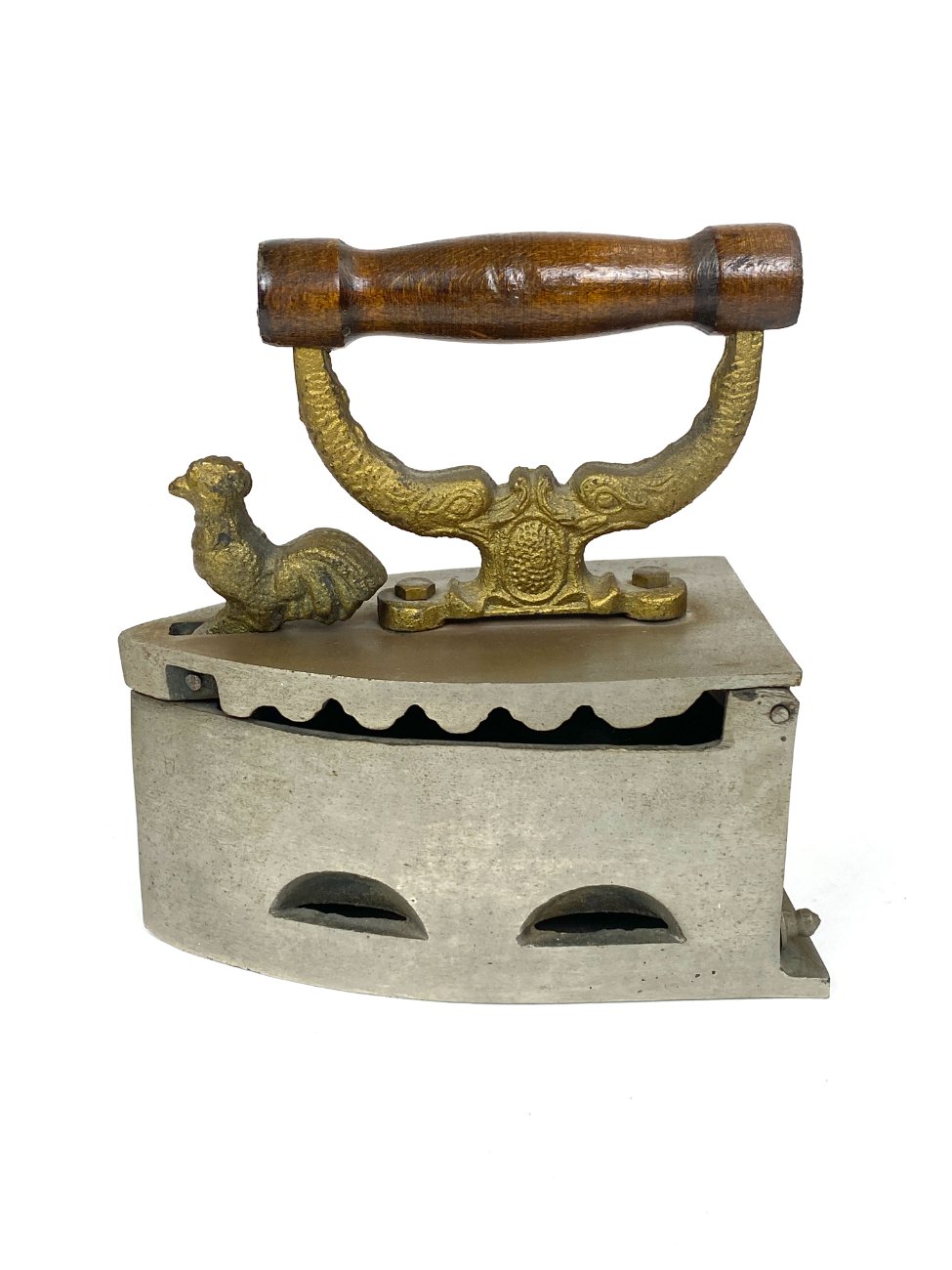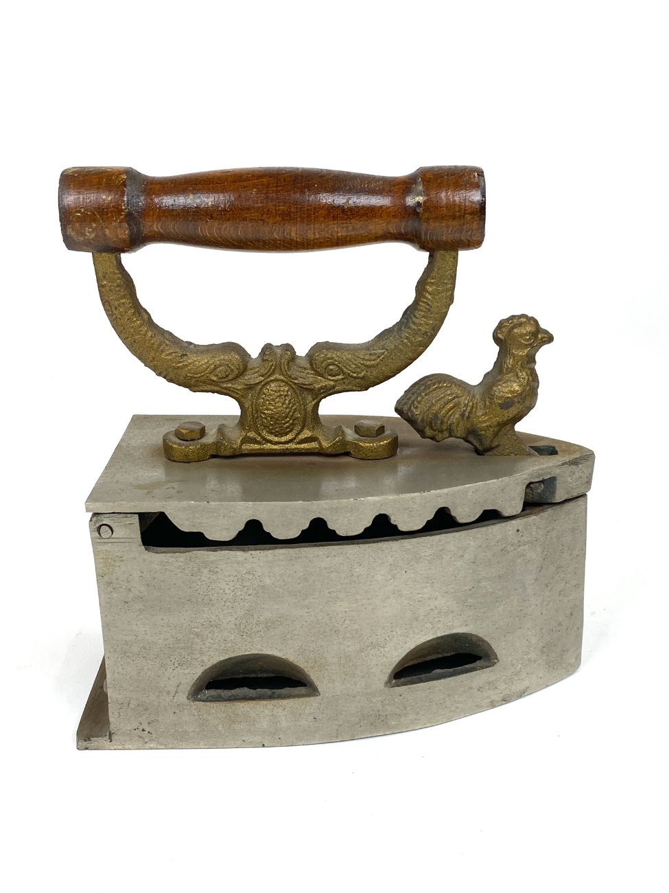 Senovinis metalinis lygintuvas su medine rankena ir gaidžio figūrėle.