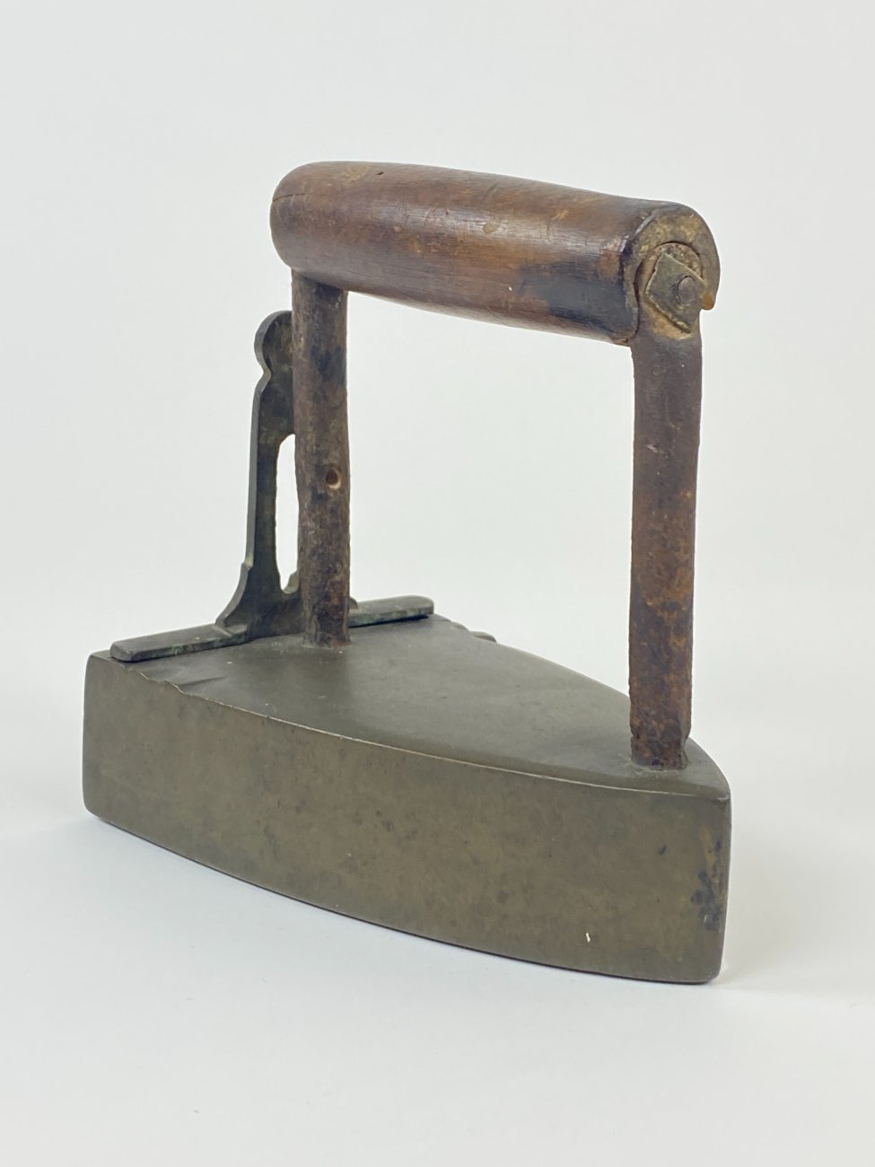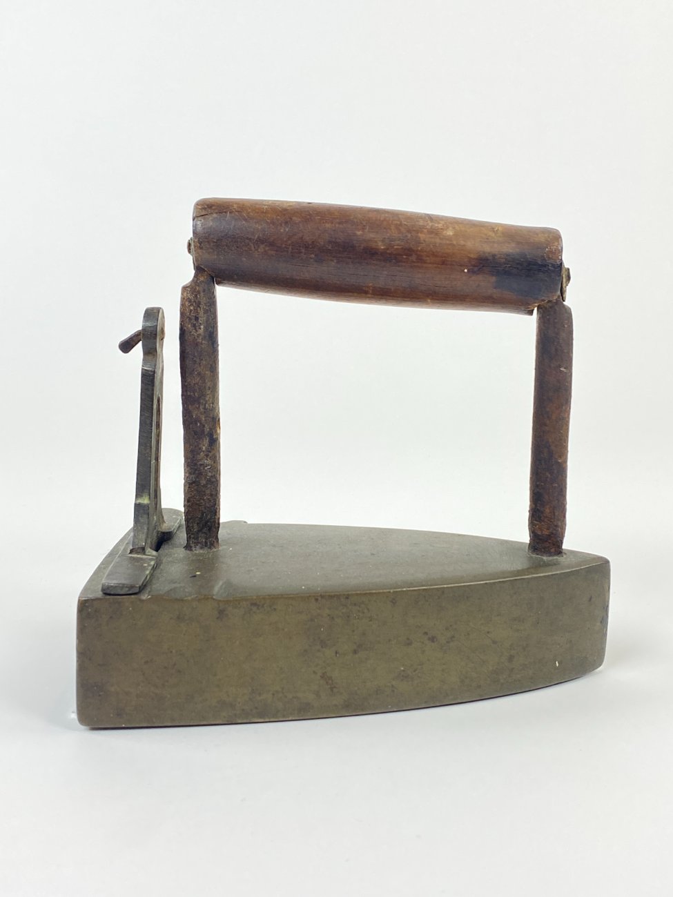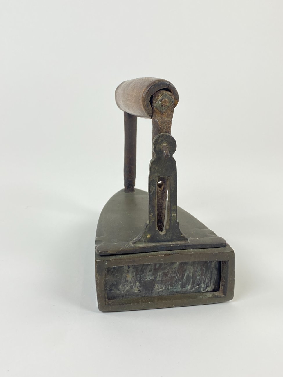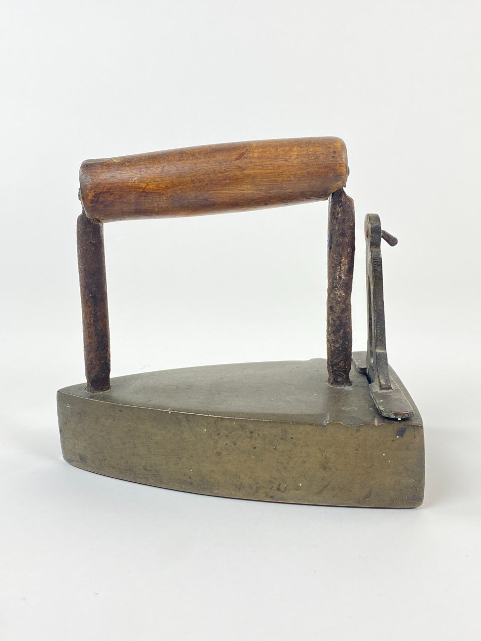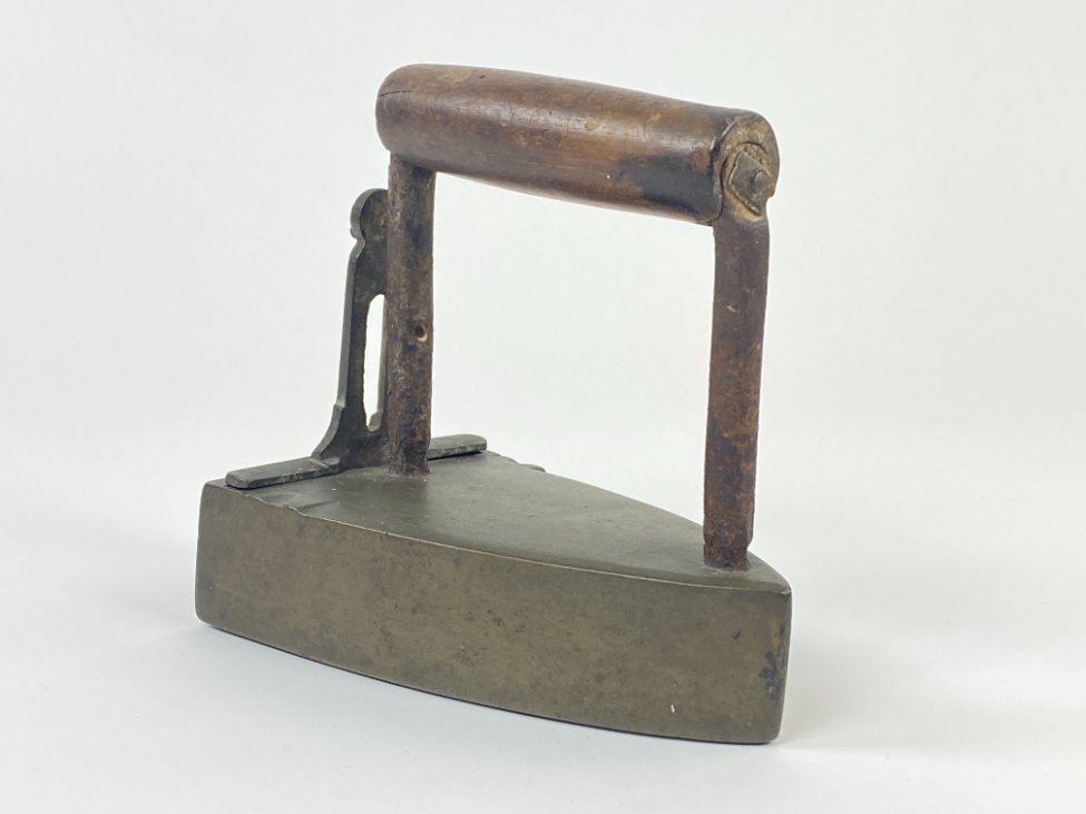 Senovinis žalvario ir metalo lygintuvas medine rankena 16,5x10x16,5 cm