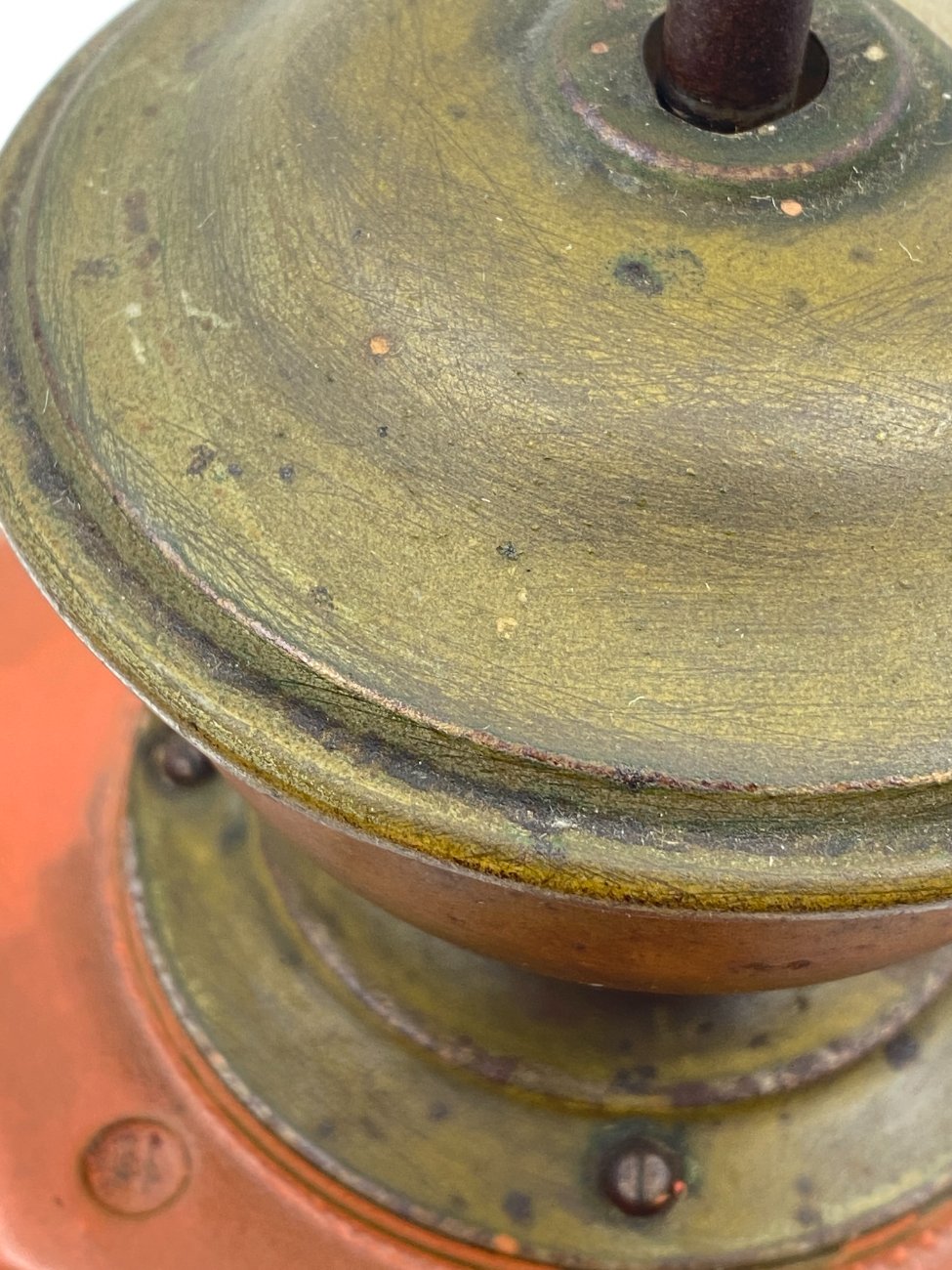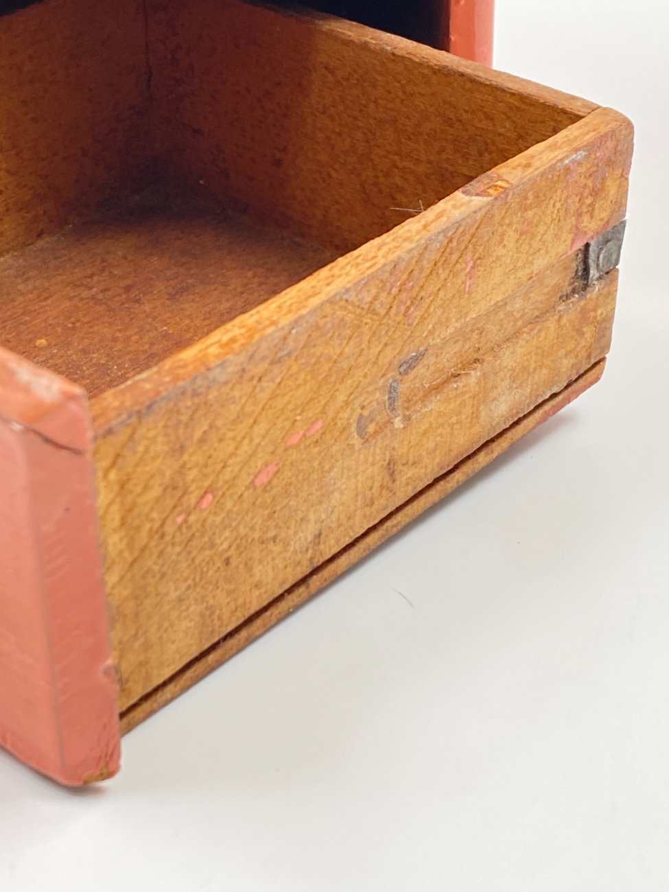 | Papildoma informacija | Suskilęs dugnas, matoma metalo oksidacija. Pilnai neužsidaro viršutinis dangtelis. Stalčiuko dešiniajame šone nulaužta metalinė detalė. Vietomis pakitusi dažų spalva. |